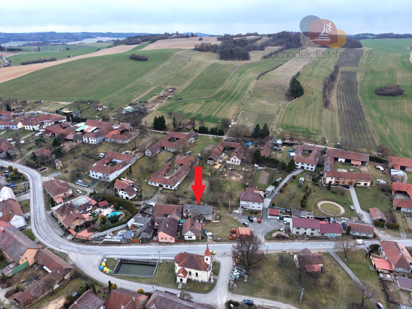Pozemek má 241 m² a leží přímo na návsi, v samotném srdci obce, jen pár kroků od malého kostelíka, který dotváří klidnou atmosféru místa.