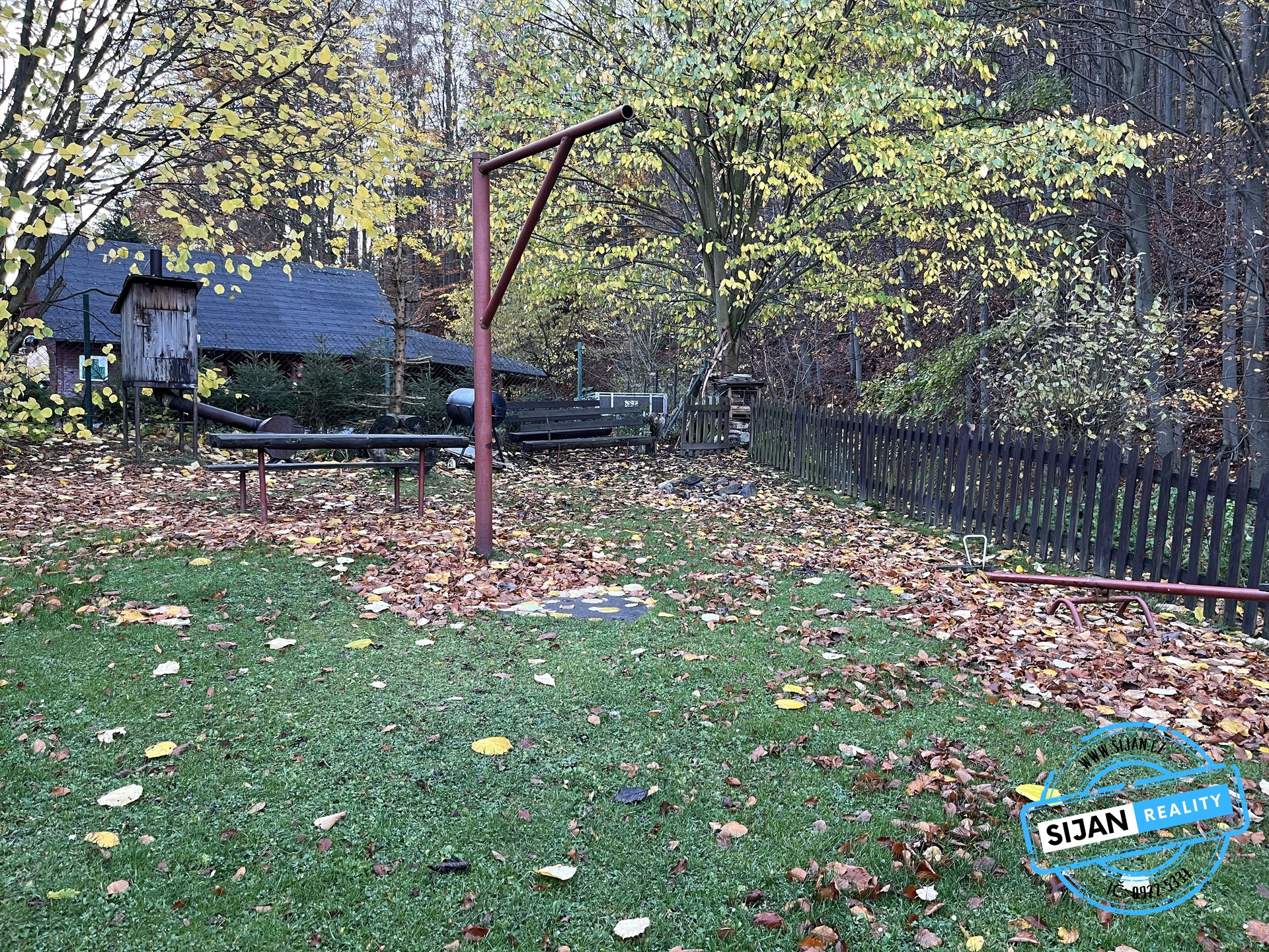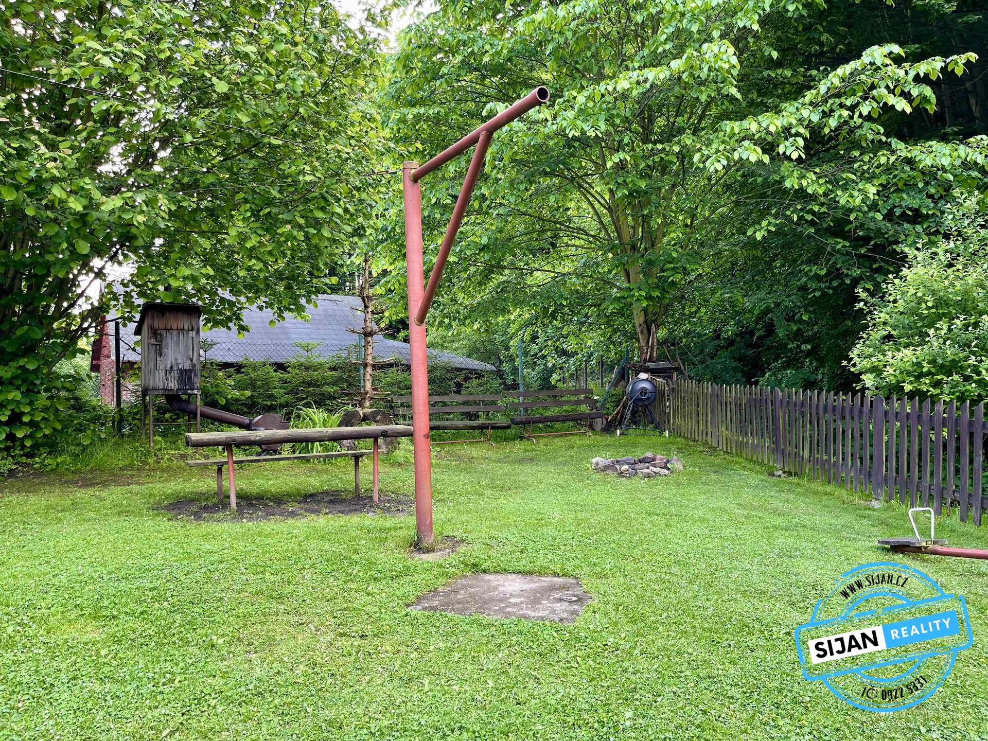 Venkovní prostor nabízí posezení pro 30 osob, dětské hřiště a rozsáhlou zahradu.
