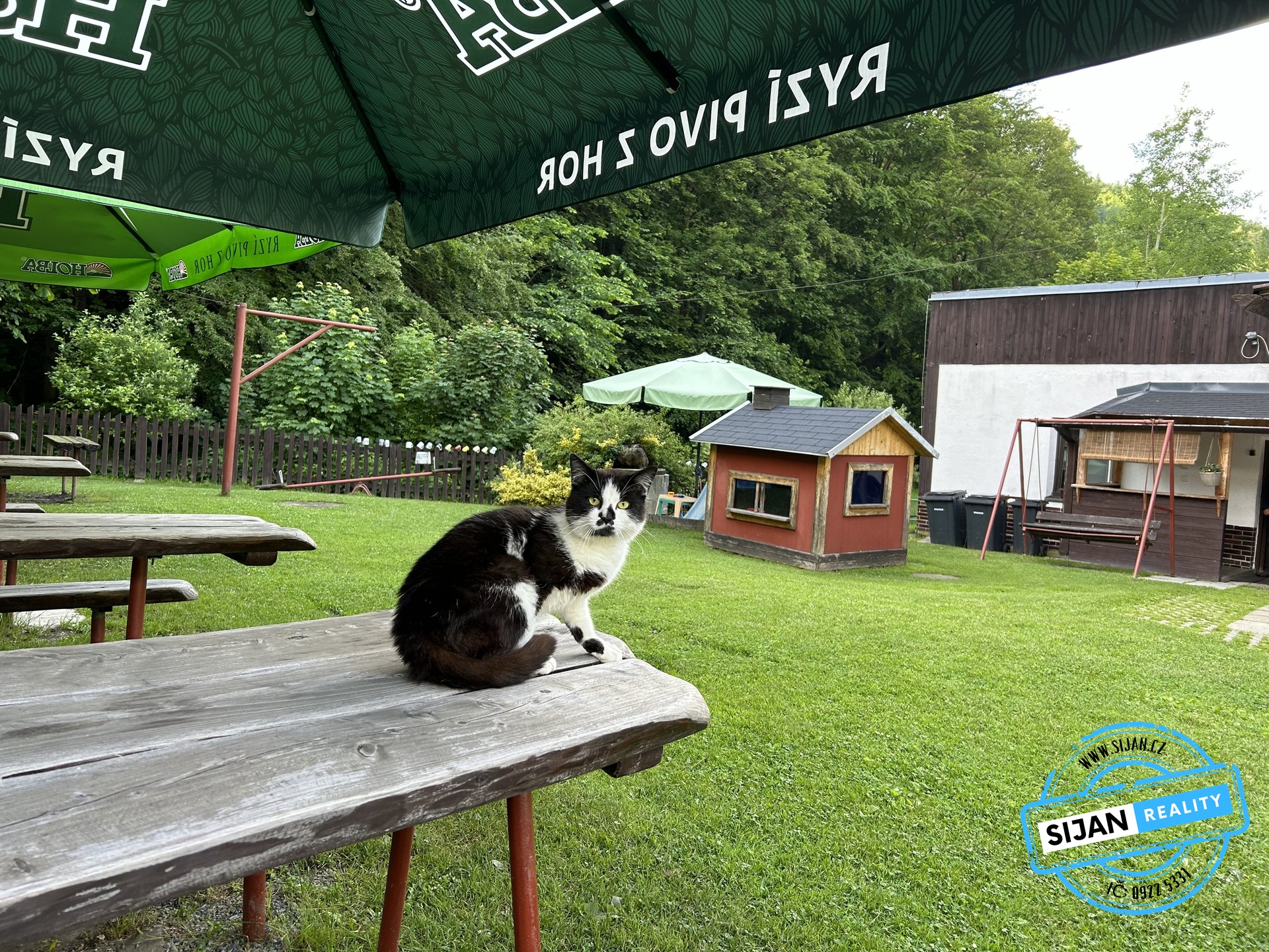 Venkovní prostor nabízí posezení pro 30 osob, dětské hřiště a rozsáhlou zahradu.