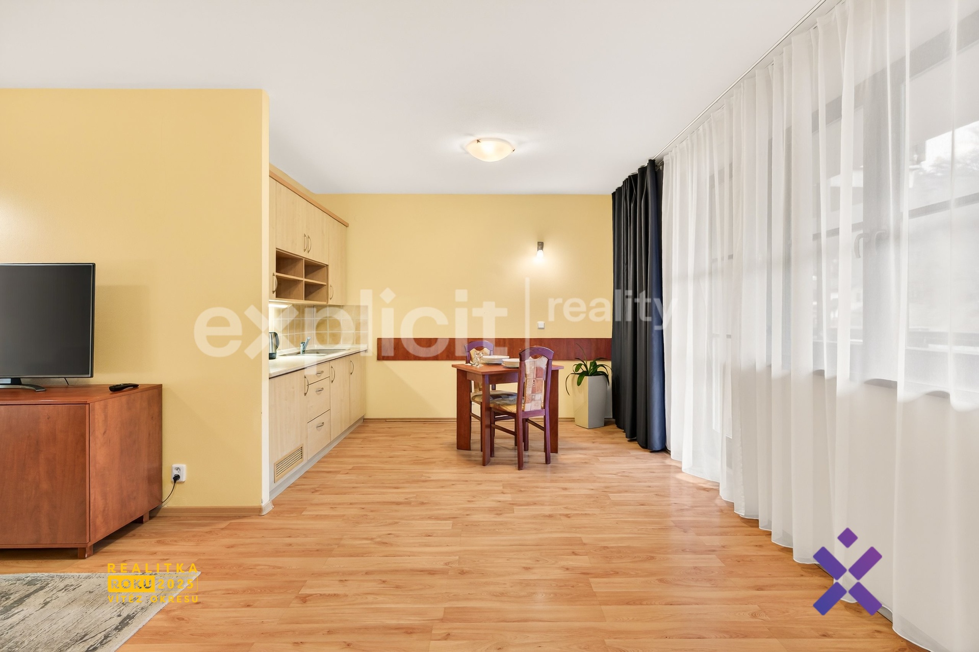 Byt se nachází ve třetím podlaží, které zajišťuje dostatek soukromí a klidné prostředí. Dispozice je řešena prakticky a funkčně. Ze vstupní chodby je přístup do hlavního obytného prostoru s kuchyňským koutem i do samostatné ložnice. Orientace na jihozápad přináší příjemné světelné podmínky po většinu dne.