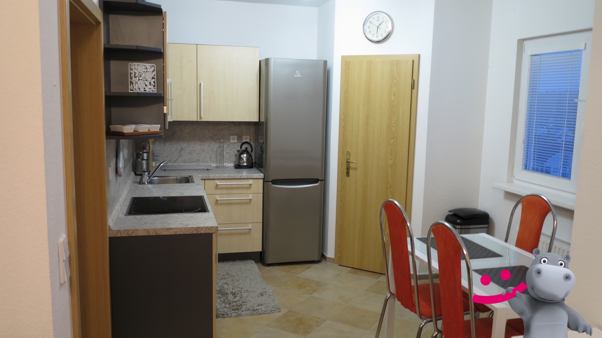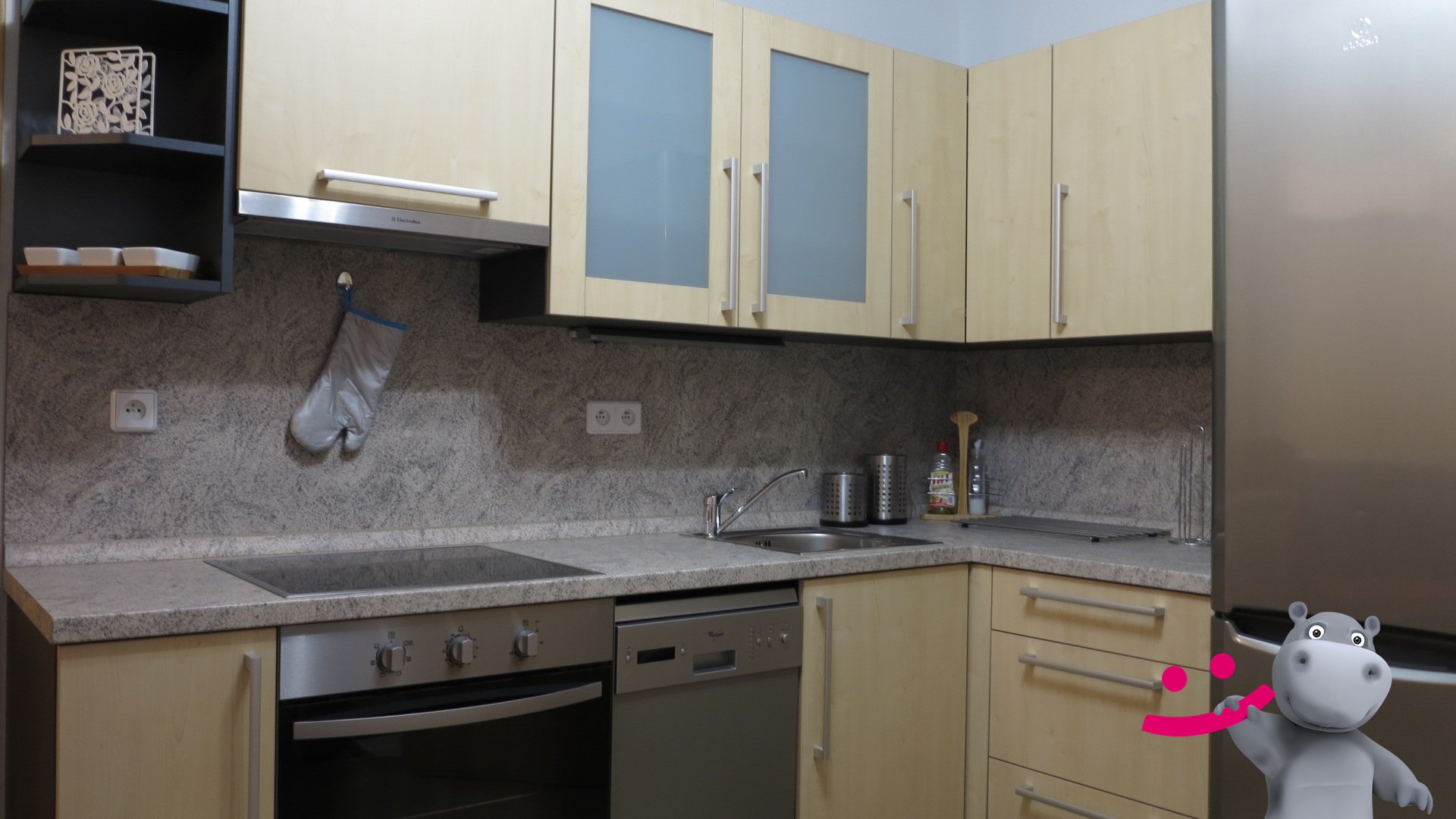 Byt se pronajímá včetně zařízení: kuchyň včetně spotřebičů (lednička, myčka, trouba a sklokeramická deska) a šatní skříň.