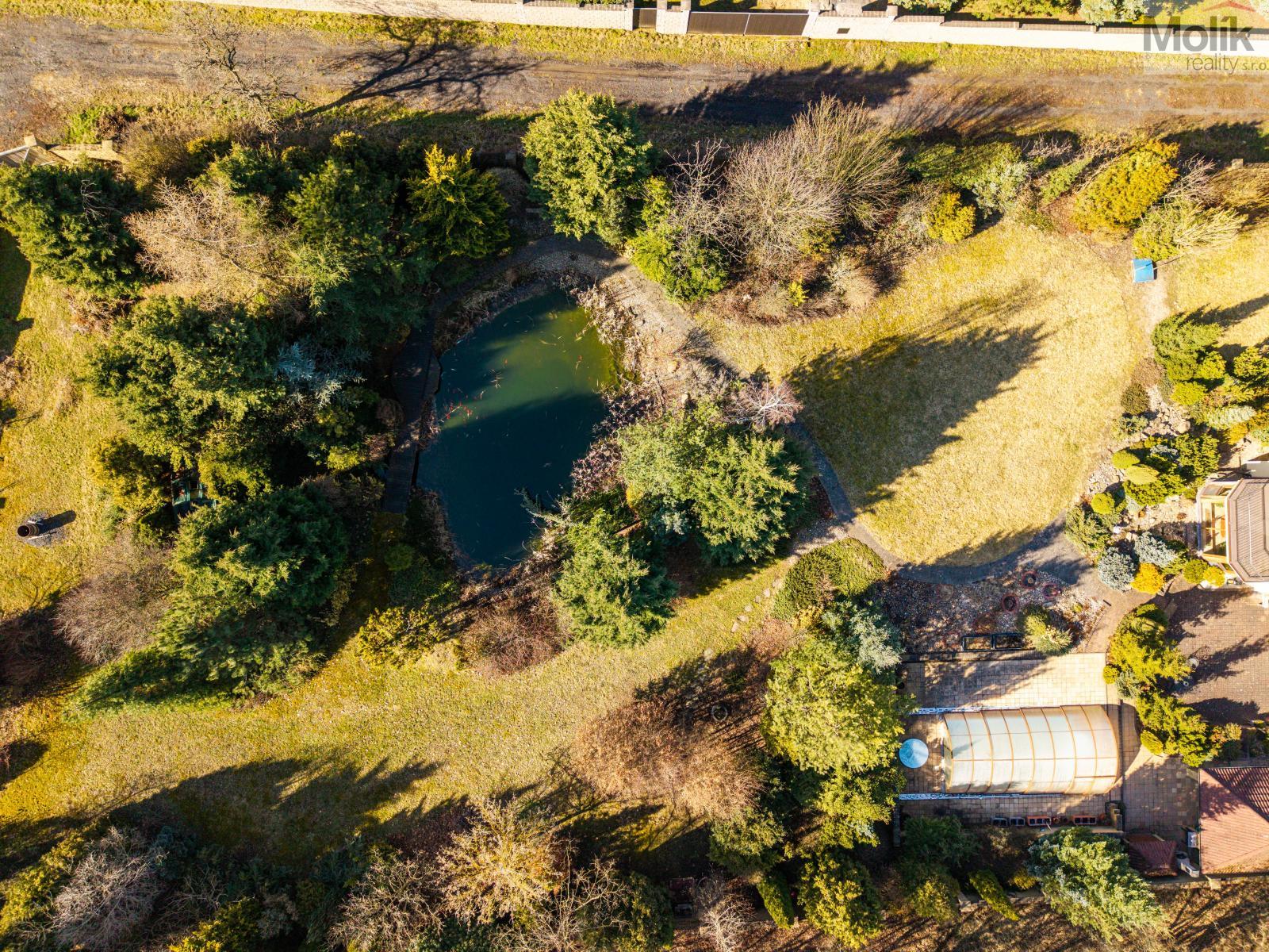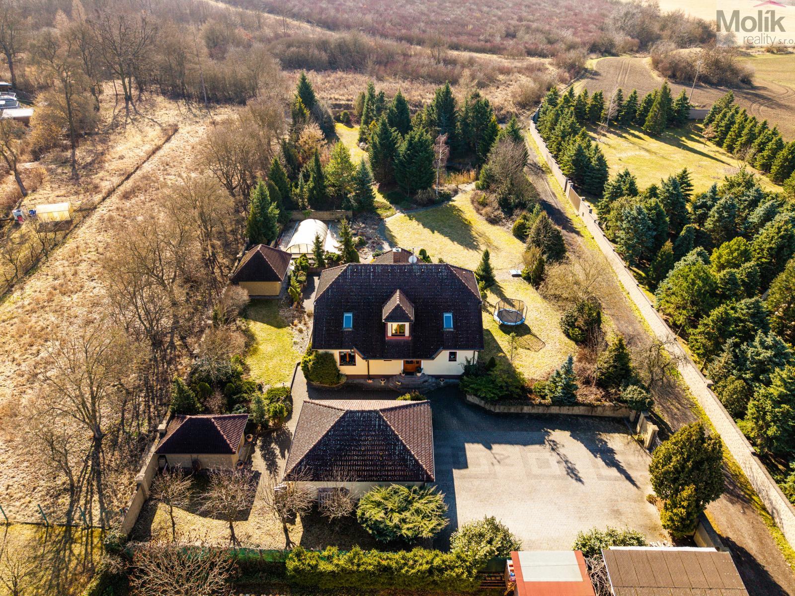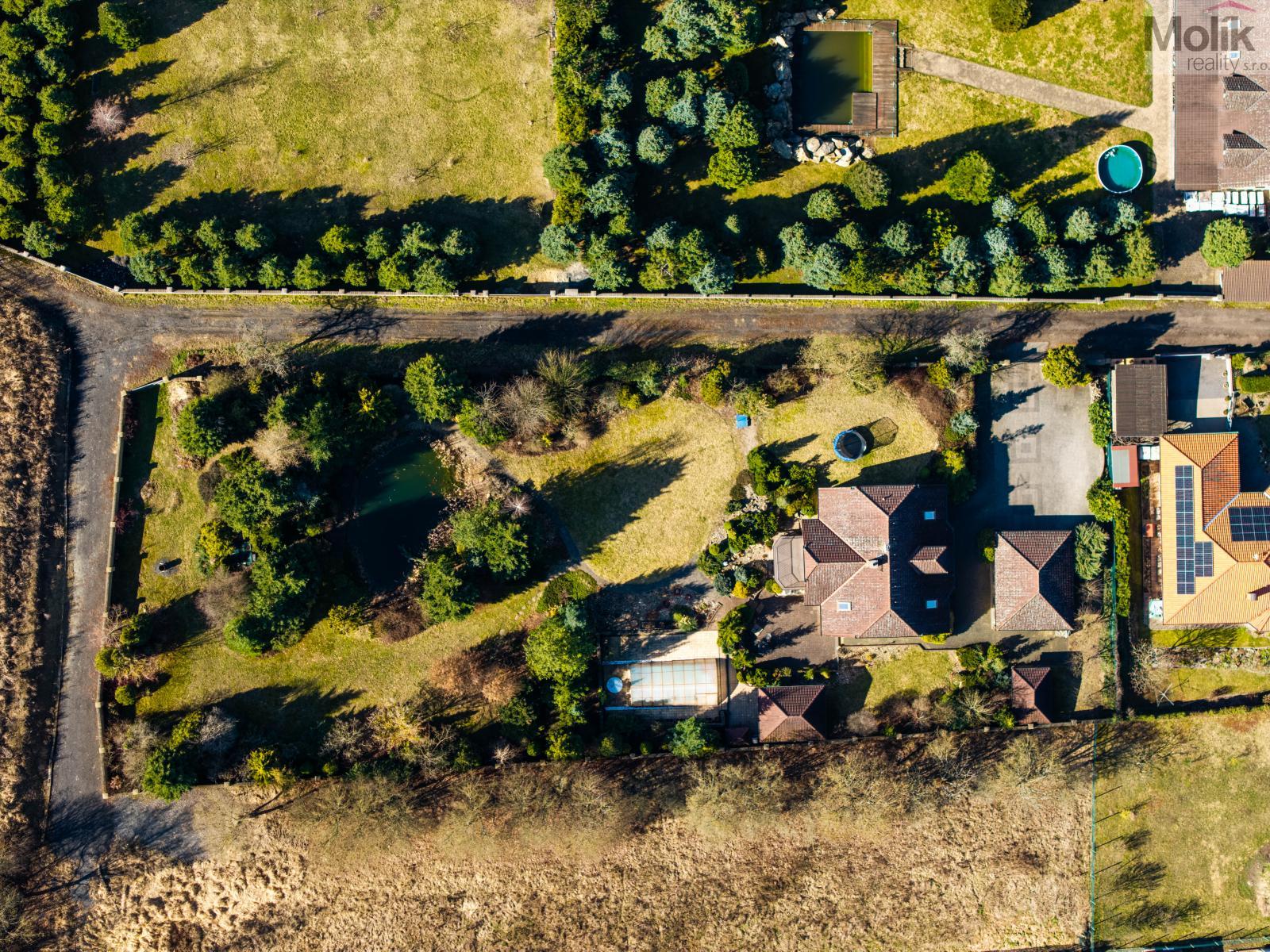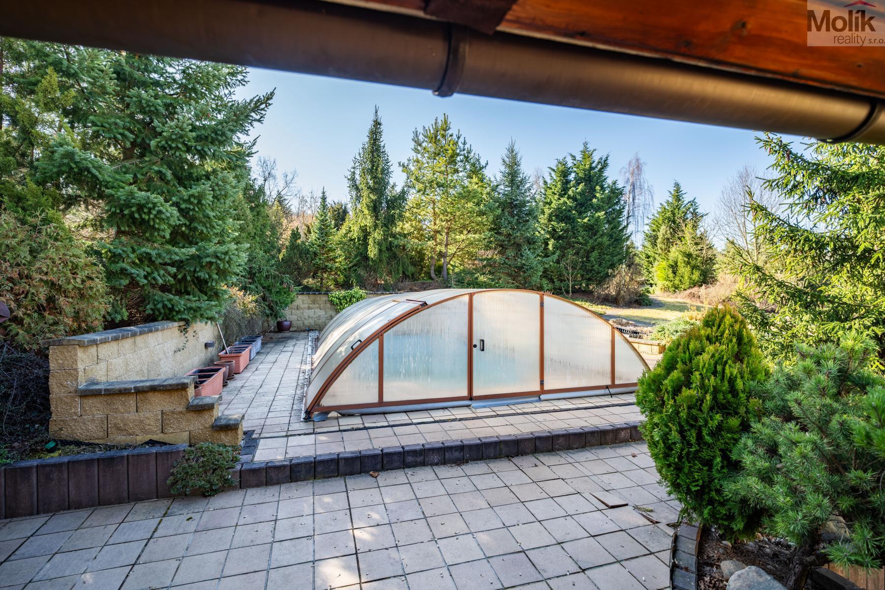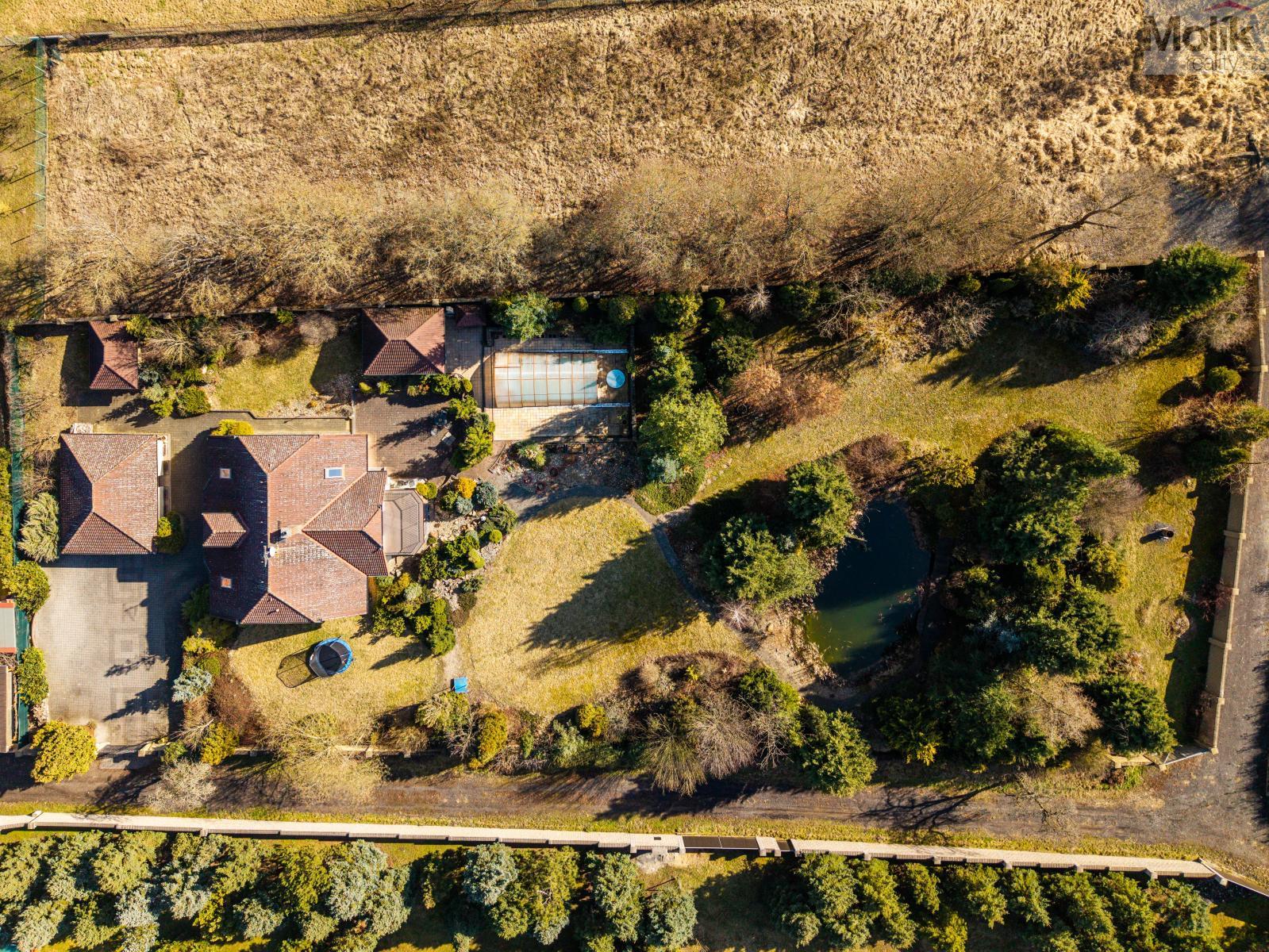 Patro domu nabízí čtyři prostorné pokoje a hlavní koupelnu s plně funkční saunou. Praktickou stránku bydlení doplňuje garáž s elektrickými vraty. Dominantou celého sídla je však jeho exteriér. Na rozlehlém pozemku, který díky své ploše přes 3 500 m and sup2; poskytuje maximální soukromí, se nachází vzrostlé jehličnany, borovice i plodící jabloně. Zahrada nabízí krytý bazén s filtrací, jezírko s vlastním čistícím systémem a splachem, a také prostorný altán s grilem pro společné chvíle. Součástí pozemku je také praktický zahradní domek na techniku. Velkou výhodou jsou dva samostatné vjezdy: jeden vede k domu a garáži, druhý zajišťuje pohodlný přístup přímo na plochu zahrady. Nemovitost se nachází v chráněné krajinné oblasti, což zaručuje bydlení v naprostém klidu a v těsném sepětí s přírodou.