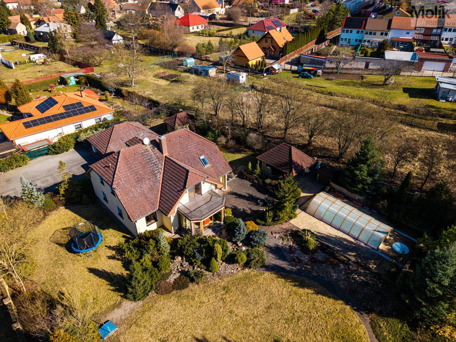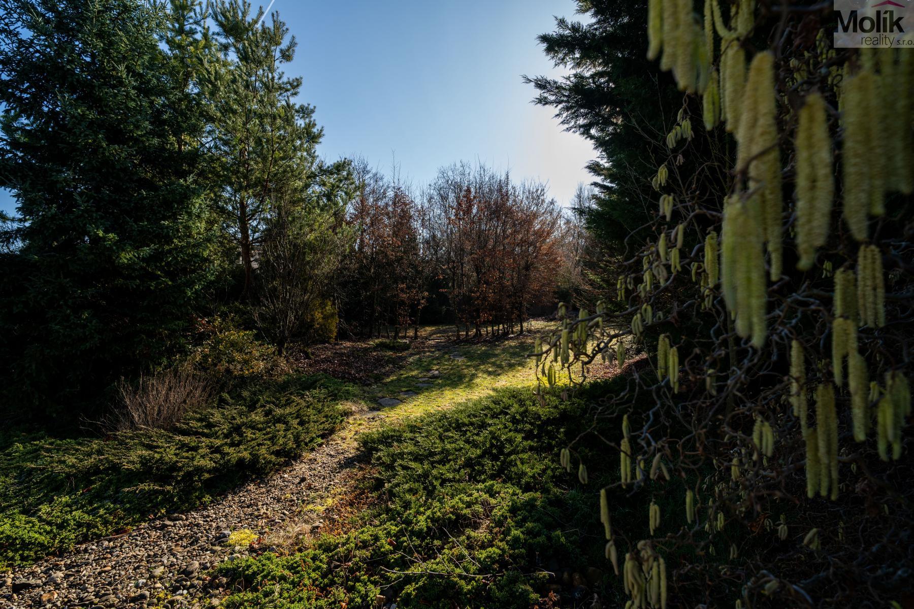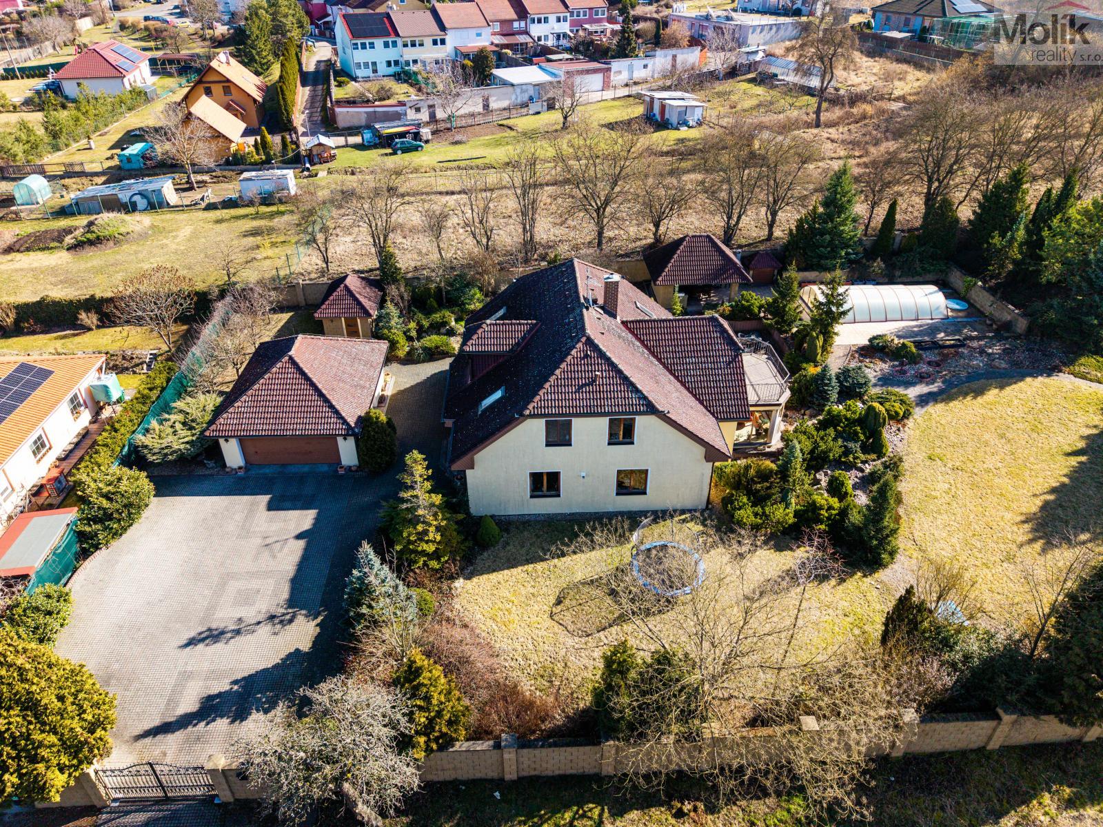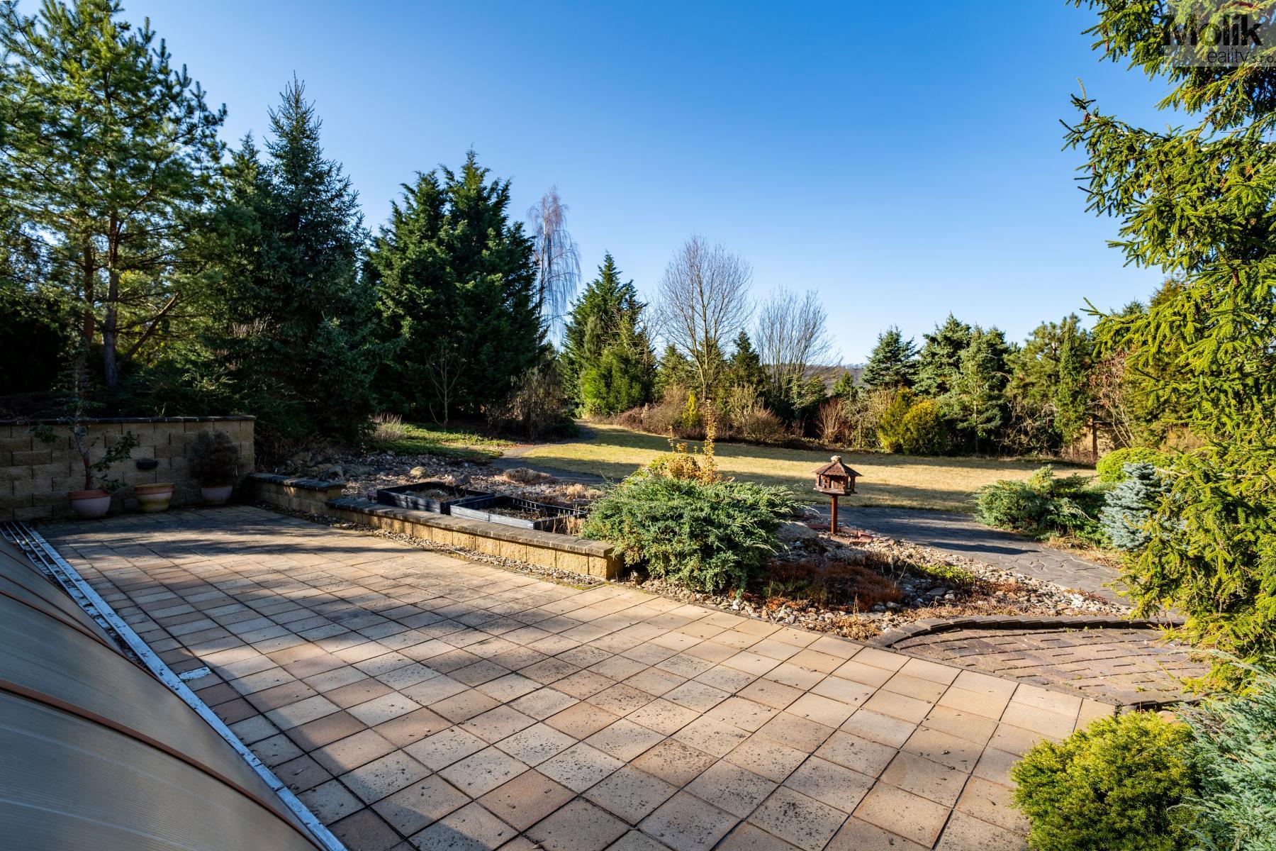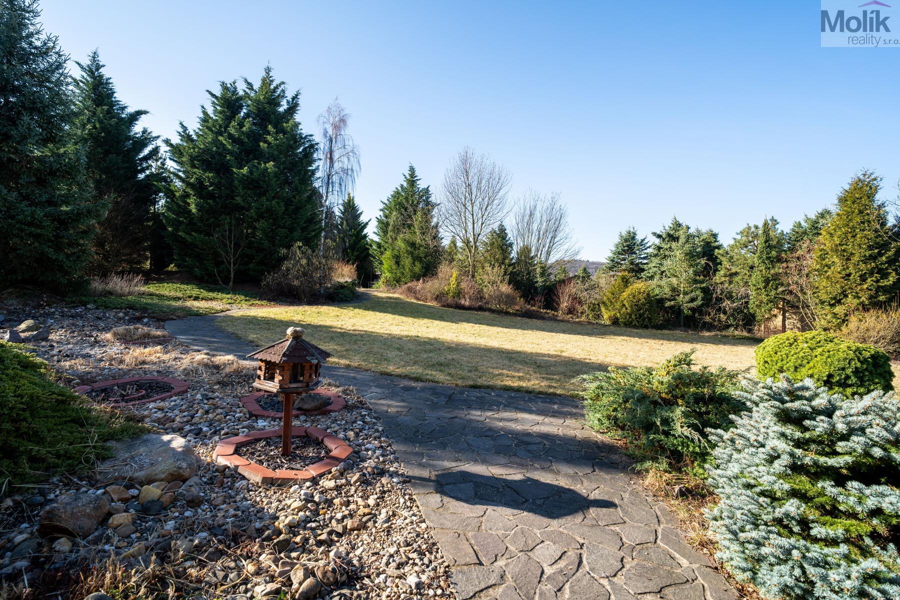 Patro domu nabízí čtyři prostorné pokoje a hlavní koupelnu s plně funkční saunou. Praktickou stránku bydlení doplňuje garáž s elektrickými vraty. Dominantou celého sídla je však jeho exteriér. Na rozlehlém pozemku, který díky své ploše přes 3 500 m and sup2; poskytuje maximální soukromí, se nachází vzrostlé jehličnany, borovice i plodící jabloně. Zahrada nabízí krytý bazén s filtrací, jezírko s vlastním čistícím systémem a splachem, a také prostorný altán s grilem pro společné chvíle. Součástí pozemku je také praktický zahradní domek na techniku. Velkou výhodou jsou dva samostatné vjezdy: jeden vede k domu a garáži, druhý zajišťuje pohodlný přístup přímo na plochu zahrady. Nemovitost se nachází v chráněné krajinné oblasti, což zaručuje bydlení v naprostém klidu a v těsném sepětí s přírodou.