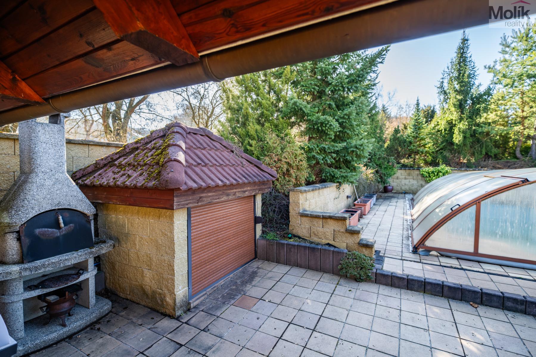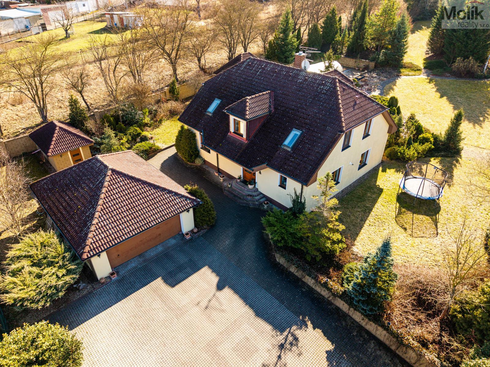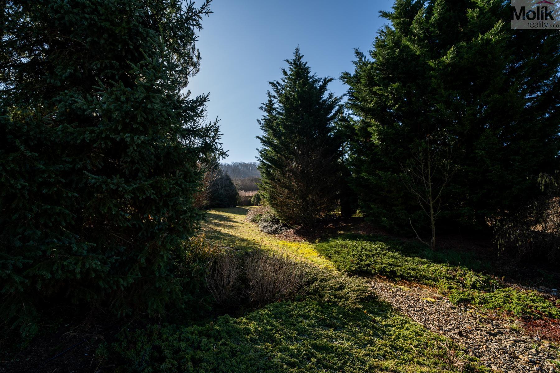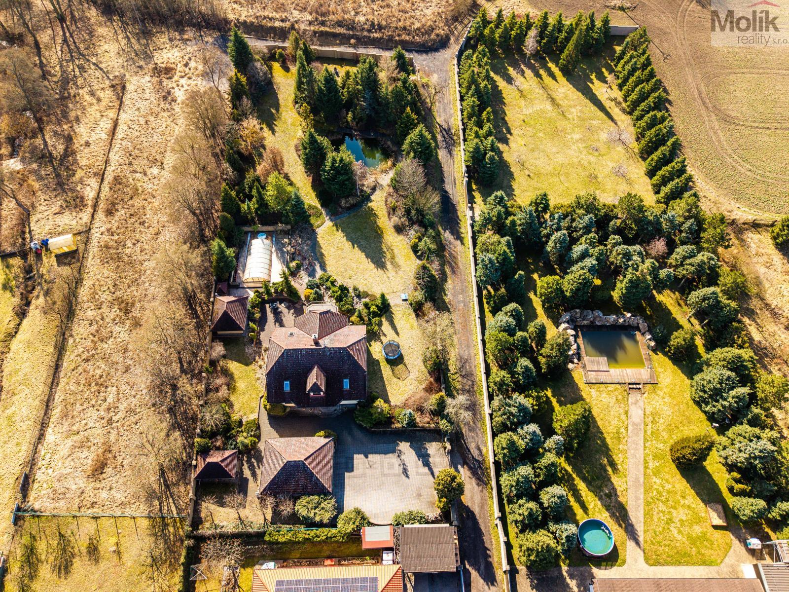 Patro domu nabízí čtyři prostorné pokoje a hlavní koupelnu s plně funkční saunou. Praktickou stránku bydlení doplňuje garáž s elektrickými vraty. Dominantou celého sídla je však jeho exteriér. Na rozlehlém pozemku, který díky své ploše přes 3 500 m and sup2; poskytuje maximální soukromí, se nachází vzrostlé jehličnany, borovice i plodící jabloně. Zahrada nabízí krytý bazén s filtrací, jezírko s vlastním čistícím systémem a splachem, a také prostorný altán s grilem pro společné chvíle. Součástí pozemku je také praktický zahradní domek na techniku. Velkou výhodou jsou dva samostatné vjezdy: jeden vede k domu a garáži, druhý zajišťuje pohodlný přístup přímo na plochu zahrady. Nemovitost se nachází v chráněné krajinné oblasti, což zaručuje bydlení v naprostém klidu a v těsném sepětí s přírodou.