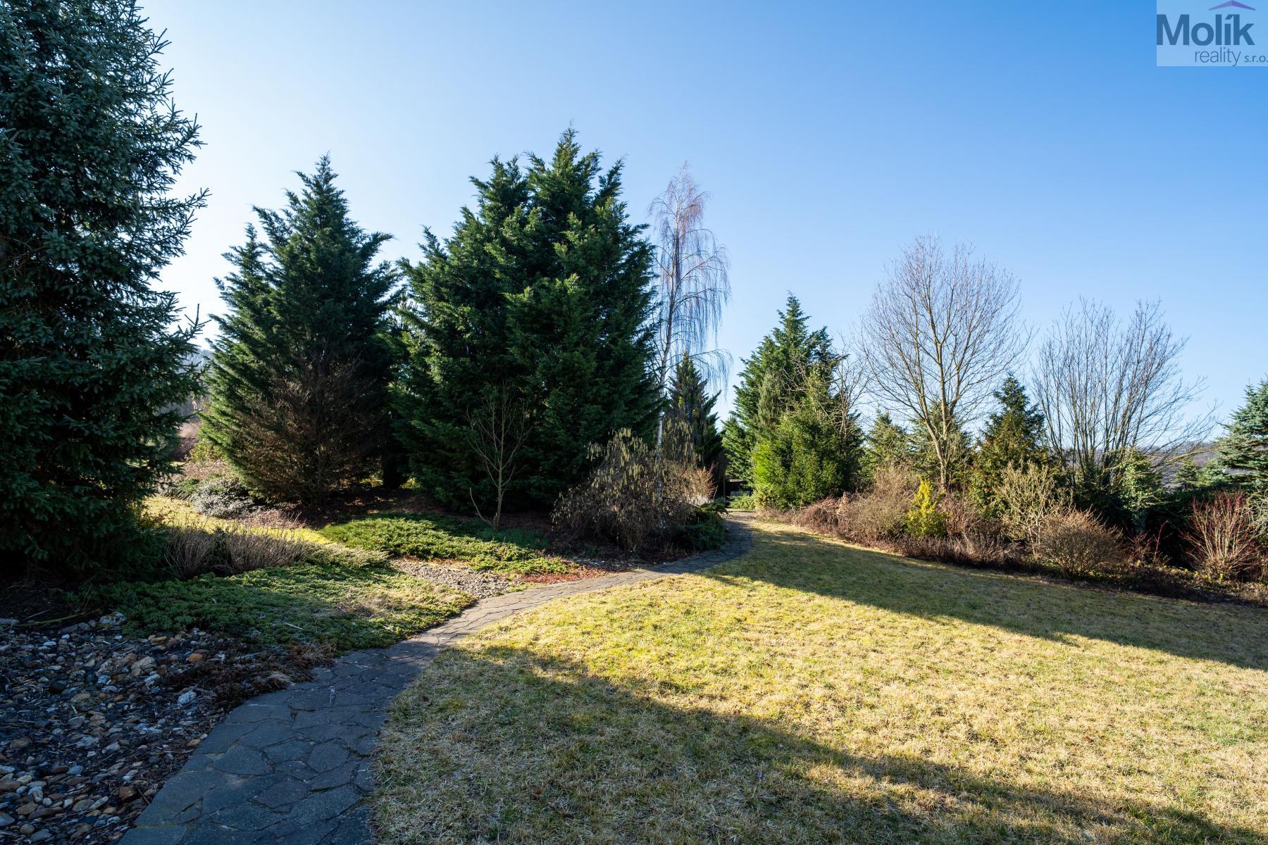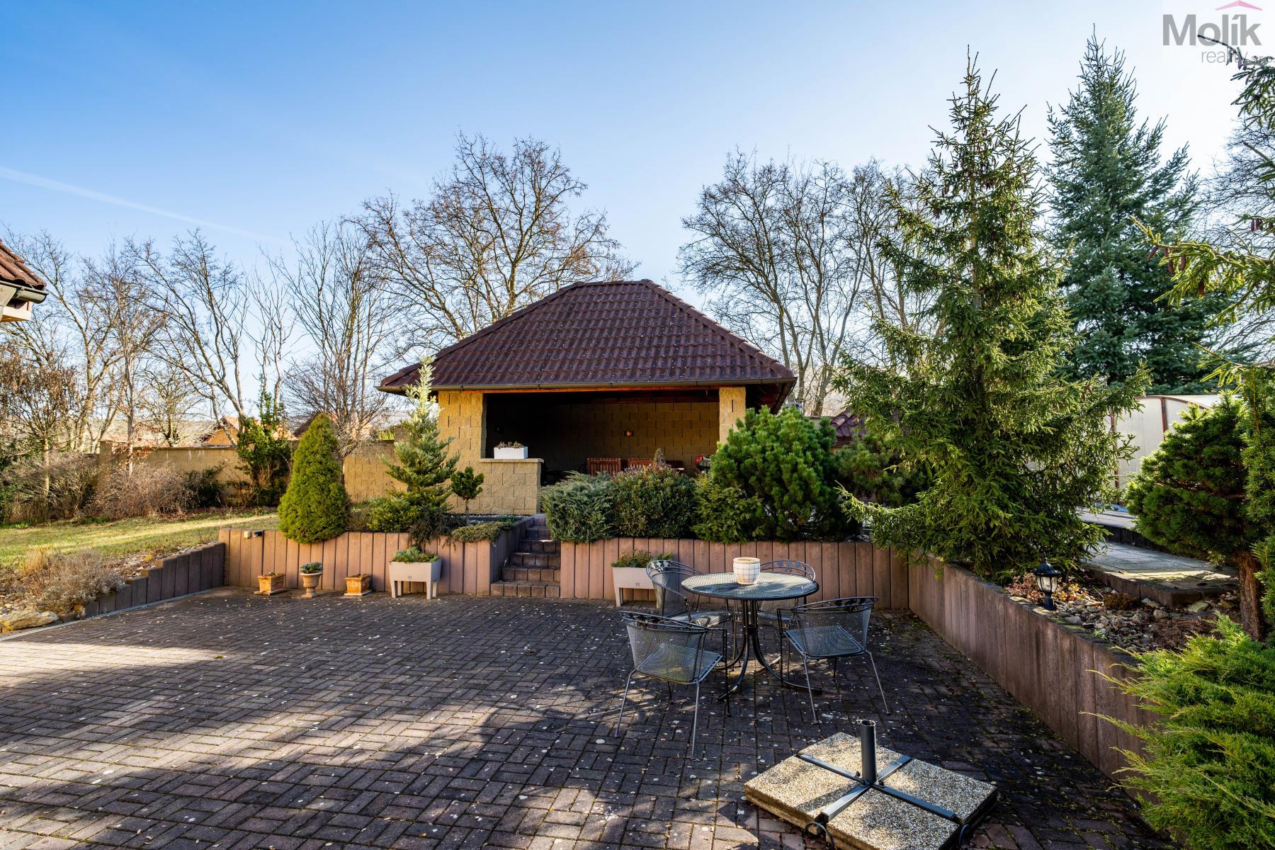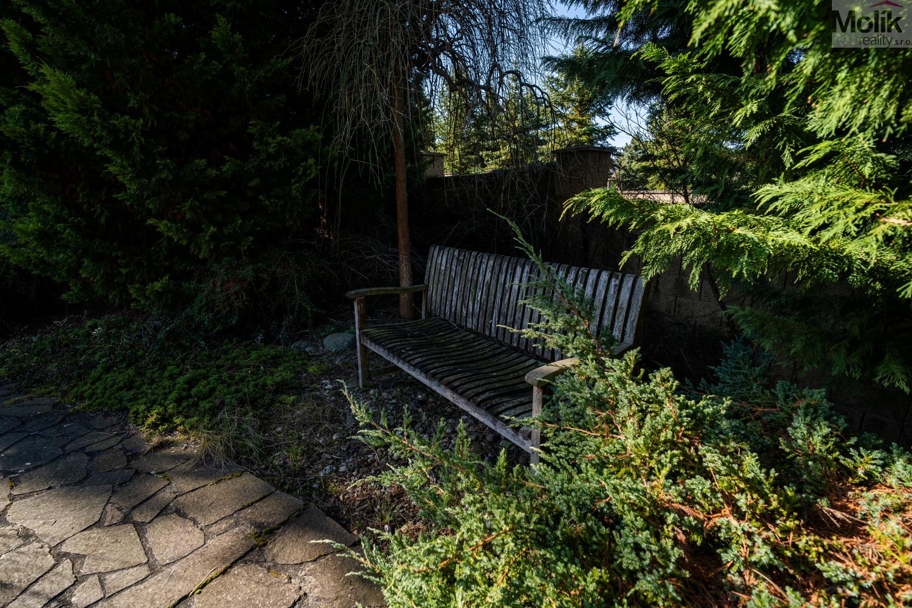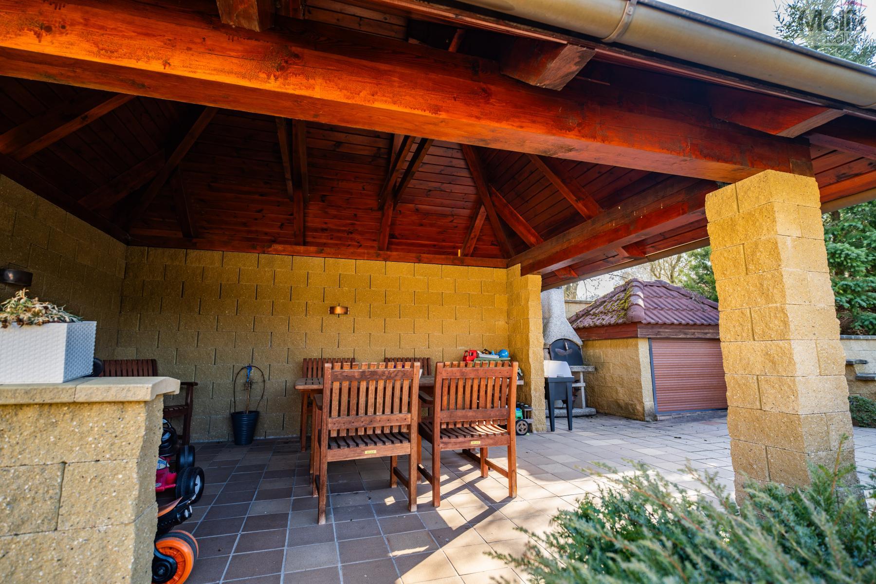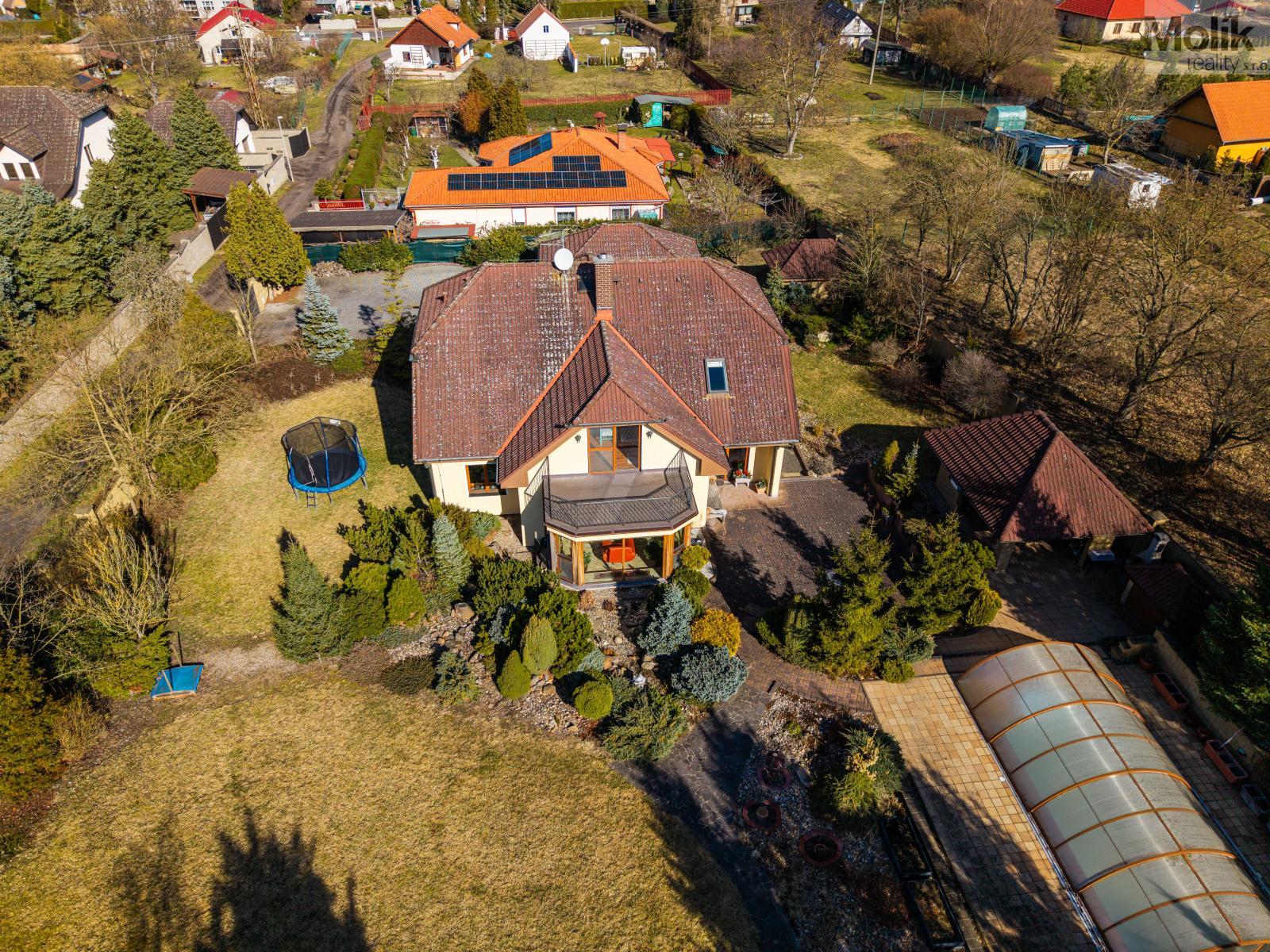 Patro domu nabízí čtyři prostorné pokoje a hlavní koupelnu s plně funkční saunou. Praktickou stránku bydlení doplňuje garáž s elektrickými vraty. Dominantou celého sídla je však jeho exteriér. Na rozlehlém pozemku, který díky své ploše přes 3 500 m and sup2; poskytuje maximální soukromí, se nachází vzrostlé jehličnany, borovice i plodící jabloně. Zahrada nabízí krytý bazén s filtrací, jezírko s vlastním čistícím systémem a splachem, a také prostorný altán s grilem pro společné chvíle. Součástí pozemku je také praktický zahradní domek na techniku. Velkou výhodou jsou dva samostatné vjezdy: jeden vede k domu a garáži, druhý zajišťuje pohodlný přístup přímo na plochu zahrady. Nemovitost se nachází v chráněné krajinné oblasti, což zaručuje bydlení v naprostém klidu a v těsném sepětí s přírodou.
