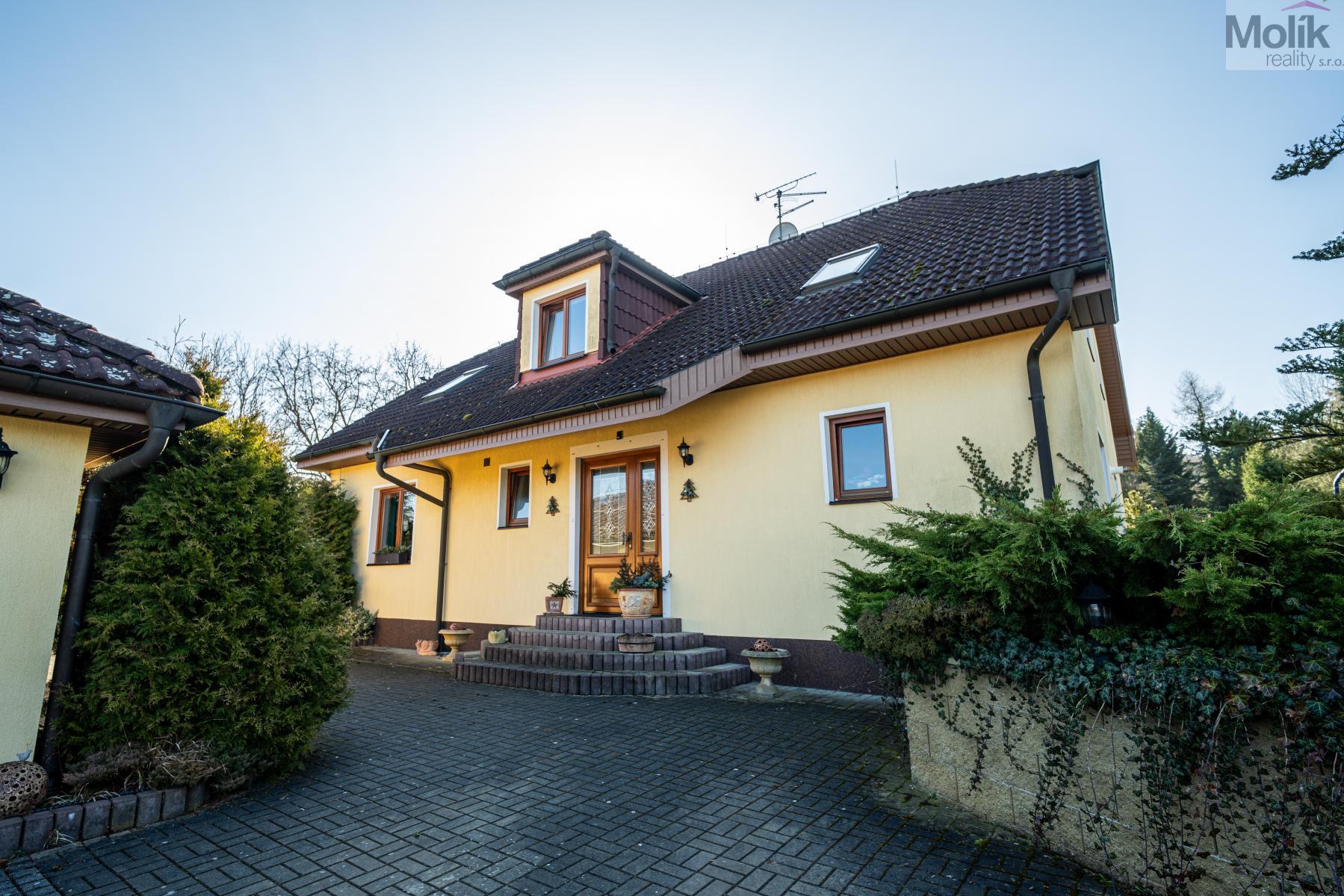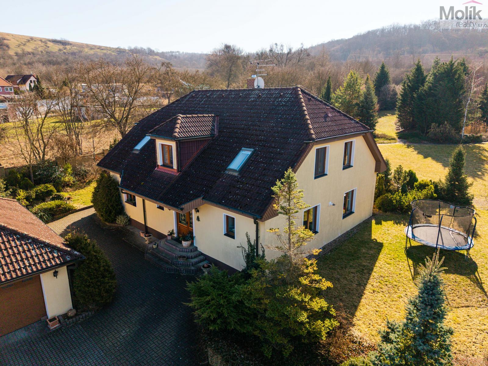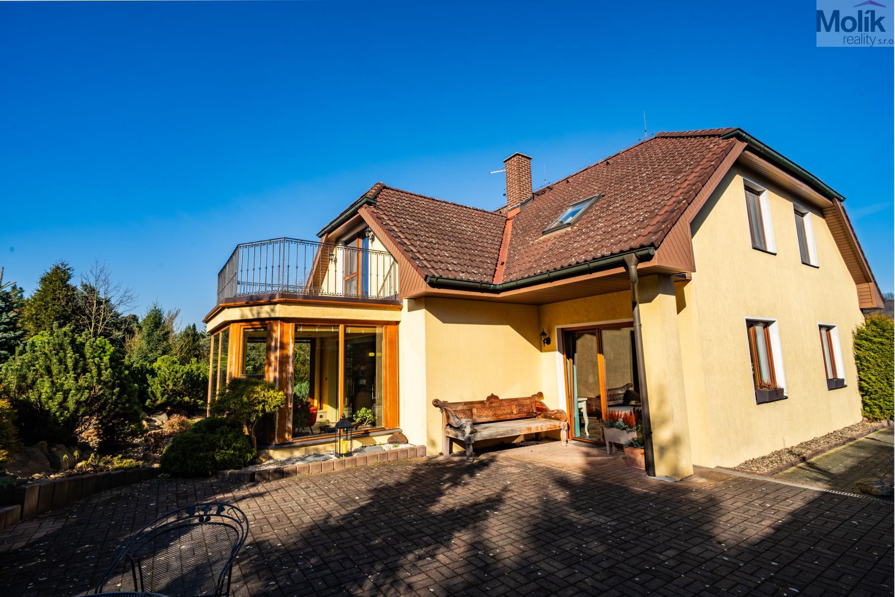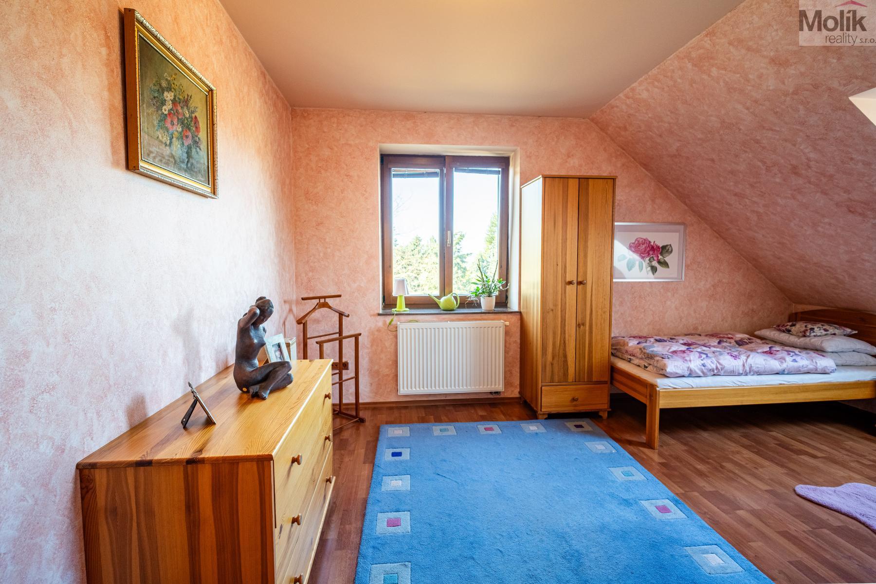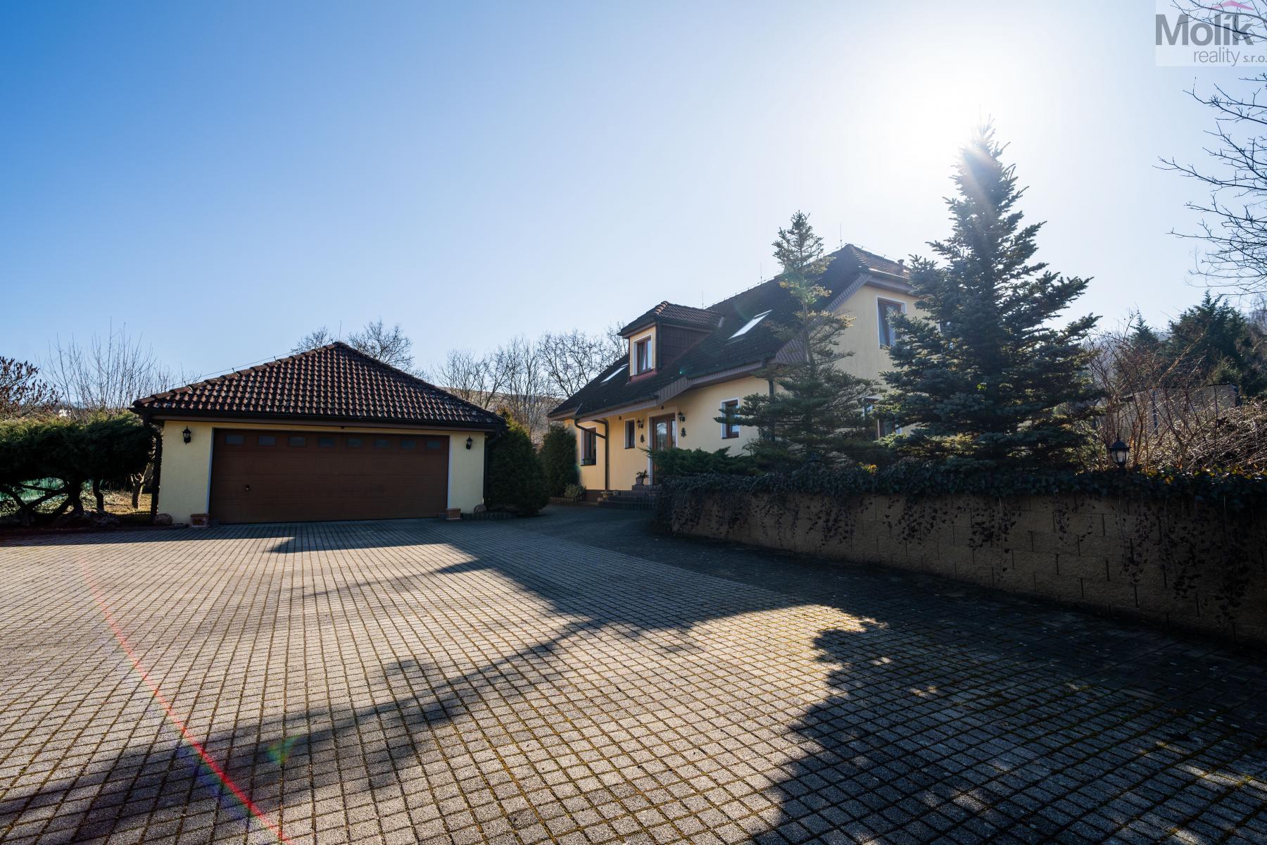 Patro domu nabízí čtyři prostorné pokoje a hlavní koupelnu s plně funkční saunou. Praktickou stránku bydlení doplňuje garáž s elektrickými vraty. Dominantou celého sídla je však jeho exteriér. Na rozlehlém pozemku, který díky své ploše přes 3 500 m and sup2; poskytuje maximální soukromí, se nachází vzrostlé jehličnany, borovice i plodící jabloně. Zahrada nabízí krytý bazén s filtrací, jezírko s vlastním čistícím systémem a splachem, a také prostorný altán s grilem pro společné chvíle. Součástí pozemku je také praktický zahradní domek na techniku. Velkou výhodou jsou dva samostatné vjezdy: jeden vede k domu a garáži, druhý zajišťuje pohodlný přístup přímo na plochu zahrady. Nemovitost se nachází v chráněné krajinné oblasti, což zaručuje bydlení v naprostém klidu a v těsném sepětí s přírodou.