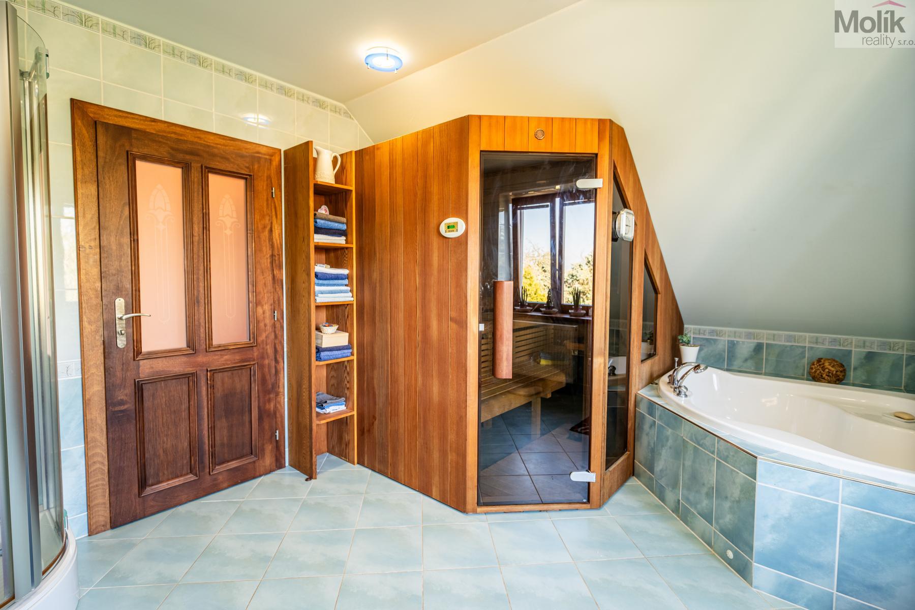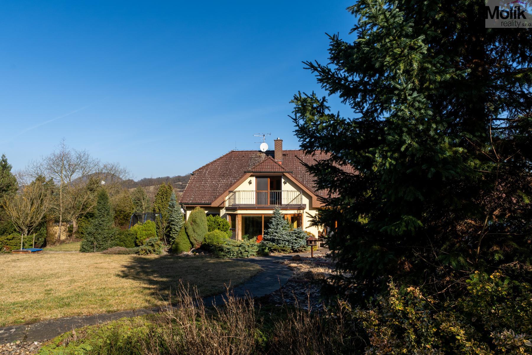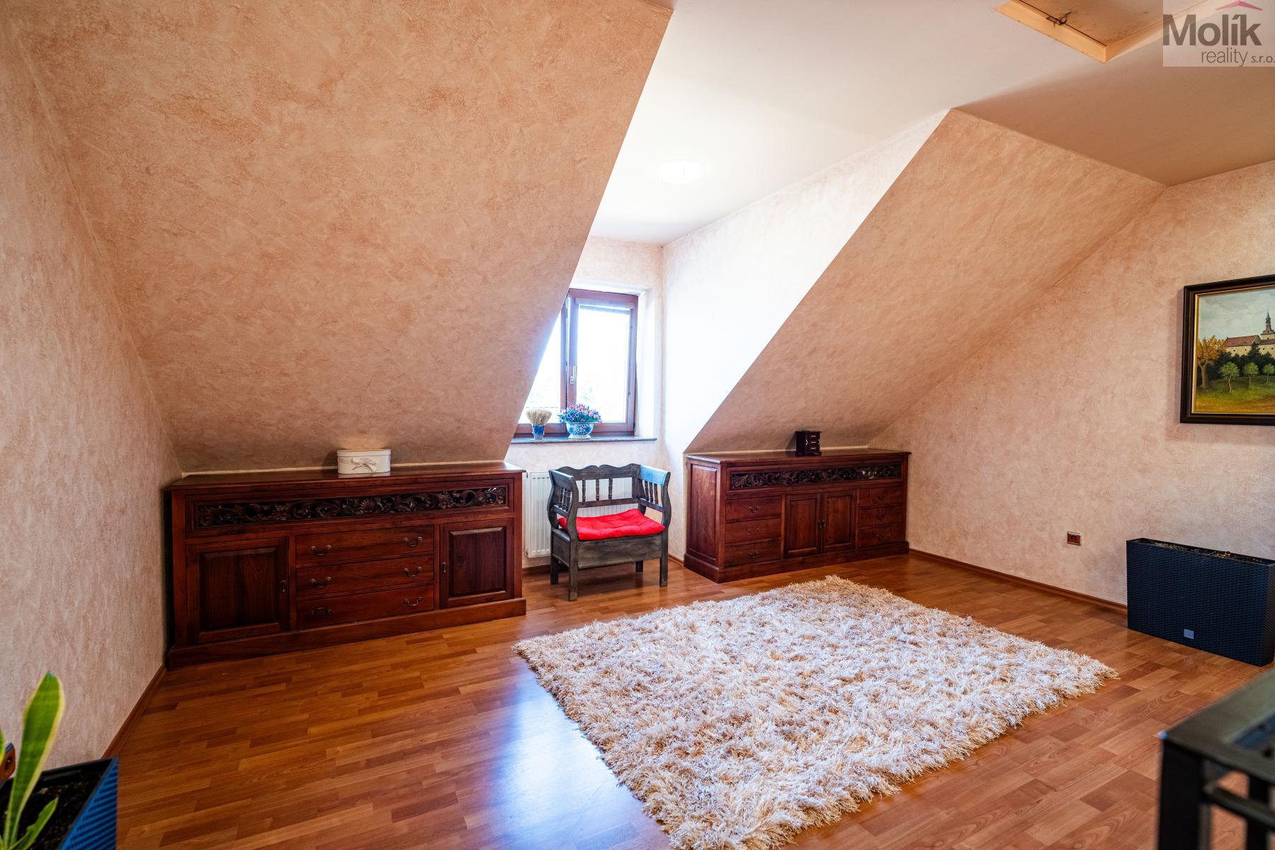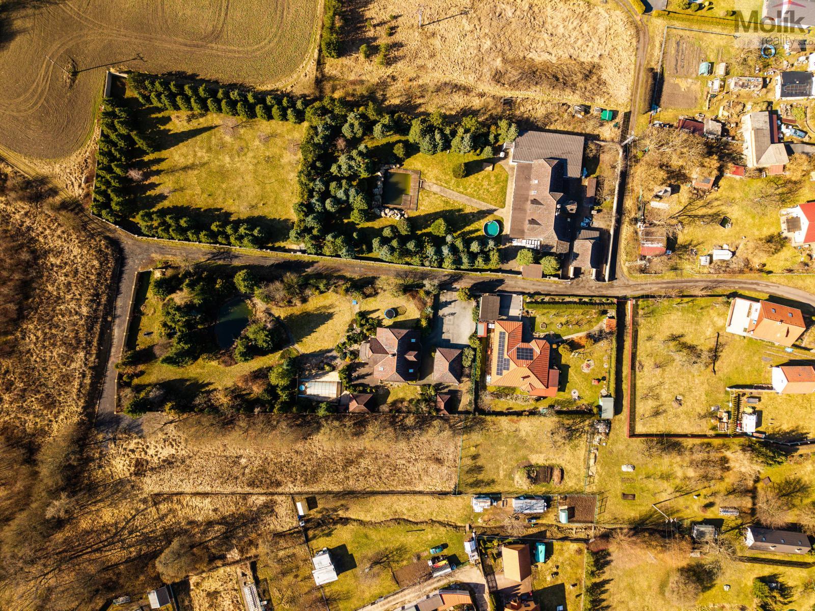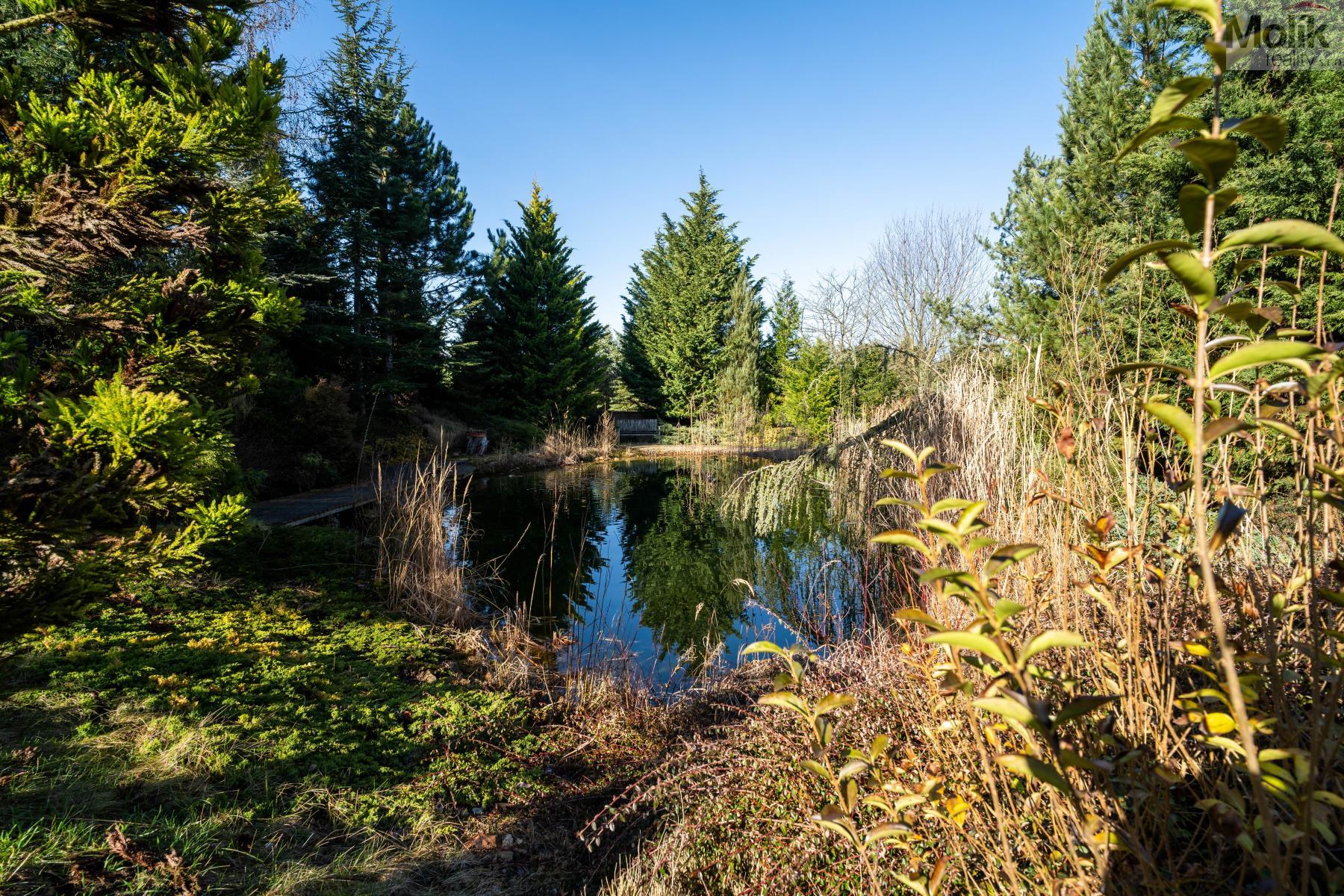 Patro domu nabízí čtyři prostorné pokoje a hlavní koupelnu s plně funkční saunou. Praktickou stránku bydlení doplňuje garáž s elektrickými vraty. Dominantou celého sídla je však jeho exteriér. Na rozlehlém pozemku, který díky své ploše přes 3 500 m and sup2; poskytuje maximální soukromí, se nachází vzrostlé jehličnany, borovice i plodící jabloně. Zahrada nabízí krytý bazén s filtrací, jezírko s vlastním čistícím systémem a splachem, a také prostorný altán s grilem pro společné chvíle. Součástí pozemku je také praktický zahradní domek na techniku. Velkou výhodou jsou dva samostatné vjezdy: jeden vede k domu a garáži, druhý zajišťuje pohodlný přístup přímo na plochu zahrady. Nemovitost se nachází v chráněné krajinné oblasti, což zaručuje bydlení v naprostém klidu a v těsném sepětí s přírodou.