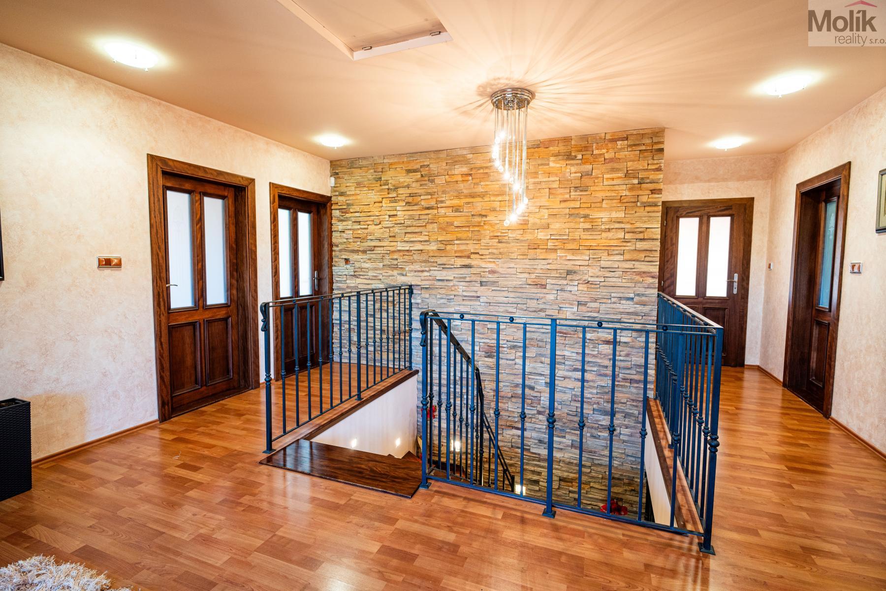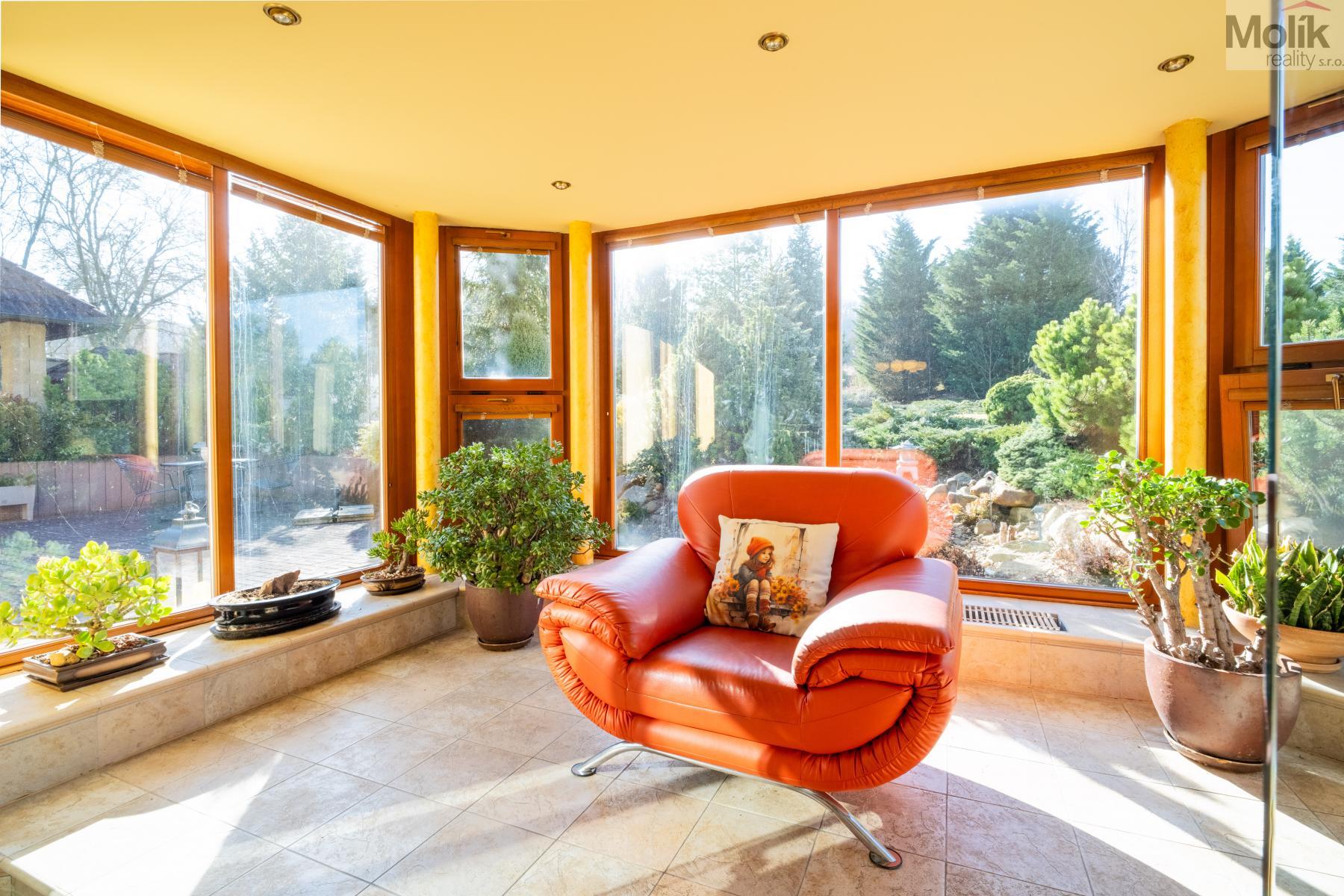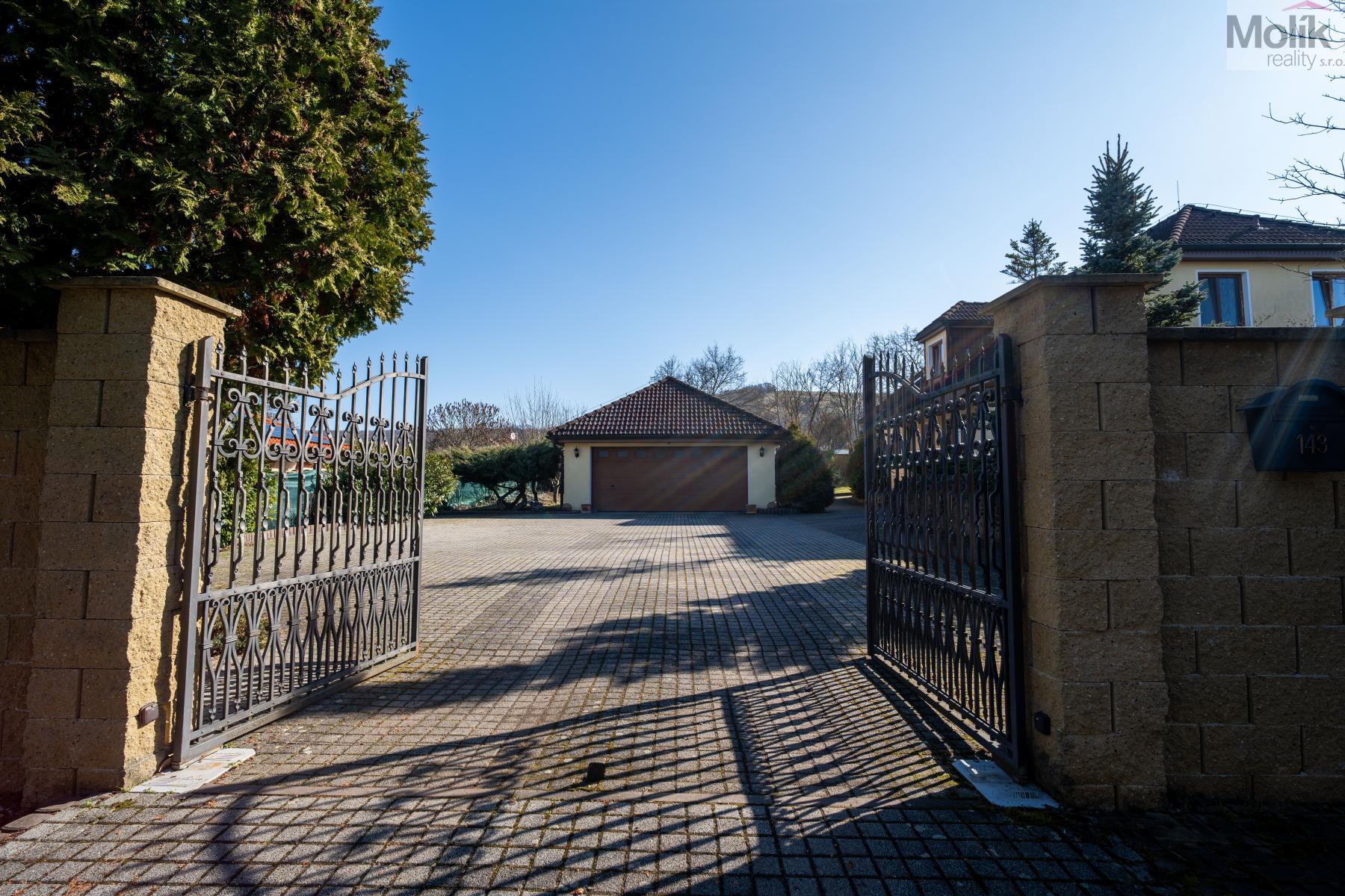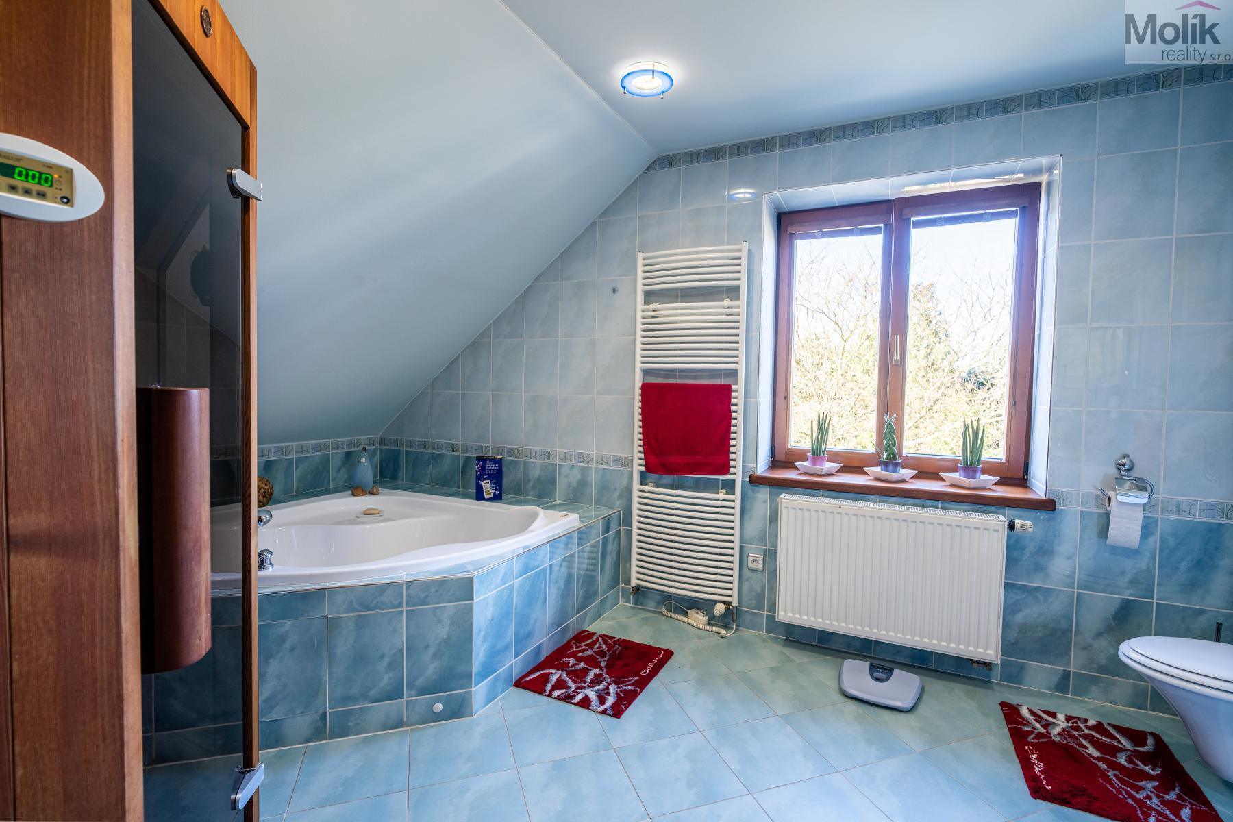 Patro domu nabízí čtyři prostorné pokoje a hlavní koupelnu s plně funkční saunou. Praktickou stránku bydlení doplňuje garáž s elektrickými vraty. Dominantou celého sídla je však jeho exteriér. Na rozlehlém pozemku, který díky své ploše přes 3 500 m and sup2; poskytuje maximální soukromí, se nachází vzrostlé jehličnany, borovice i plodící jabloně. Zahrada nabízí krytý bazén s filtrací, jezírko s vlastním čistícím systémem a splachem, a také prostorný altán s grilem pro společné chvíle. Součástí pozemku je také praktický zahradní domek na techniku. Velkou výhodou jsou dva samostatné vjezdy: jeden vede k domu a garáži, druhý zajišťuje pohodlný přístup přímo na plochu zahrady. Nemovitost se nachází v chráněné krajinné oblasti, což zaručuje bydlení v naprostém klidu a v těsném sepětí s přírodou.