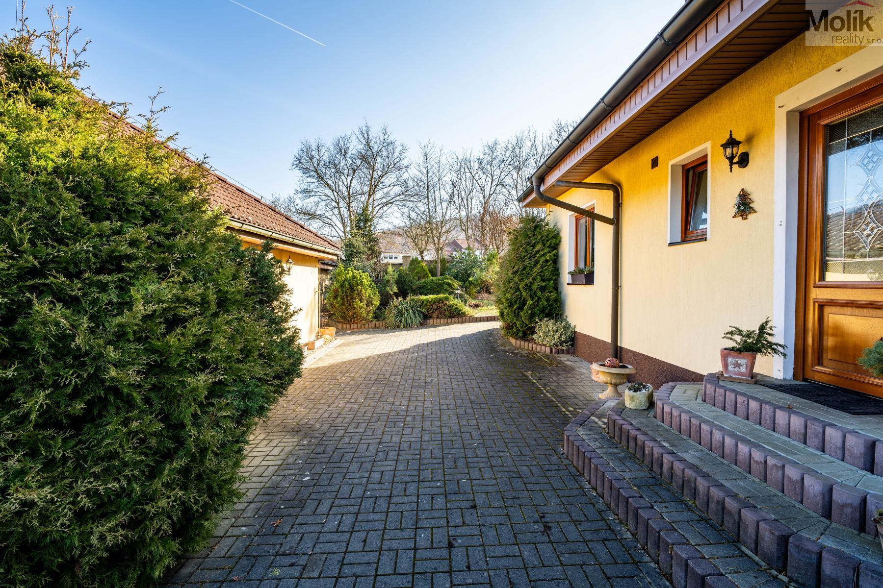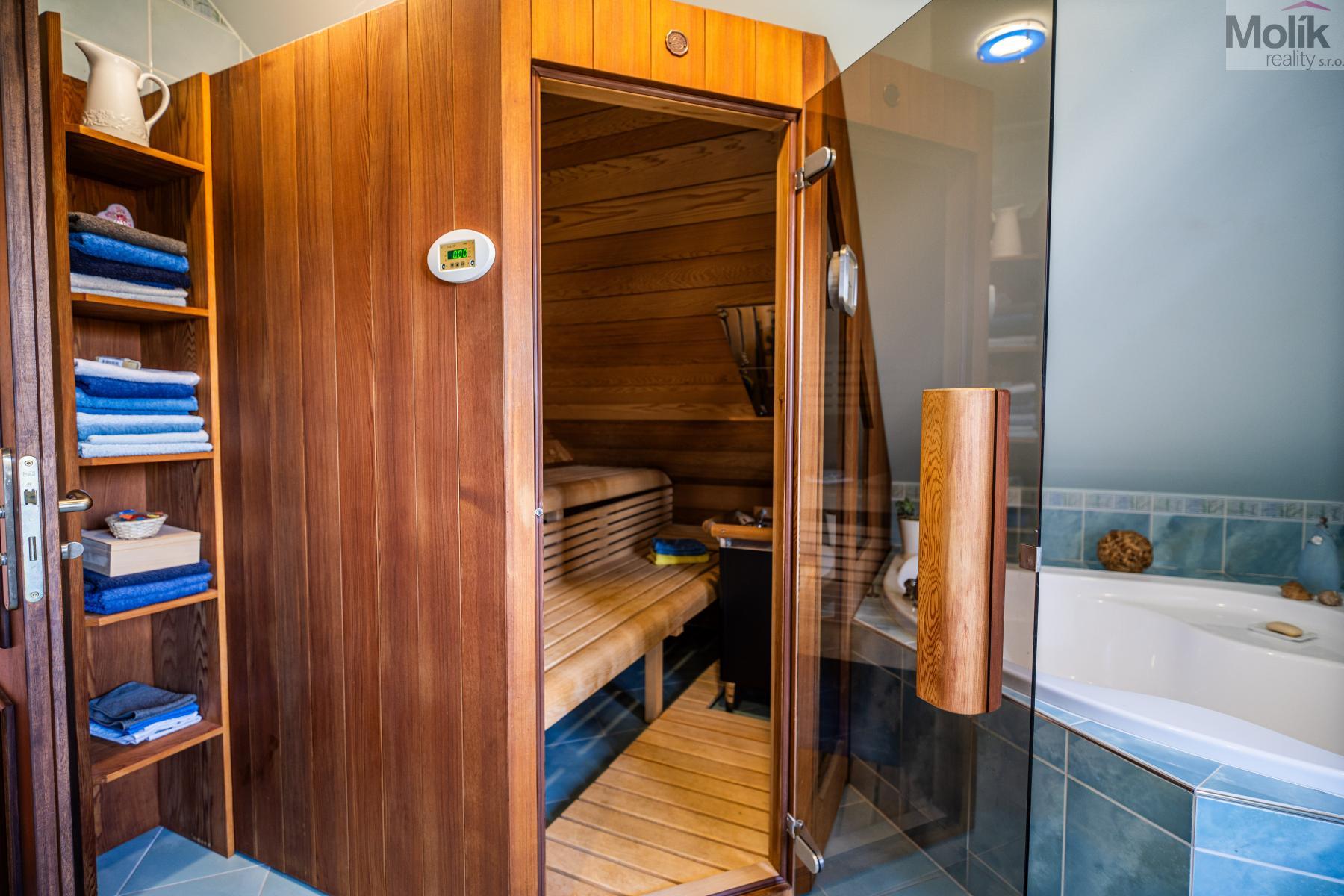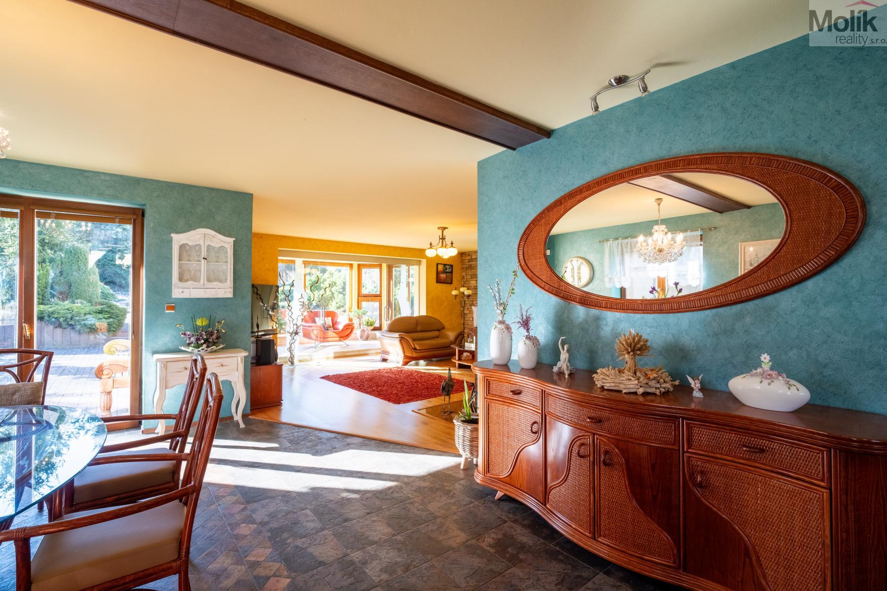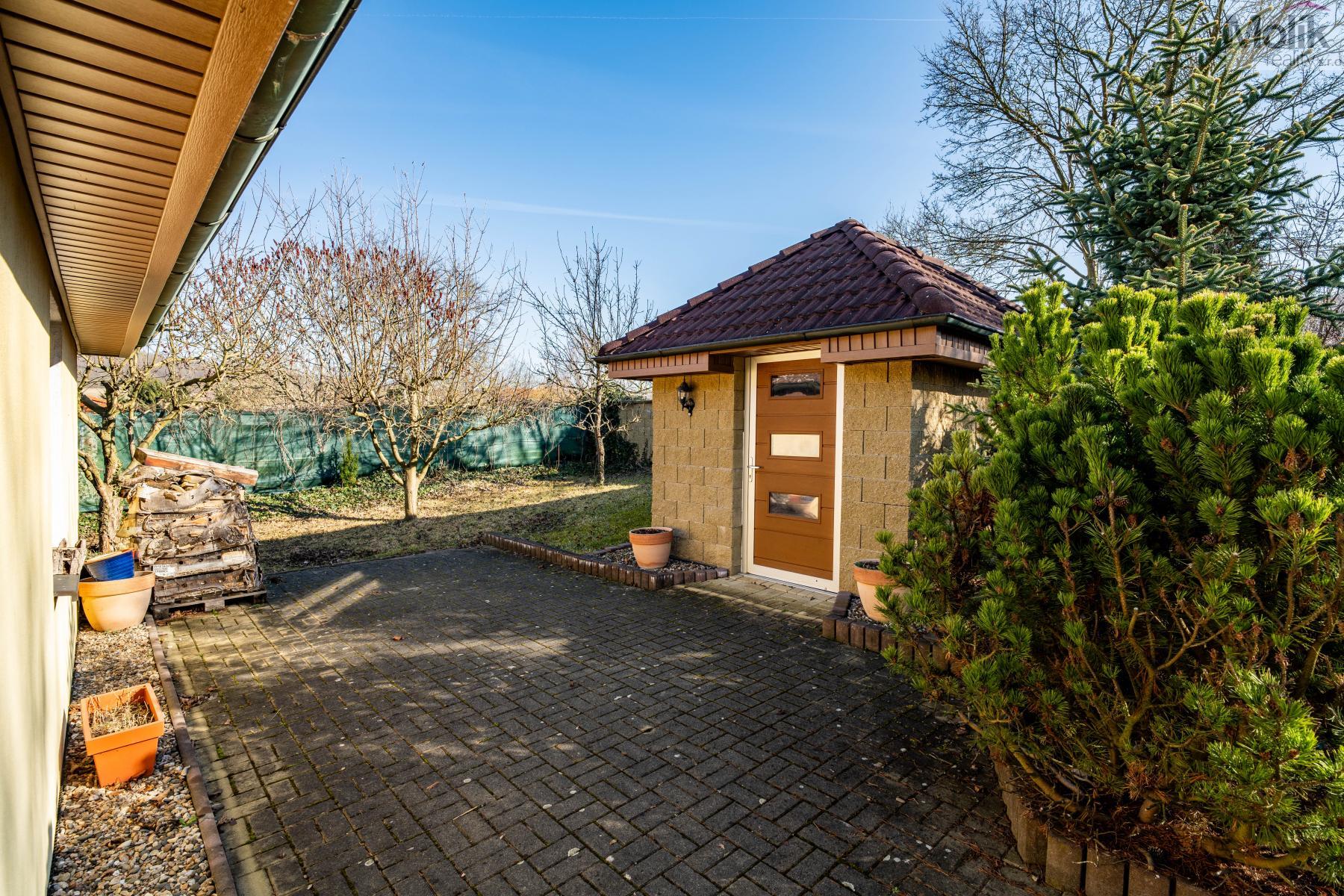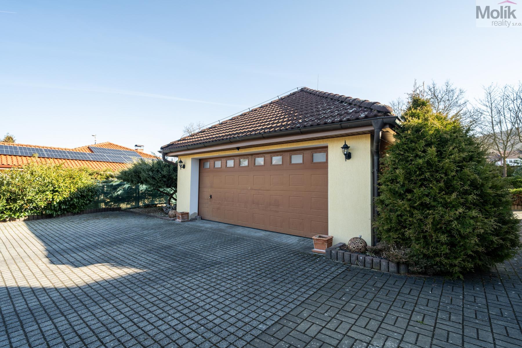 Patro domu nabízí čtyři prostorné pokoje a hlavní koupelnu s plně funkční saunou. Praktickou stránku bydlení doplňuje garáž s elektrickými vraty. Dominantou celého sídla je však jeho exteriér. Na rozlehlém pozemku, který díky své ploše přes 3 500 m and sup2; poskytuje maximální soukromí, se nachází vzrostlé jehličnany, borovice i plodící jabloně. Zahrada nabízí krytý bazén s filtrací, jezírko s vlastním čistícím systémem a splachem, a také prostorný altán s grilem pro společné chvíle. Součástí pozemku je také praktický zahradní domek na techniku. Velkou výhodou jsou dva samostatné vjezdy: jeden vede k domu a garáži, druhý zajišťuje pohodlný přístup přímo na plochu zahrady. Nemovitost se nachází v chráněné krajinné oblasti, což zaručuje bydlení v naprostém klidu a v těsném sepětí s přírodou.
