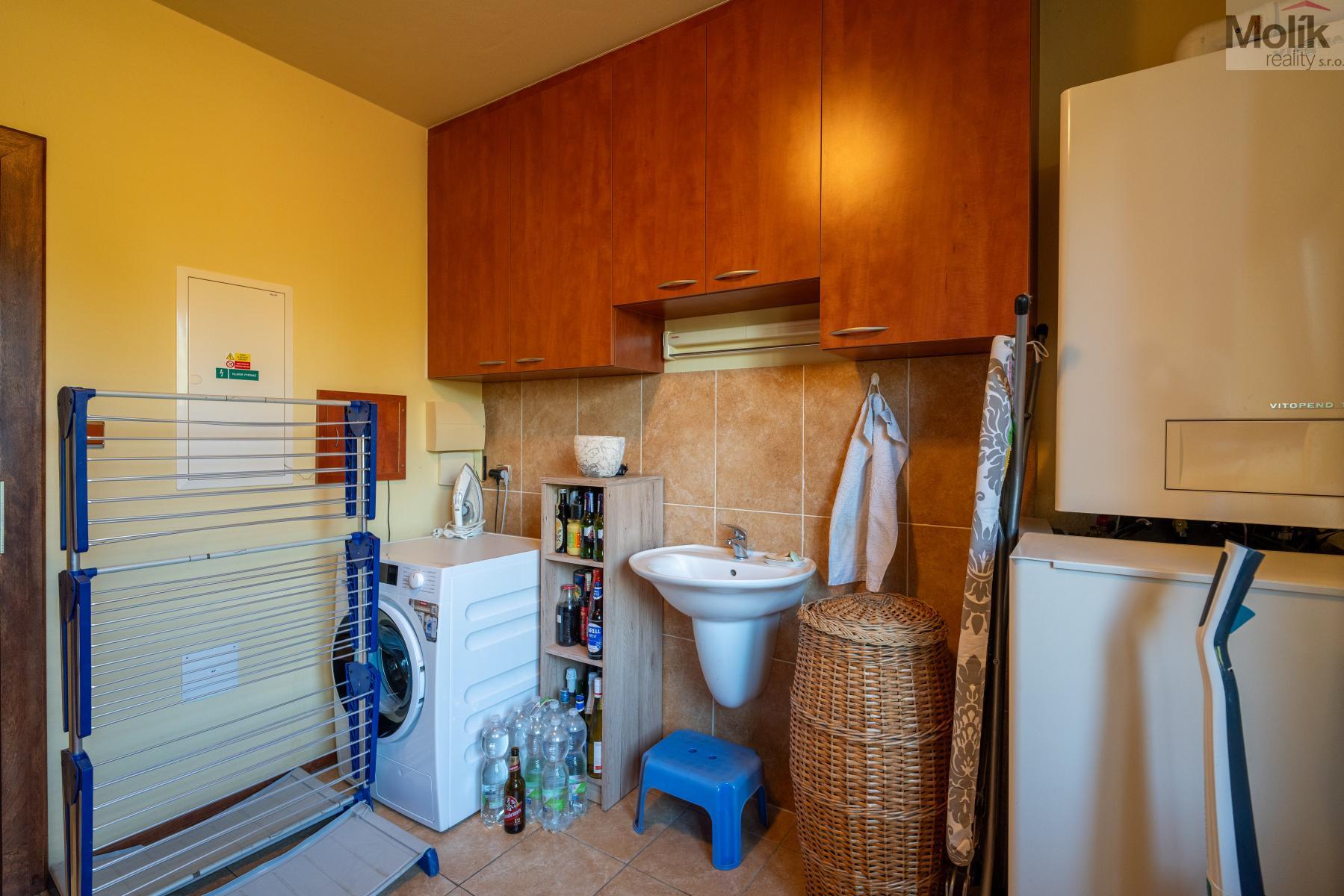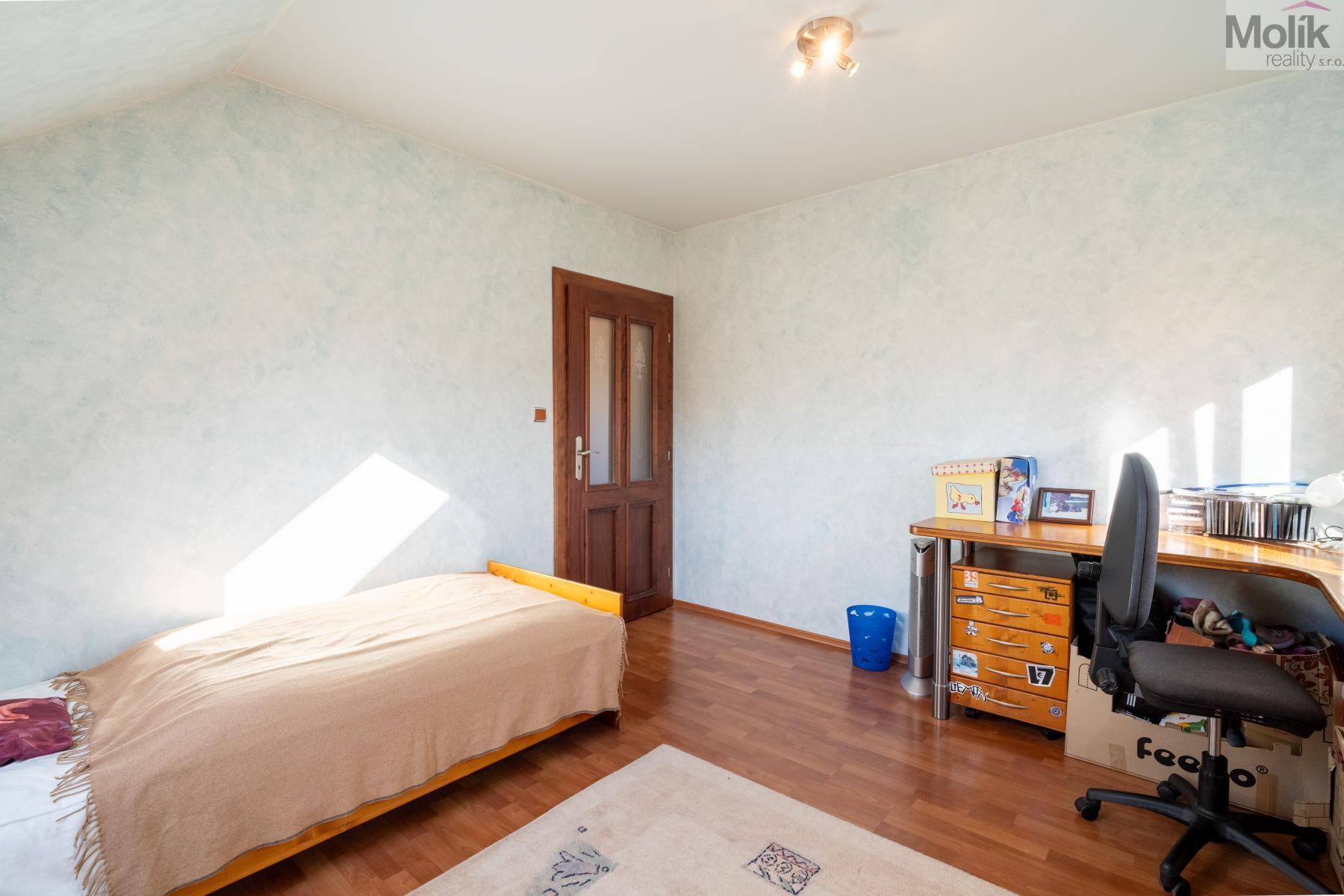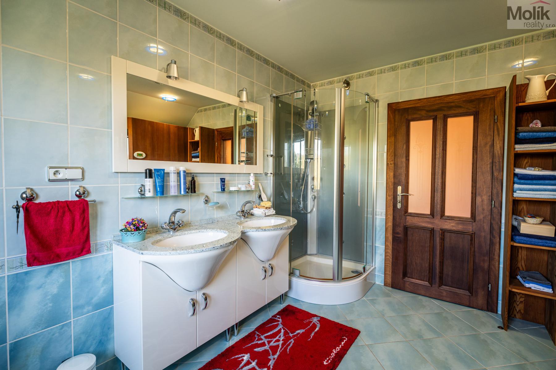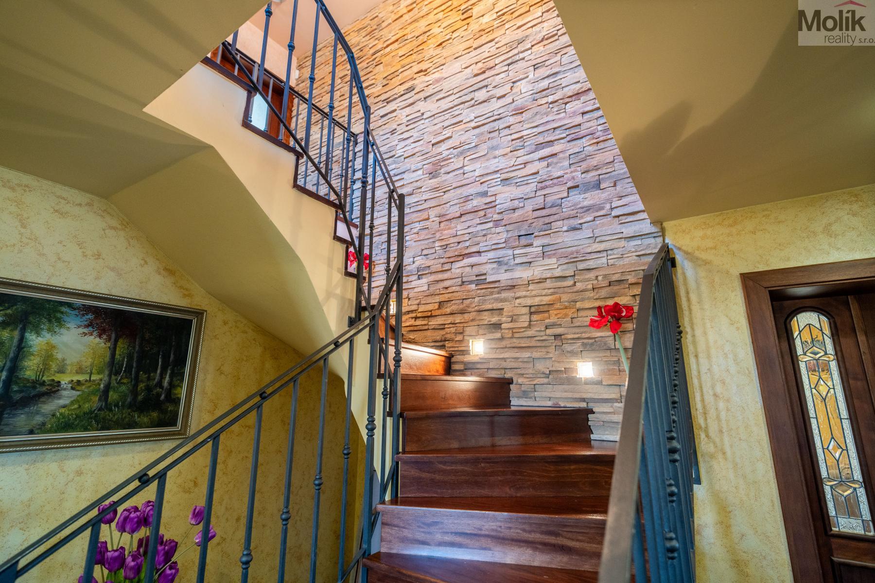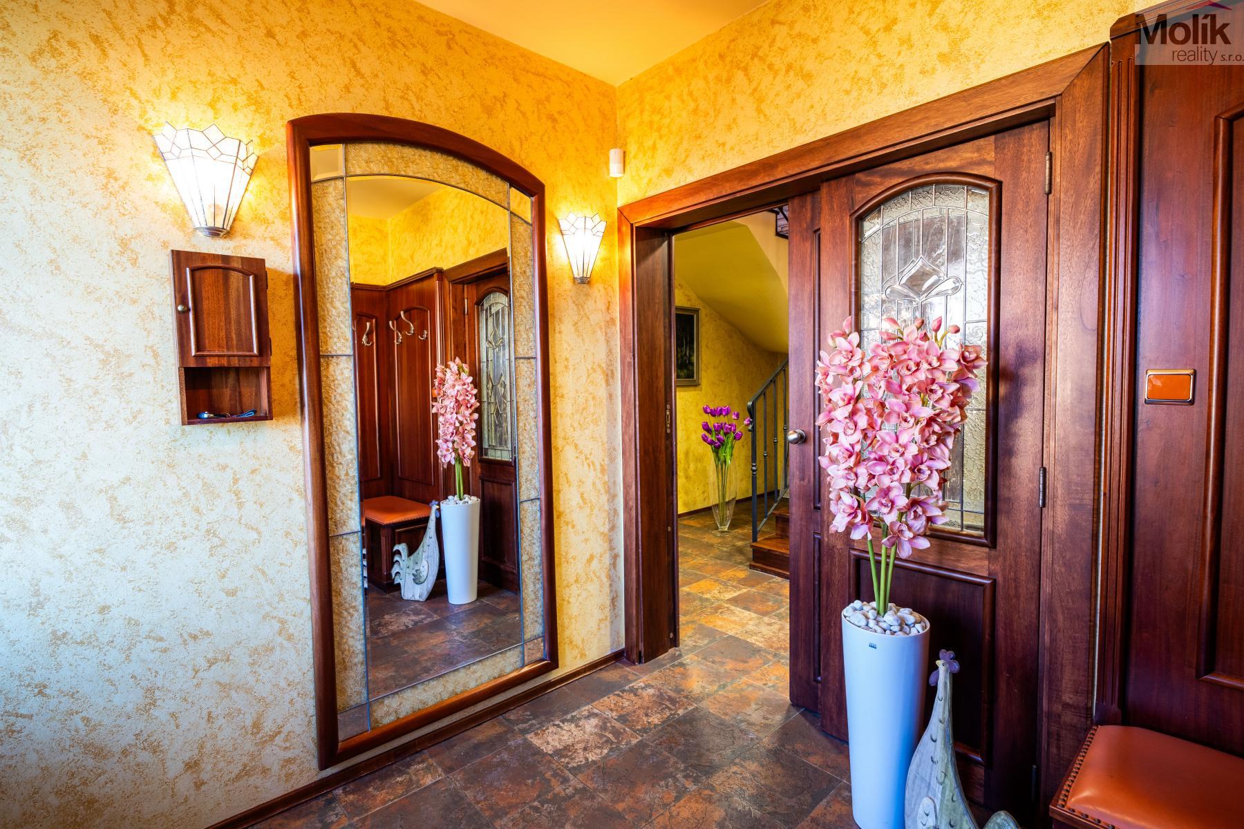 Patro domu nabízí čtyři prostorné pokoje a hlavní koupelnu s plně funkční saunou. Praktickou stránku bydlení doplňuje garáž s elektrickými vraty. Dominantou celého sídla je však jeho exteriér. Na rozlehlém pozemku, který díky své ploše přes 3 500 m and sup2; poskytuje maximální soukromí, se nachází vzrostlé jehličnany, borovice i plodící jabloně. Zahrada nabízí krytý bazén s filtrací, jezírko s vlastním čistícím systémem a splachem, a také prostorný altán s grilem pro společné chvíle. Součástí pozemku je také praktický zahradní domek na techniku. Velkou výhodou jsou dva samostatné vjezdy: jeden vede k domu a garáži, druhý zajišťuje pohodlný přístup přímo na plochu zahrady. Nemovitost se nachází v chráněné krajinné oblasti, což zaručuje bydlení v naprostém klidu a v těsném sepětí s přírodou.