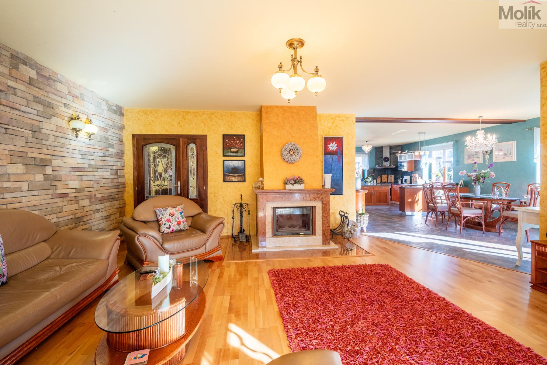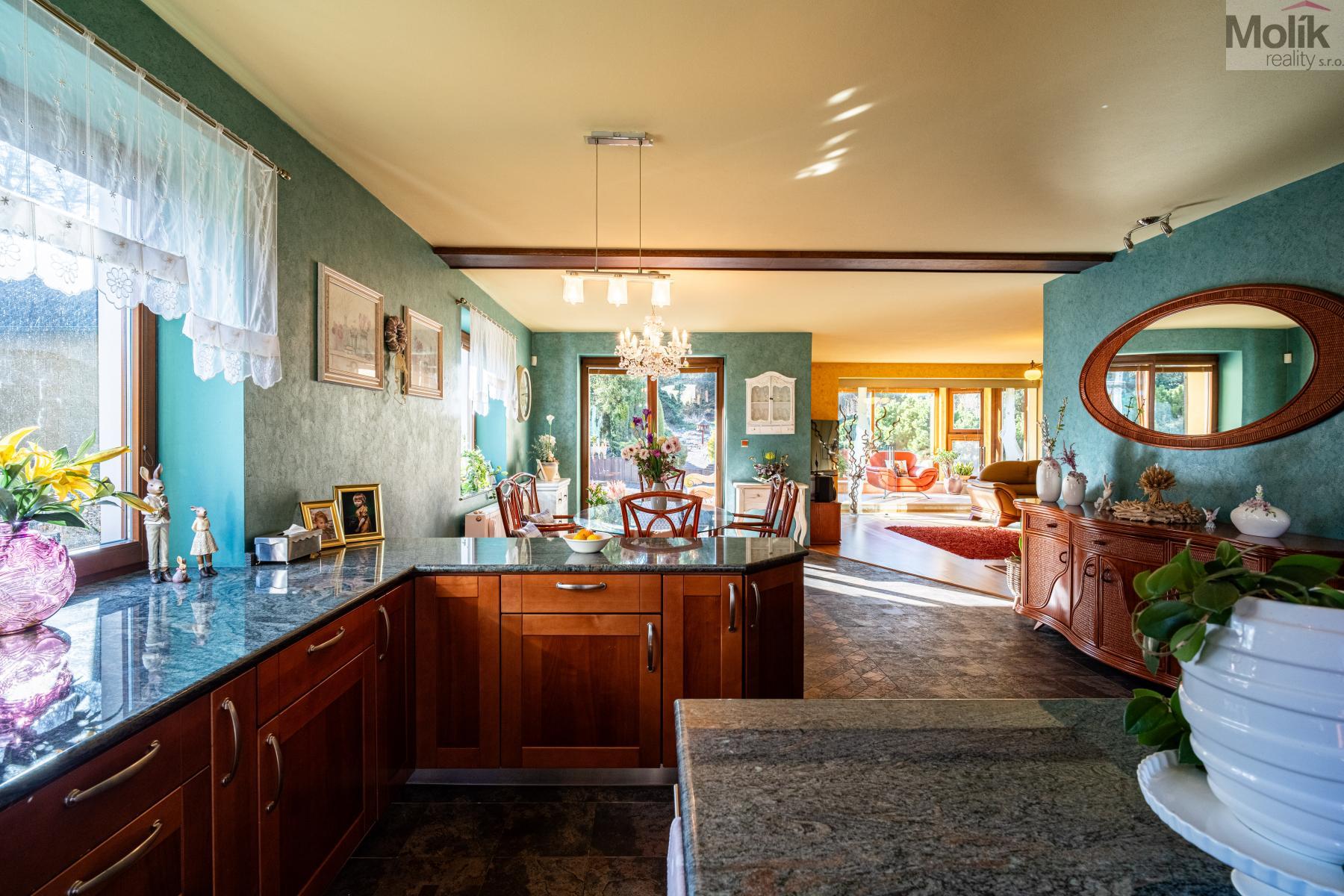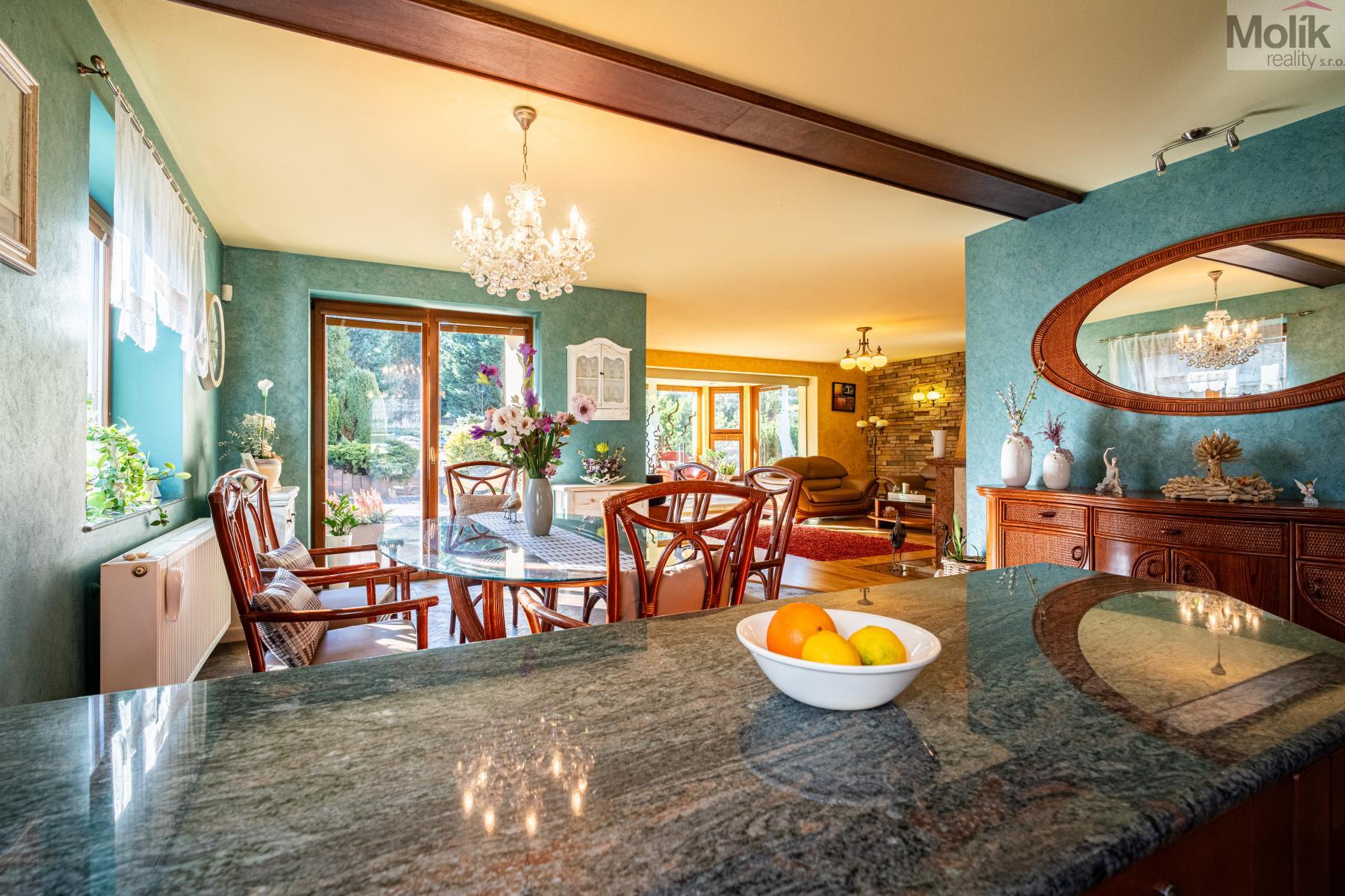 Srdcem přízemí je prosluněný obývací pokoj s krbem doplněným o mramorové prvky. Na něj navazuje moderní kuchyně s pracovní deskou z přírodní žuly a prosklená zimní zahrada, která díky velkorysému prosklení otevírá výhledy do rozlehlé zahrady.