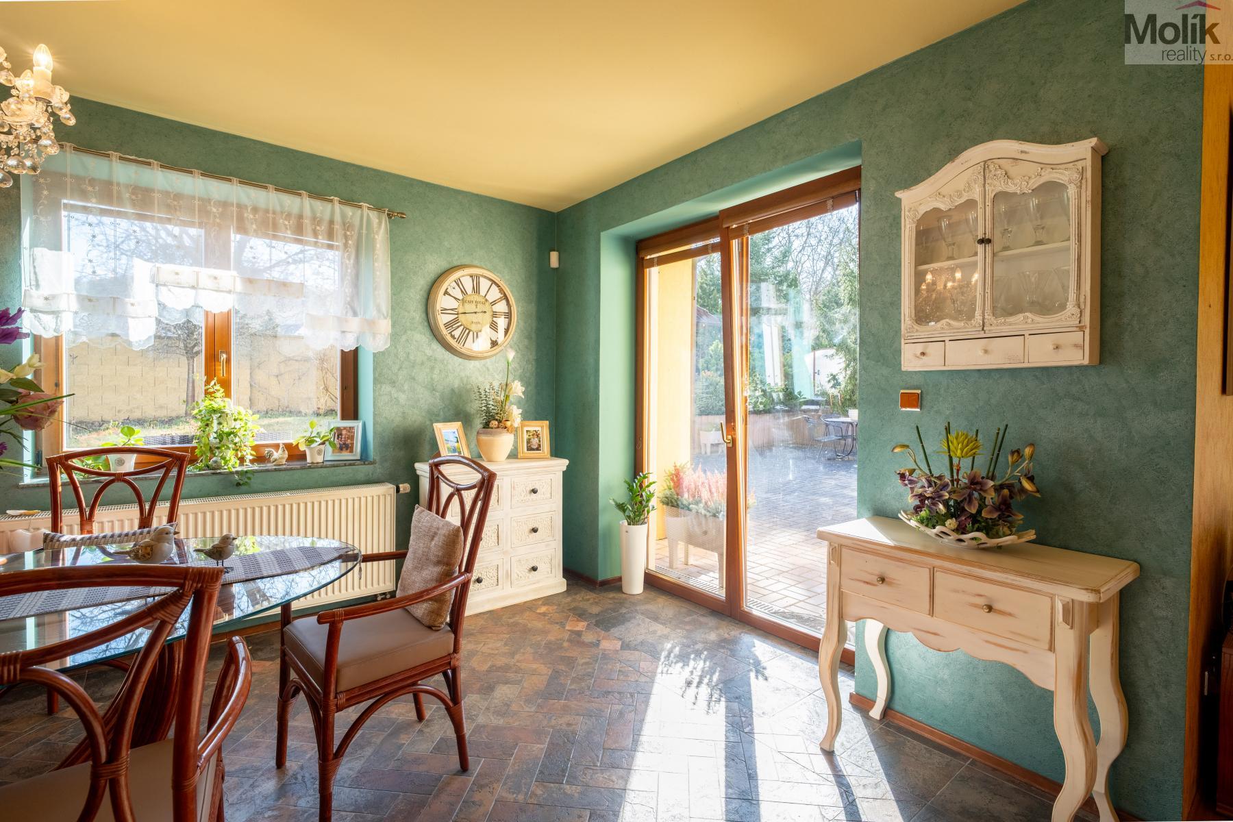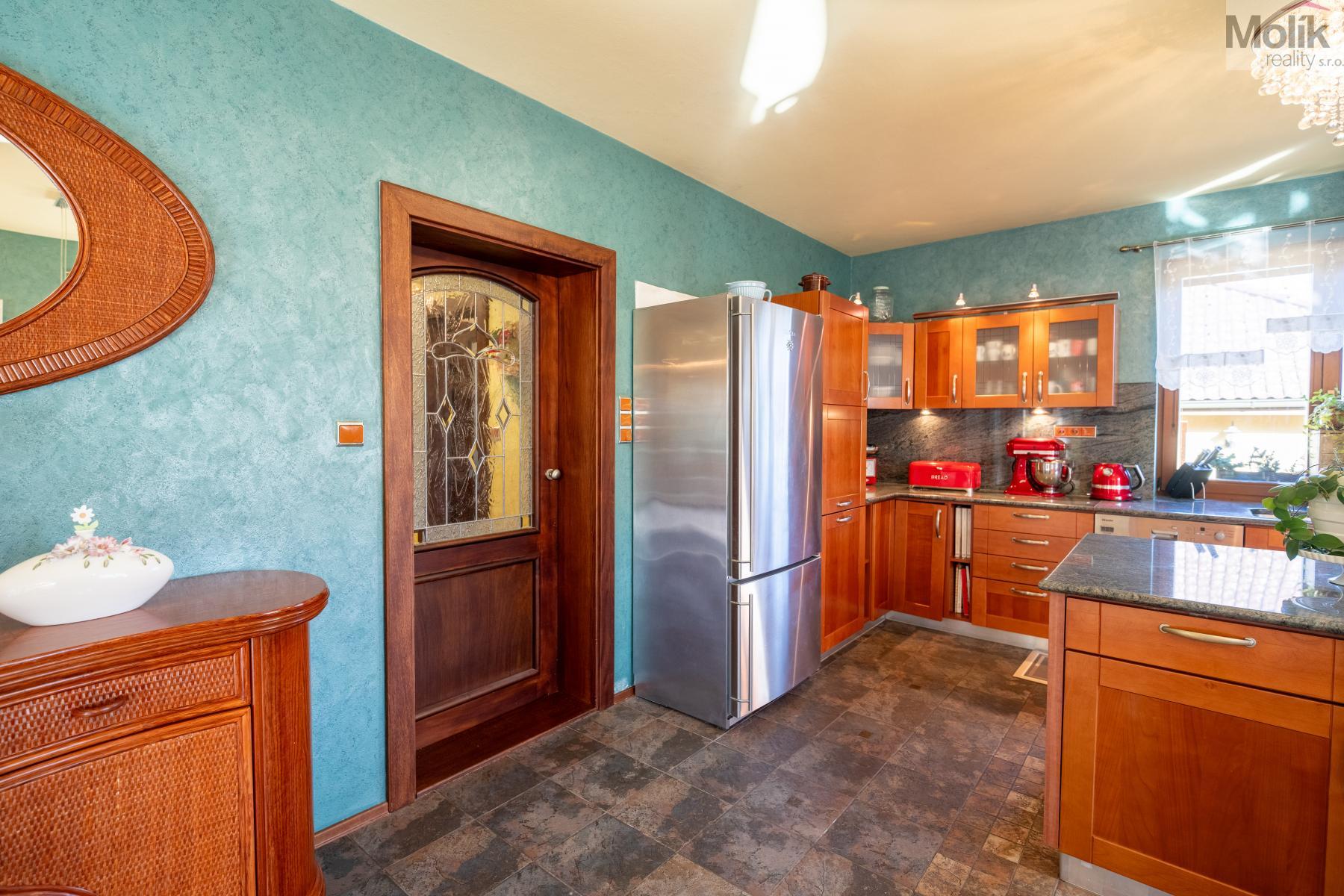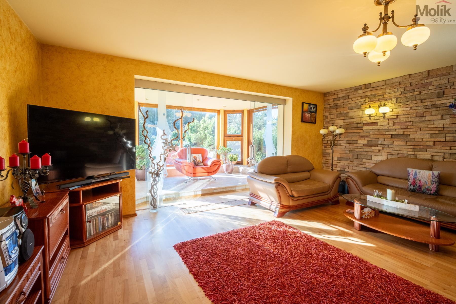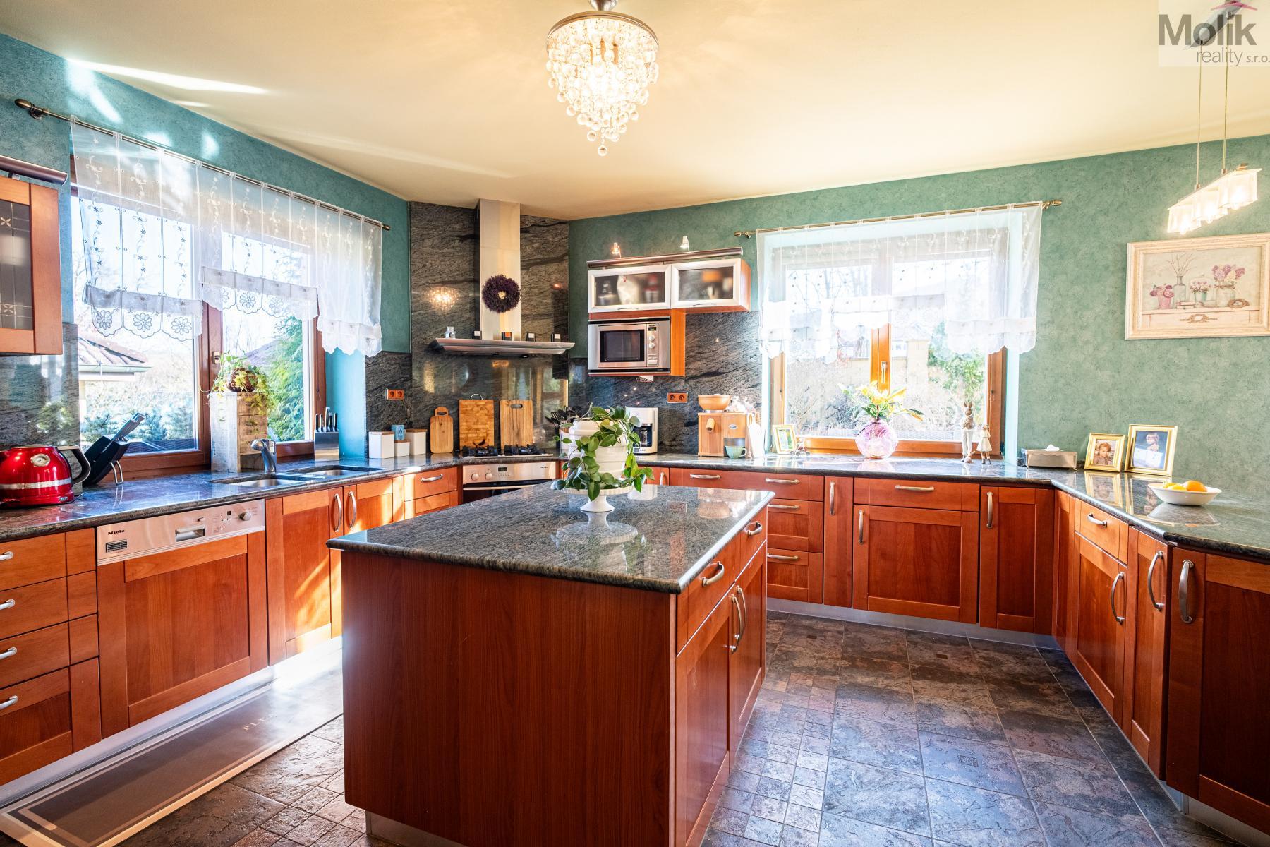 Srdcem přízemí je prosluněný obývací pokoj s krbem doplněným o mramorové prvky. Na něj navazuje moderní kuchyně s pracovní deskou z přírodní žuly a prosklená zimní zahrada, která díky velkorysému prosklení otevírá výhledy do rozlehlé zahrady.
