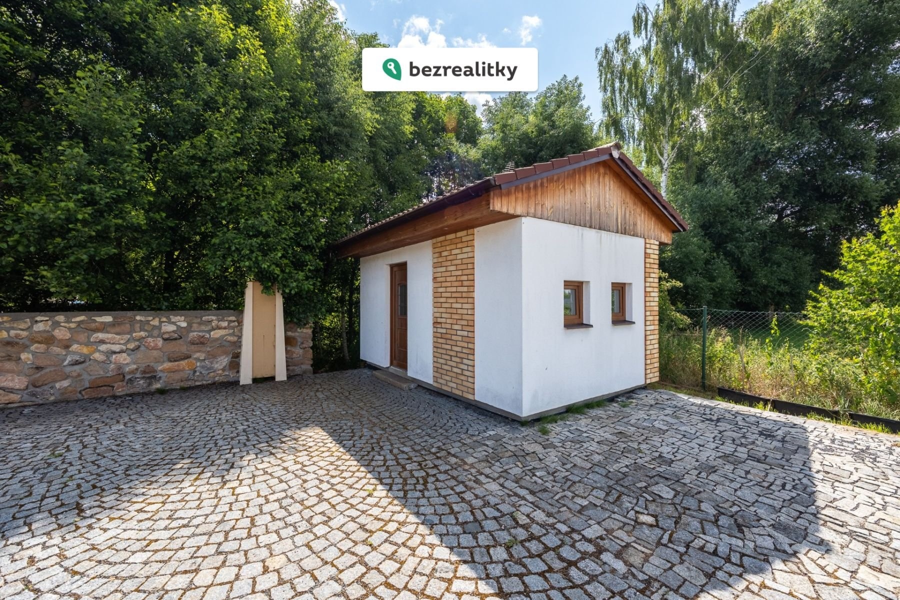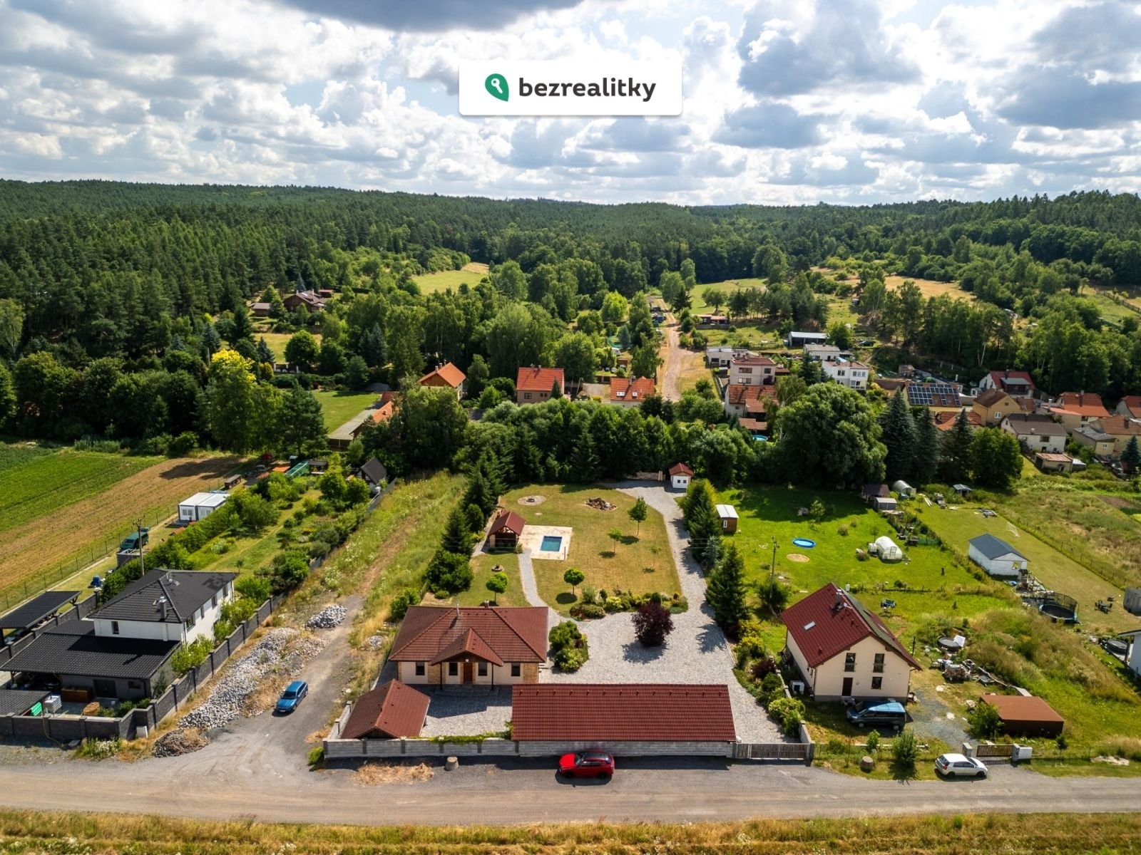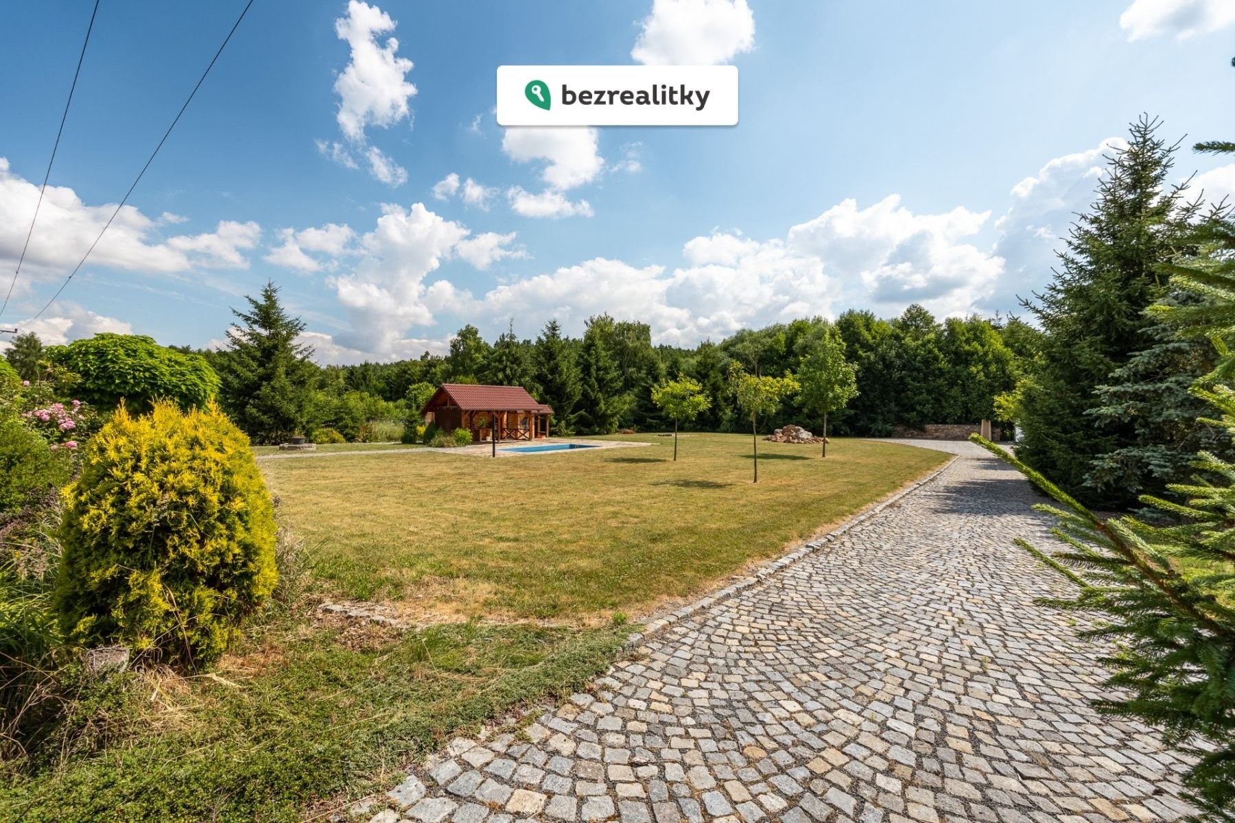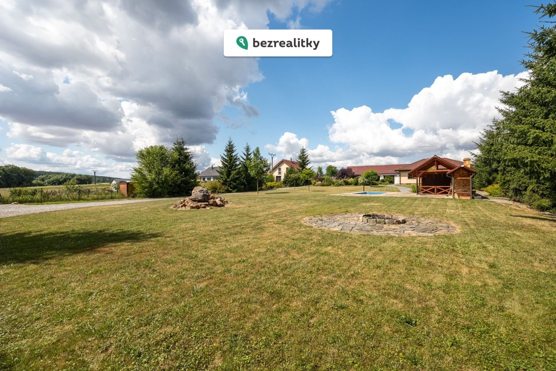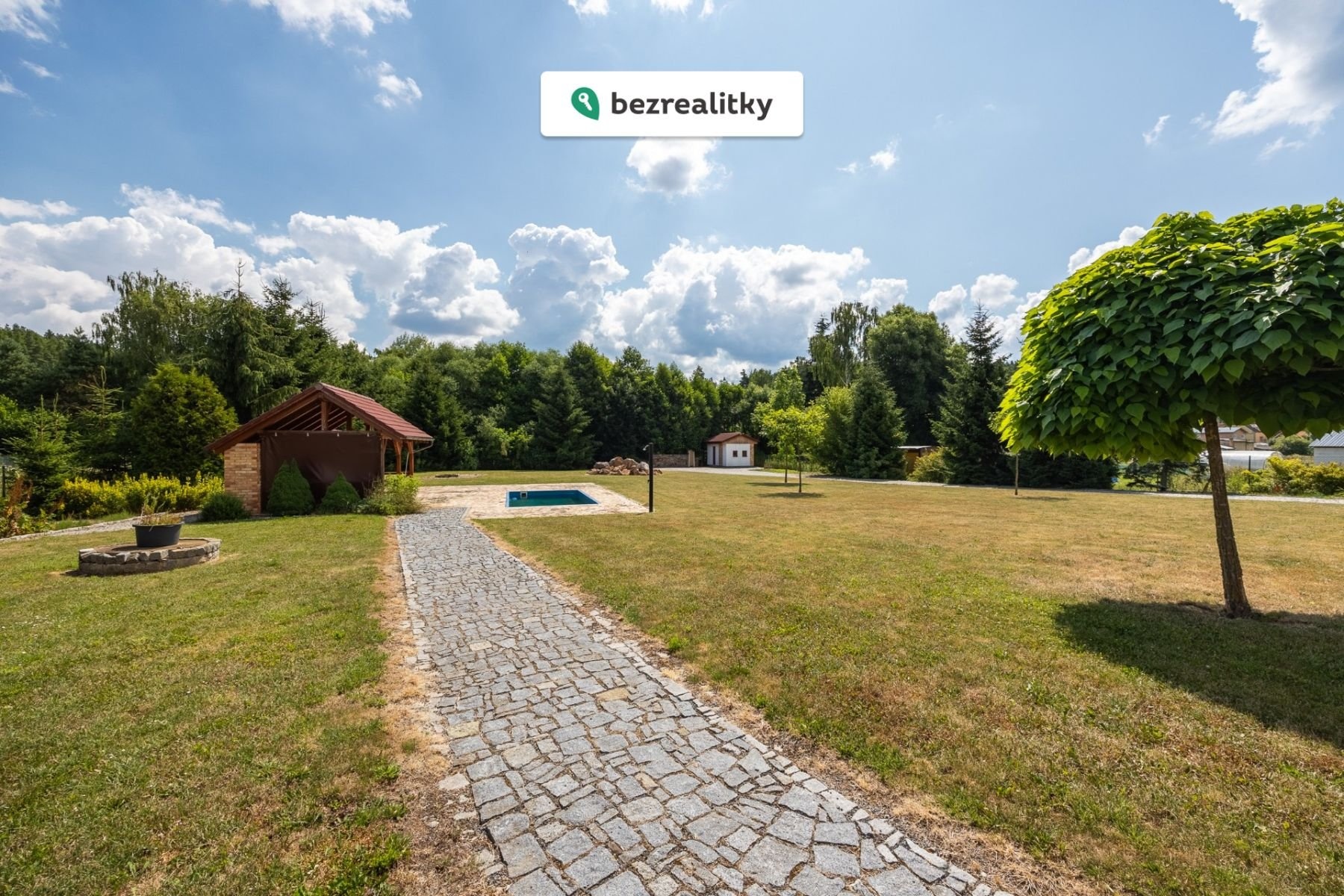 Součástí udržované zahrady je bazén a vlastní vrt s úpravnou vody. U bazénu se nachází kryté posezení s venkovní kuchyní. Na zpevněných částech pozemku byly velmi vkusně využity žulové kostky.