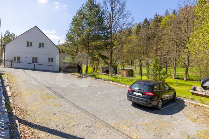 U vchodu vlastní prostorné parkoviště a sklad zahradní techniky. V zázemí za domem je zastřešená terasa s posezením, ohništěm, elektřinou a vodovodem, finská sauna, venkovní sprcha, volejbalové a dětské hřiště. Vše vybaveno osvětlením. Všude kolem je vlastní prostorný zatravněný pozemek. Jeho zadní hranici lemuje Bělokamenný potok, průzračná bystřina pro osvěžení i zábavu.