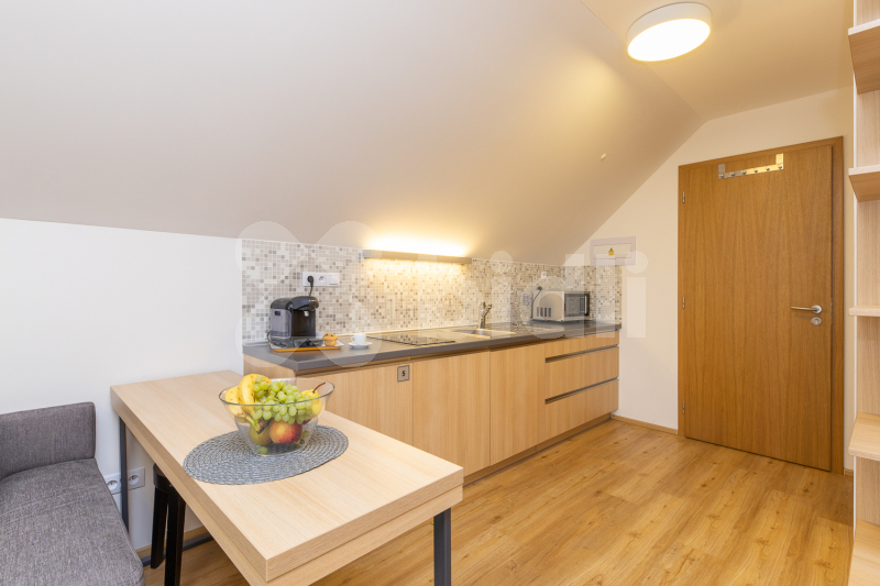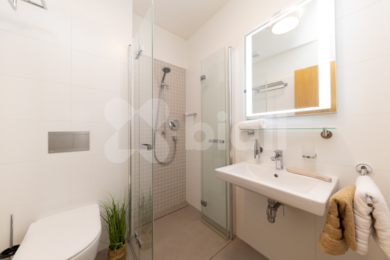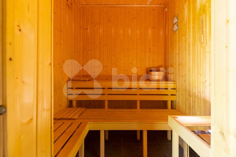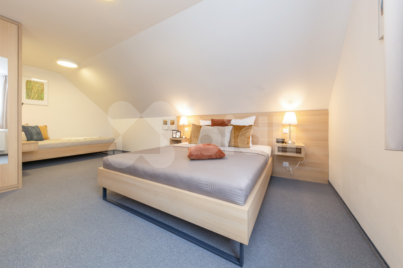 Dokonalému dispozičnímu řešení nemovitosti odpovídá i její nadstandardní vybavení. V přízemí umístněná společenská místnost s úžasným výhledem, kuchyní, krbem, velkoplošnou TV i dataprojektorem s plátnem. Moderní a prostorné pokoje, dva dvoulůžkové, jeden třílůžkový, jeden čtyřlůžkový, každý s vlastním WC a sprchovým koutem. V podkroví je hala s posezením, dva komfortní apartmány 2+kk zařízené pohodlným kvalitním nábytkem, kuchyní a sociálním zázemím. Také diskrétní přístup do půdního prostoru s osvětlením. Ve všech pokojích Smart TV i minibar a v celém objektu Wifi připojení. Celková kapacita ubytování je 20 osob. Nejníže, přesto na úrovni pozemku je stylový historický vinný sklípek, lyžárna kde oceníte vysoušeče obuvi, uzamykatelné skříňky, nebo pro cyklisty možnost úschovy jízdních kol. Přístup do tohoto zázemí je přímo z pozemku, nebo po vnitřním schodišti z chodby v přízemí. Vedle sklad a technická místnost, kde moderní kombinovaný kotel na tuhá paliva s automatickým dávkováním zajišťuje komfort ústředním vytápěním. Pro letní období, nebo jako záložní zdroj slouží plynový kotel na PB.