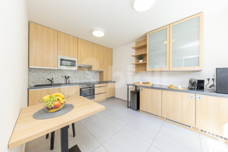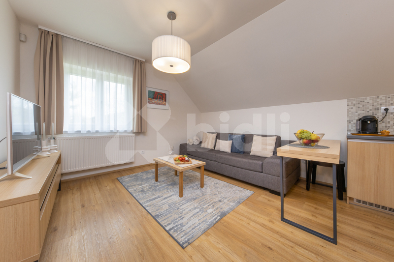 Dokonalému dispozičnímu řešení nemovitosti odpovídá i její nadstandardní vybavení. V přízemí umístněná společenská místnost s úžasným výhledem, kuchyní, krbem, velkoplošnou TV i dataprojektorem s plátnem. Moderní a prostorné pokoje, dva dvoulůžkové, jeden třílůžkový, jeden čtyřlůžkový, každý s vlastním WC a sprchovým koutem. V podkroví je hala s posezením, dva komfortní apartmány 2+kk zařízené pohodlným kvalitním nábytkem, kuchyní a sociálním zázemím. Také diskrétní přístup do půdního prostoru s osvětlením. Ve všech pokojích Smart TV i minibar a v celém objektu Wifi připojení. Celková kapacita ubytování je 20 osob. Nejníže, přesto na úrovni pozemku je stylový historický vinný sklípek, lyžárna kde oceníte vysoušeče obuvi, uzamykatelné skříňky, nebo pro cyklisty možnost úschovy jízdních kol. Přístup do tohoto zázemí je přímo z pozemku, nebo po vnitřním schodišti z chodby v přízemí. Vedle sklad a technická místnost, kde moderní kombinovaný kotel na tuhá paliva s automatickým dávkováním zajišťuje komfort ústředním vytápěním. Pro letní období, nebo jako záložní zdroj slouží plynový kotel na PB.