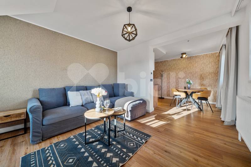 Prodává se včetně zařízení (Kuchyňská linka s vestavěnými spotřebiči, jídelní stůl, židle, rozkládací sedací souprava, konferenční stolek, manželská postel).