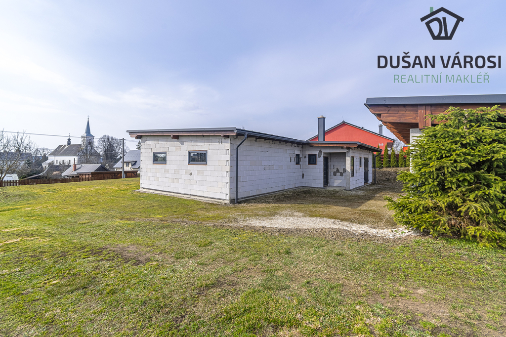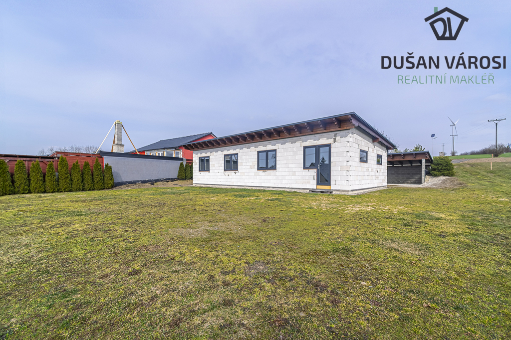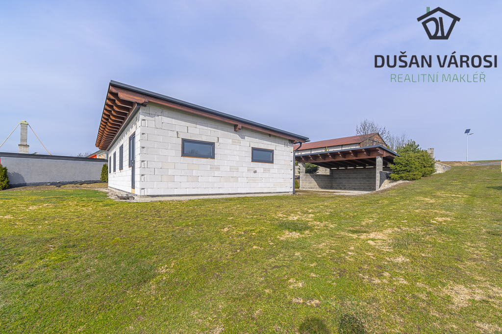 Hrubá stavba jednopodlažního rodinného domu 4+KK s možností dokončení na klíč. Součástí domu je i dvougaráž. Stavba se nachází na pozemku o rozloze 899m2 s přístupem po obecních cestách. V tuto chvíli je cesta připravená - zpevněná. Po dokončení stavby bude položen asfalt (to zajistí obec). Na hranici pozemku je sloup vedení nízkého napětí. Voda bude zajištěna z vlastní studny. Odvod splaškových vod je dotovaný obcí pří zřízení čističky odpadních vod. Plyn není v dosahu. Stavební povolení bylo vydáno v listopadu 2018, není tedy nutná fotovoltaická elektrárna, tepelné čerpadlo, rekuperace ani retenční nádrž na dešťovou vodu. (Celkově tedy nižší náklady na dostavbu domu.) Dům je orientovaný jižně.
