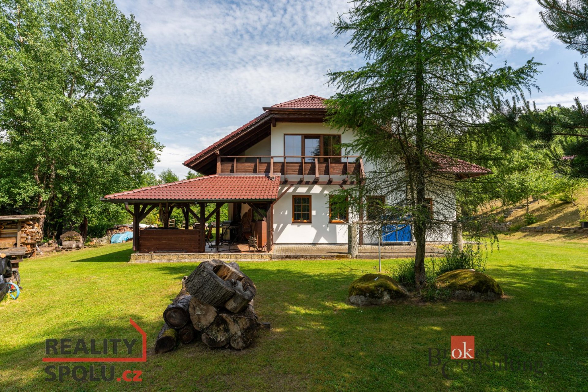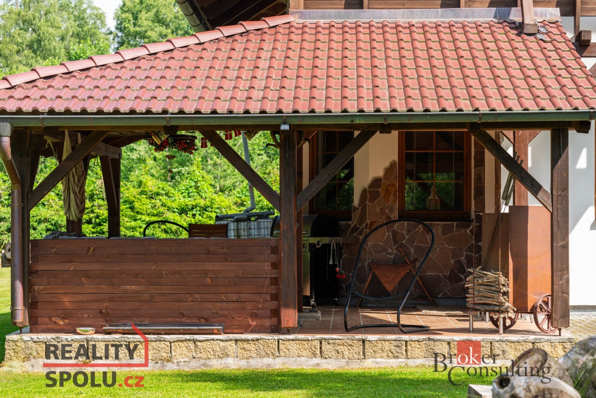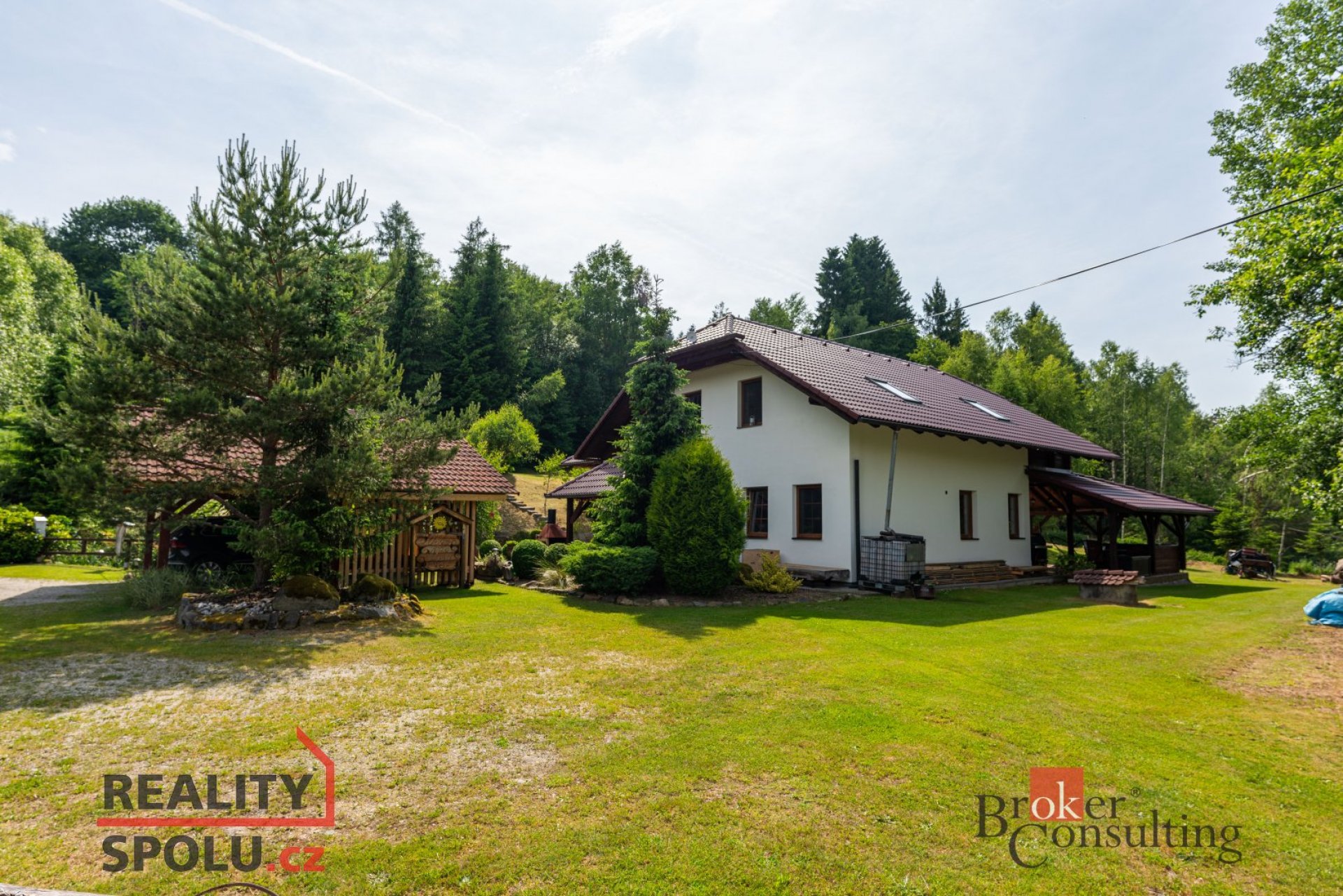 Dům obklopuje vzrostlá zeleň, která poskytuje vysokou míru soukromí. Součástí zahrady je útulná terasa s posezením a grilem, přístřešek pro parkování dvou aut a jezírko s molem.