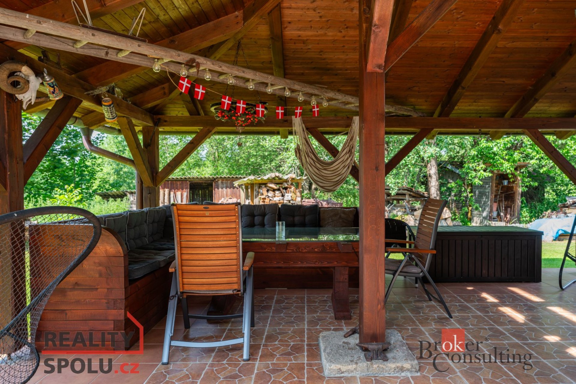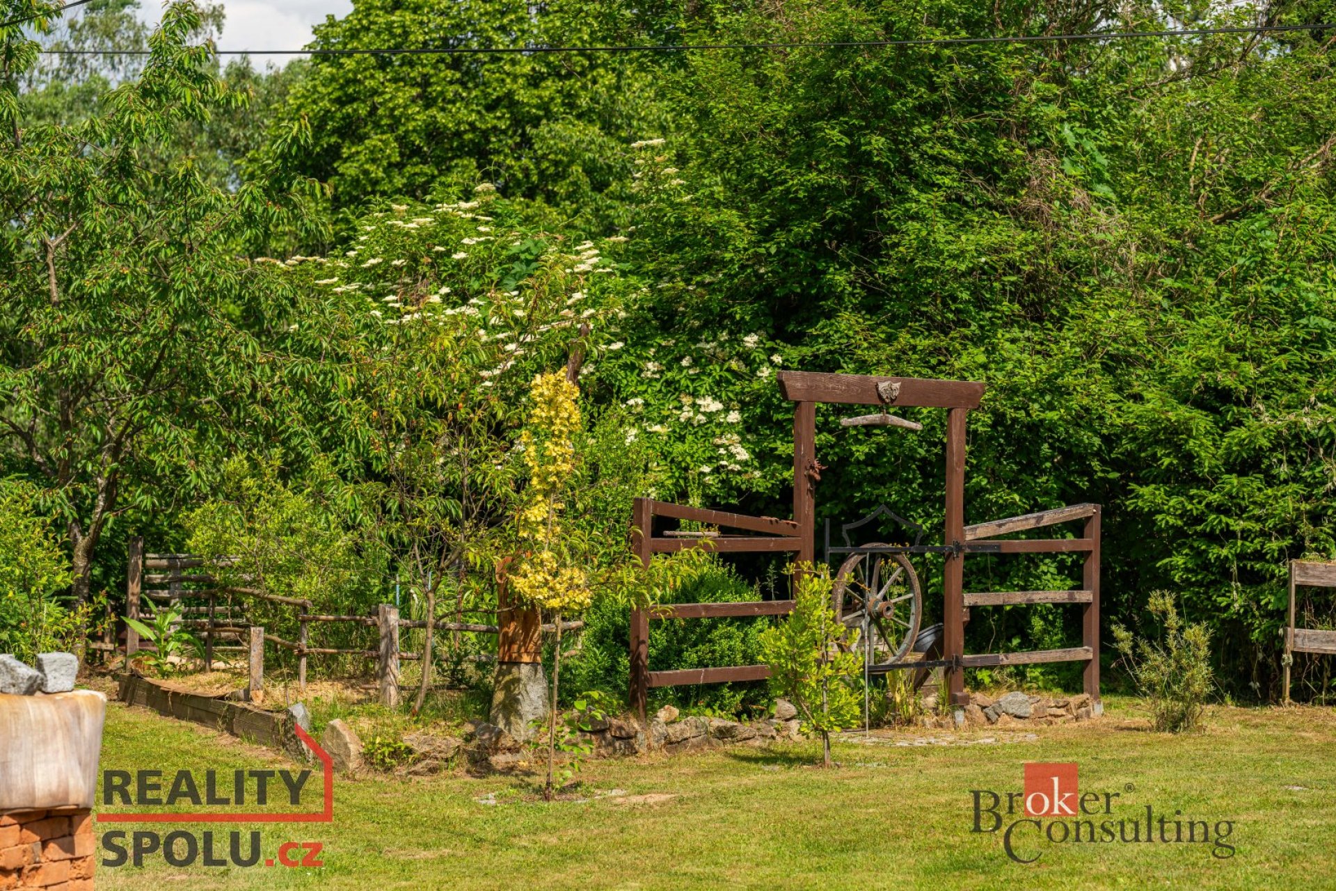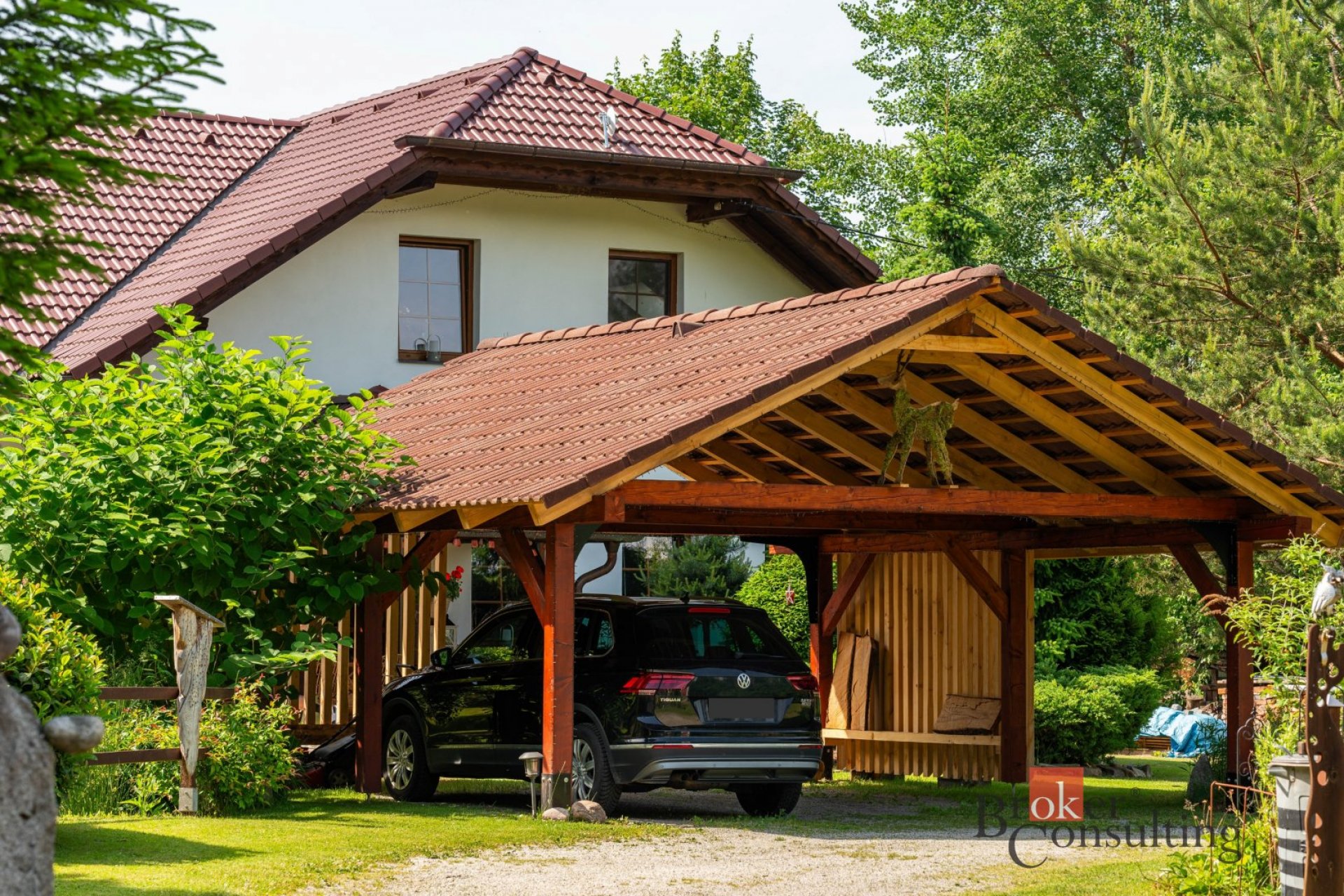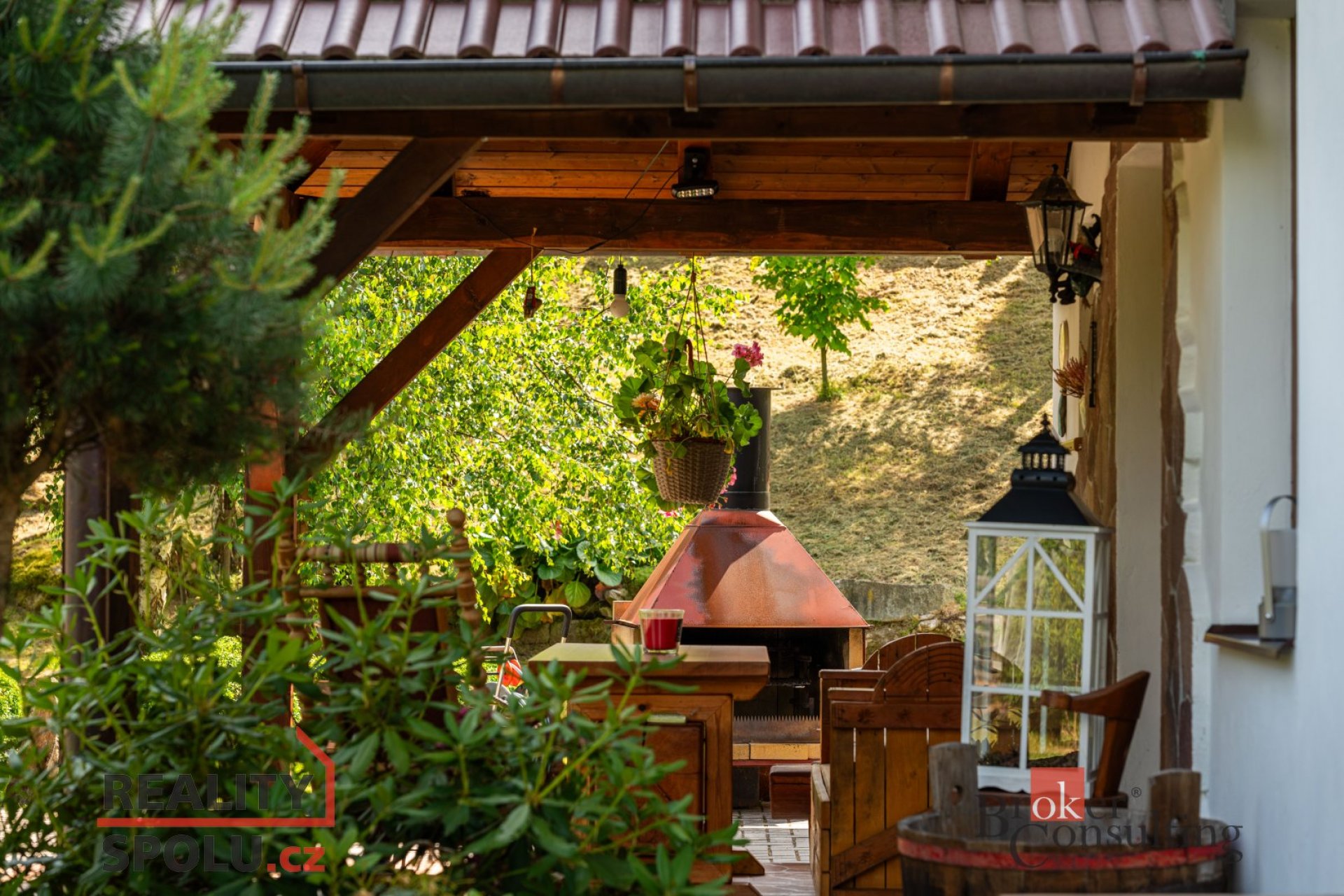 Dům obklopuje vzrostlá zeleň, která poskytuje vysokou míru soukromí. Součástí zahrady je útulná terasa s posezením a grilem, přístřešek pro parkování dvou aut a jezírko s molem.