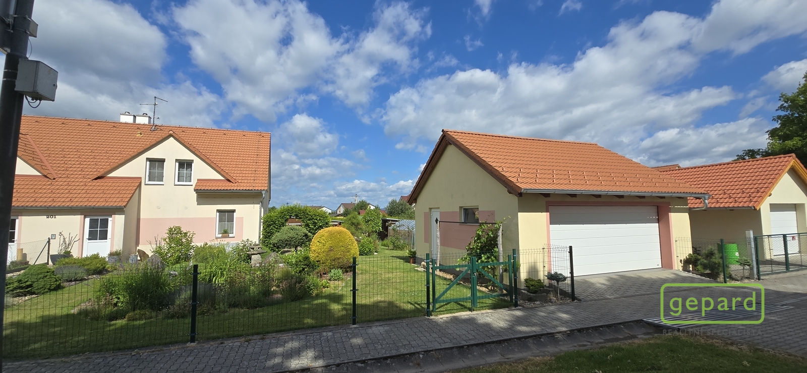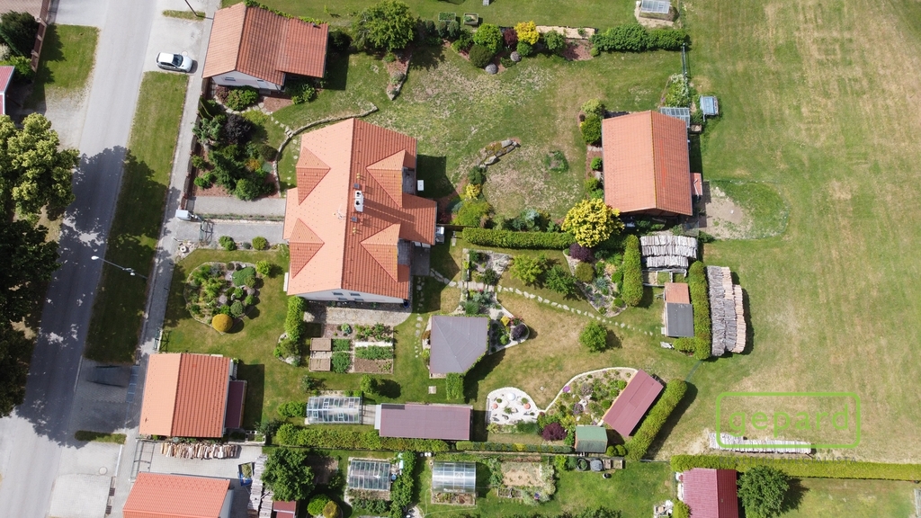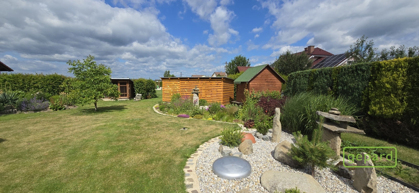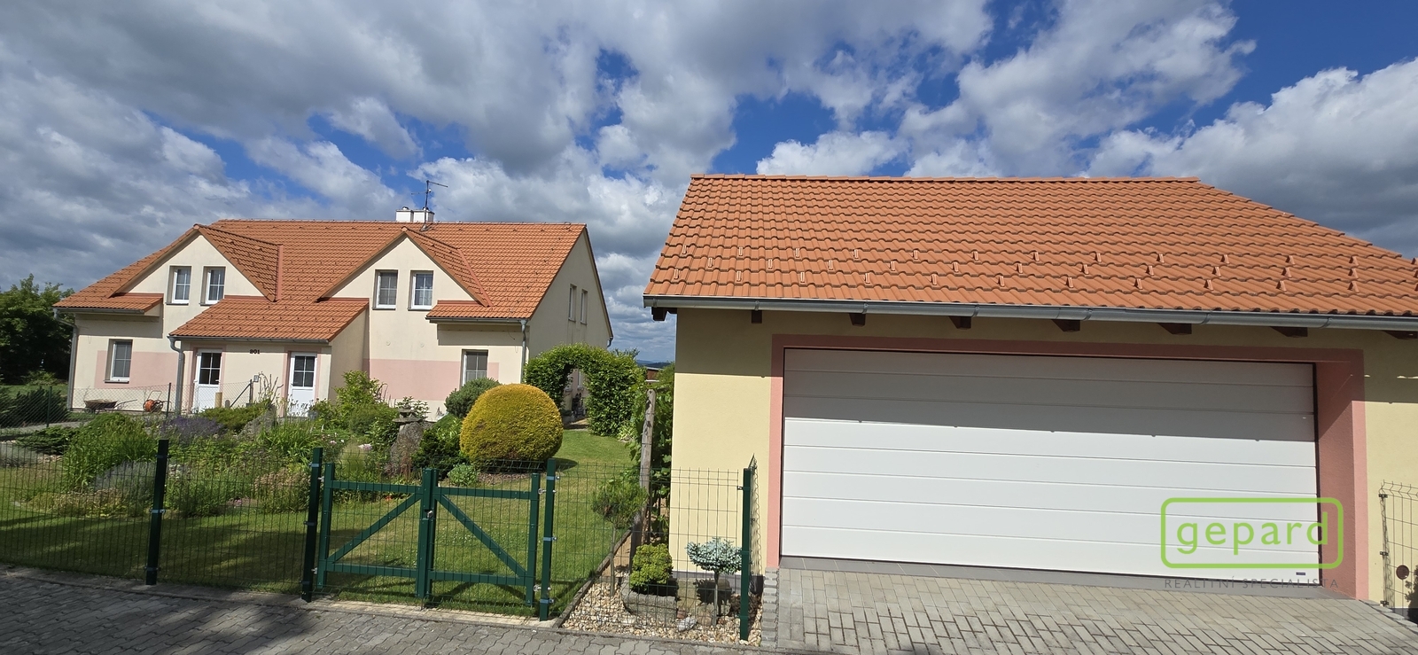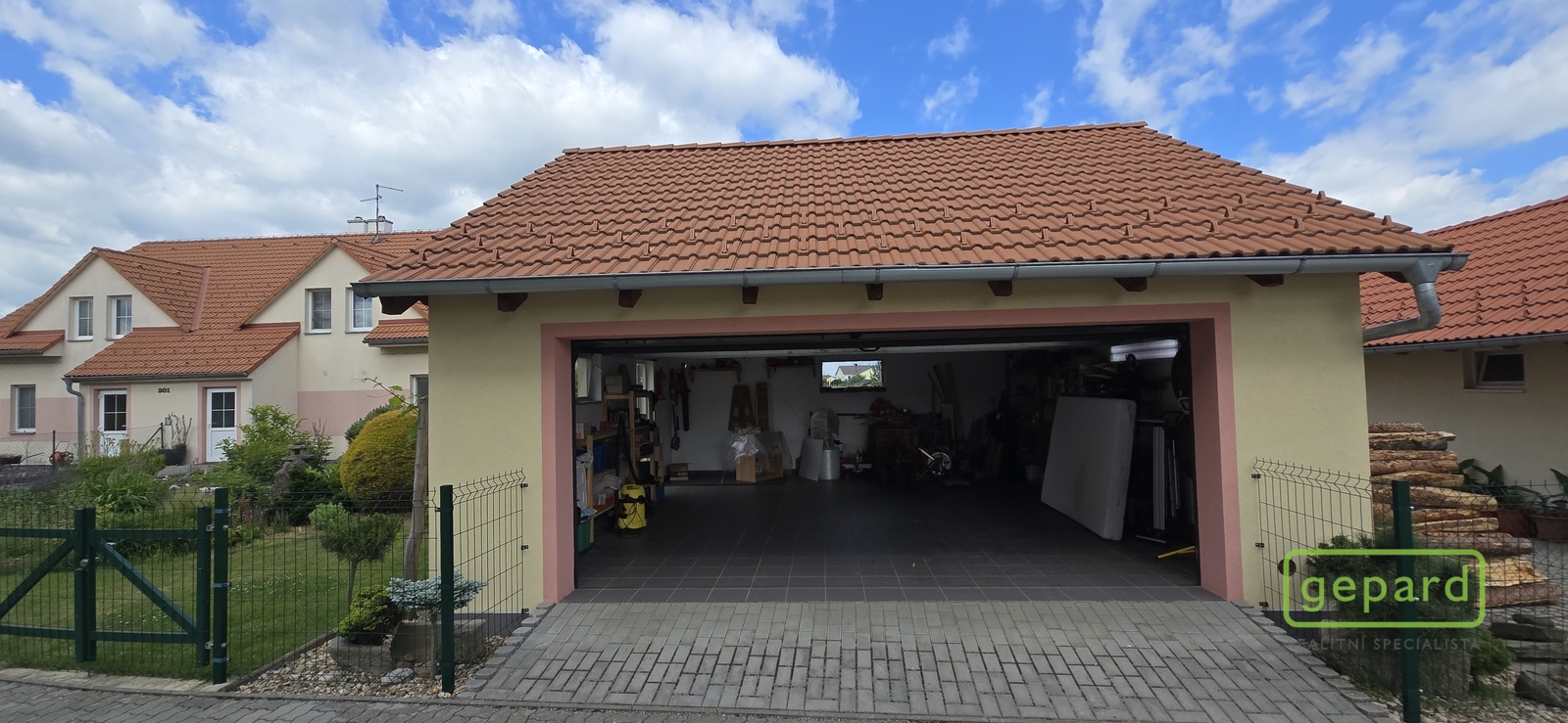 Na zahradě je k dispozici pergola, přístřešek, stavba na nářadí, skleník, okrasné dřeviny, květiny a je celý oplocený. Dále se v rohu pozemku u hlavní cesty nachází velká zděná dvojgaráž o zastavěné ploše 49m2, do které se dá vejít dveřmi přímo ze zahrady a vjíždí se do ní z obecní komunikace skrze rolovací vrata na dálkové ovládání.