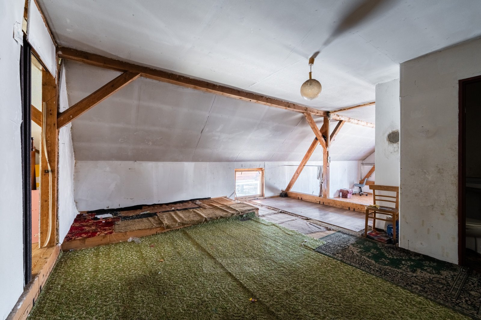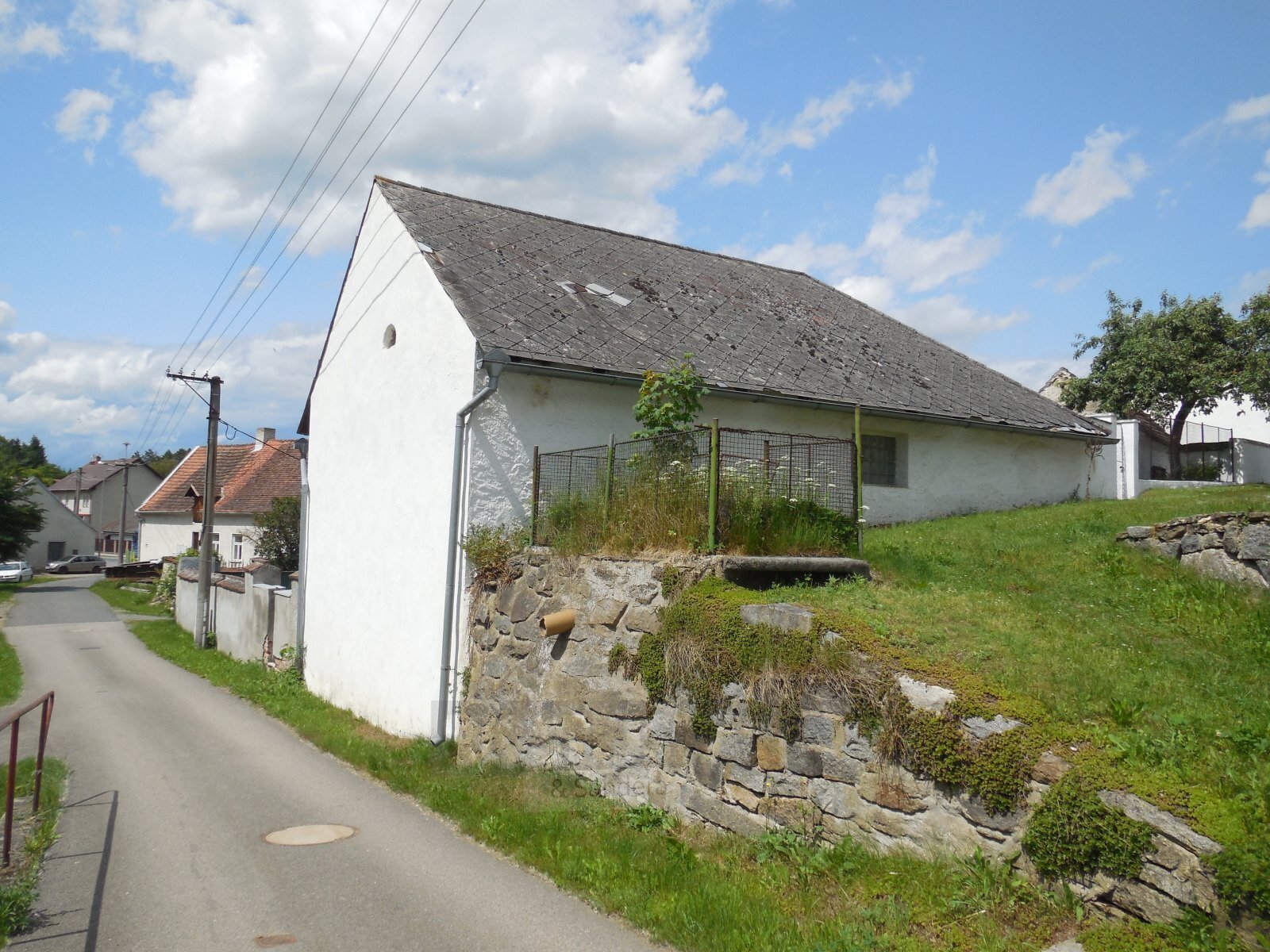 hospodářská část - garážový prostor s vraty, bez pevného stropu do půdního prostoru (pouze položená prkna).
