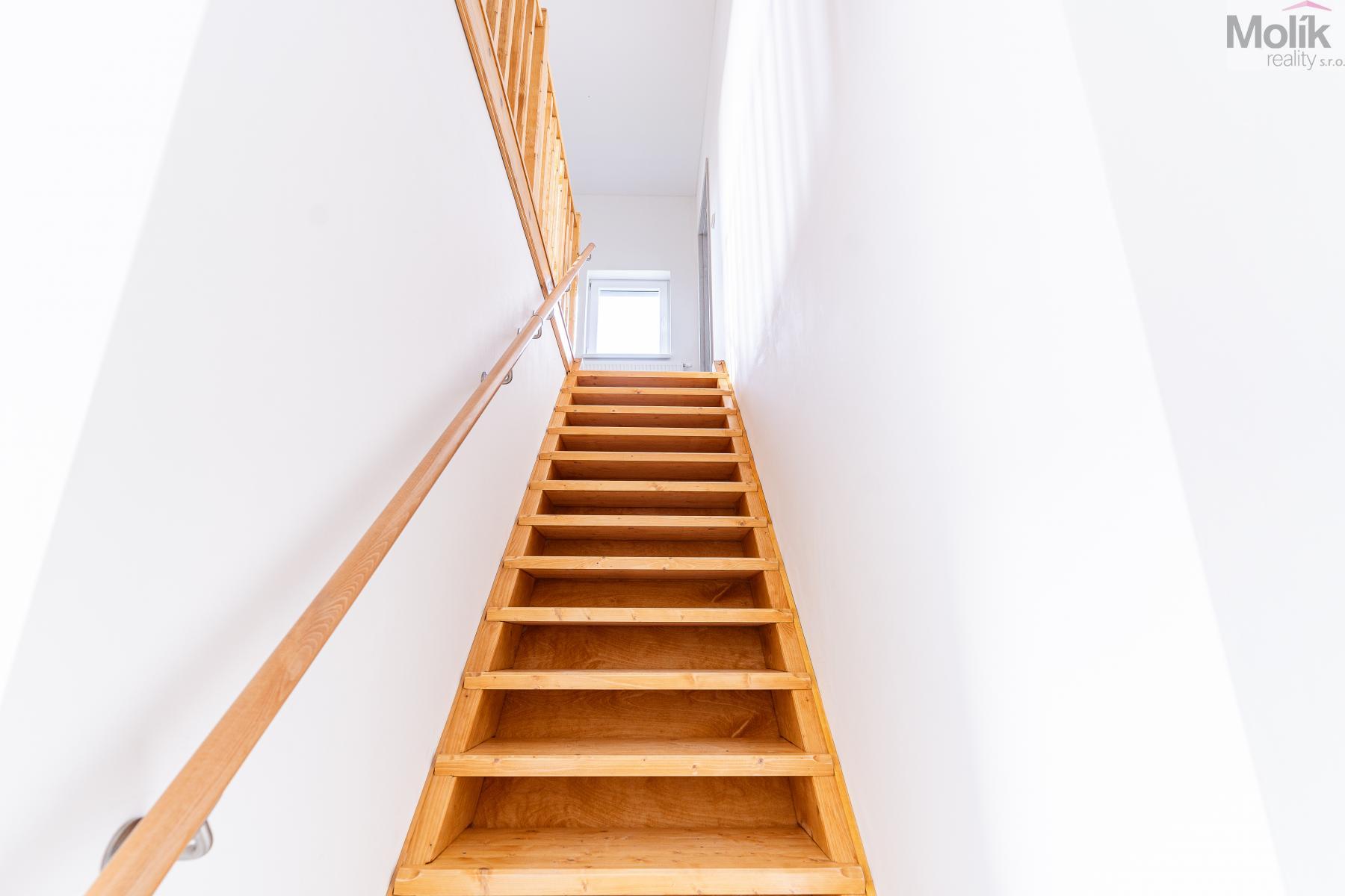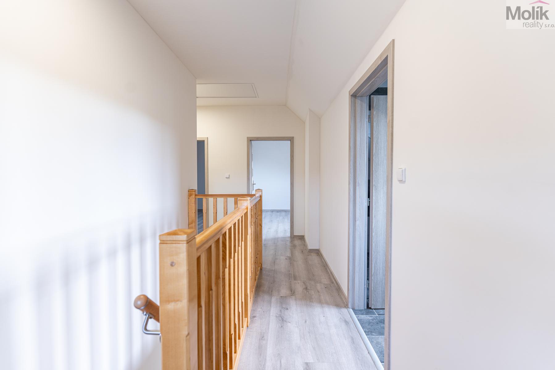 V horní části domu se nachází 3 pokoje, koupelna a technická místnost.