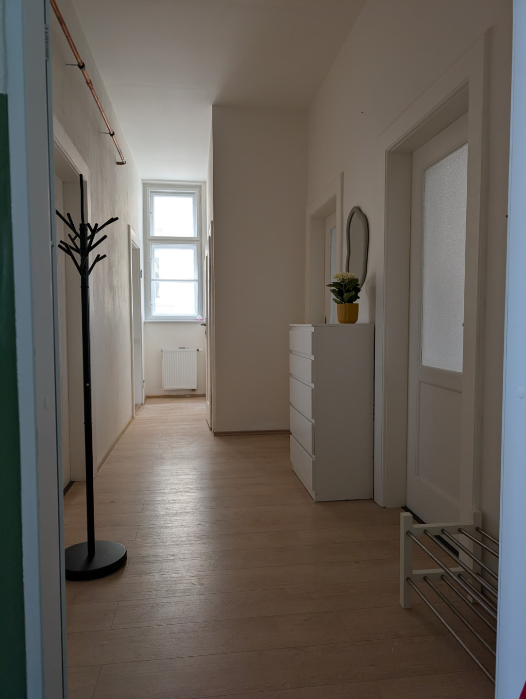 Dispozice bytu nabízí praktické a pohodlné řešení – prostorný obývací pokoj, samostatnou kuchyň se spíží, útulnou ložnici a moderní koupelnu. Díky vysokým stropům a velkým oknům jsou všechny místnosti světlé, vzdušné a působí velmi příjemně.