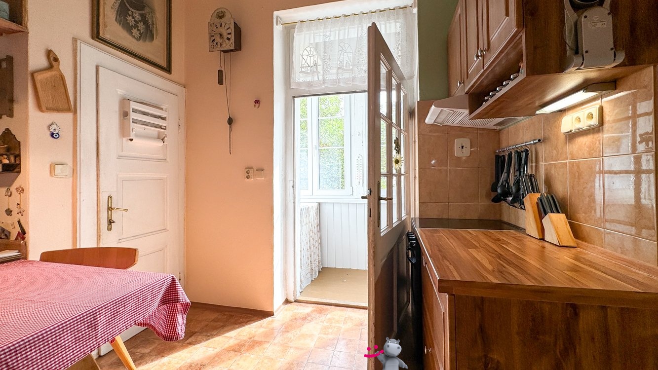 Byt je situovaný do 2.patra cihlového domu bez výtahu. Z dlouhé chodby se vchází do jednotlivých místností, které nabízí opravdu velký prostor a zároveň obývací pokoj a další dva pokoje jsou průchozí. Z kuchyně se vchází do zadní menší místnosti a také na lodžii, která je zasklená.