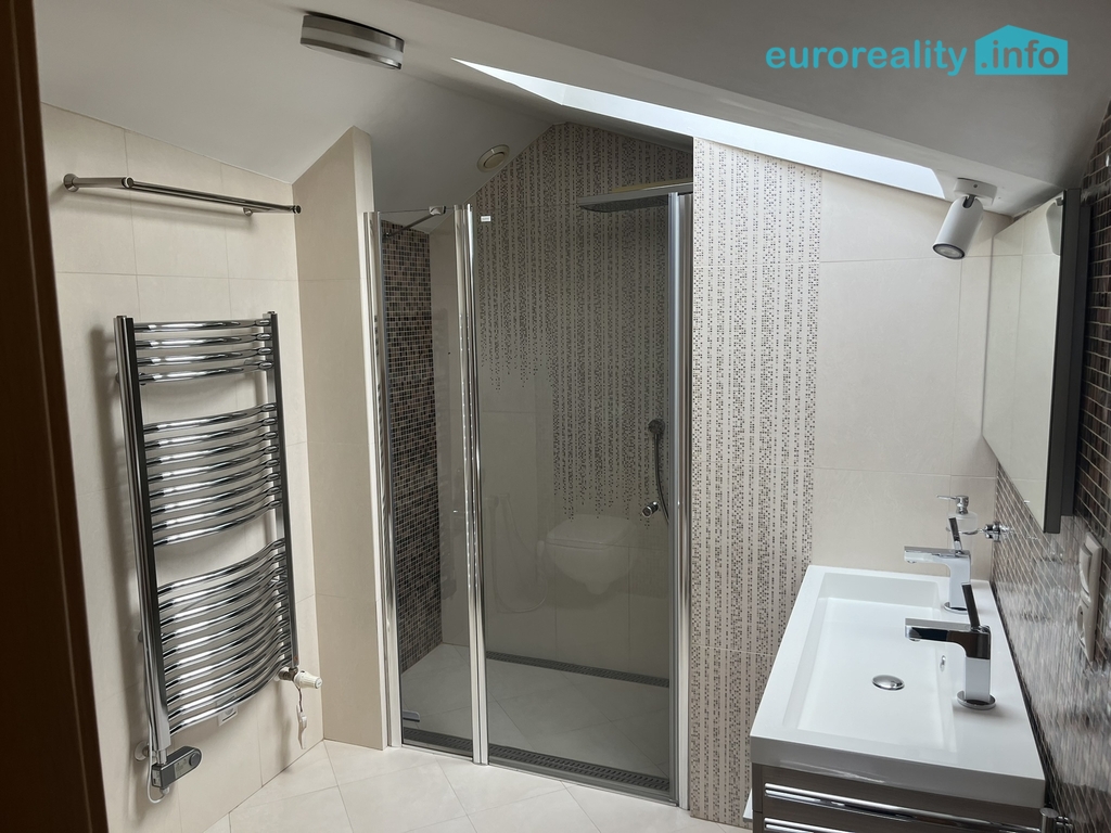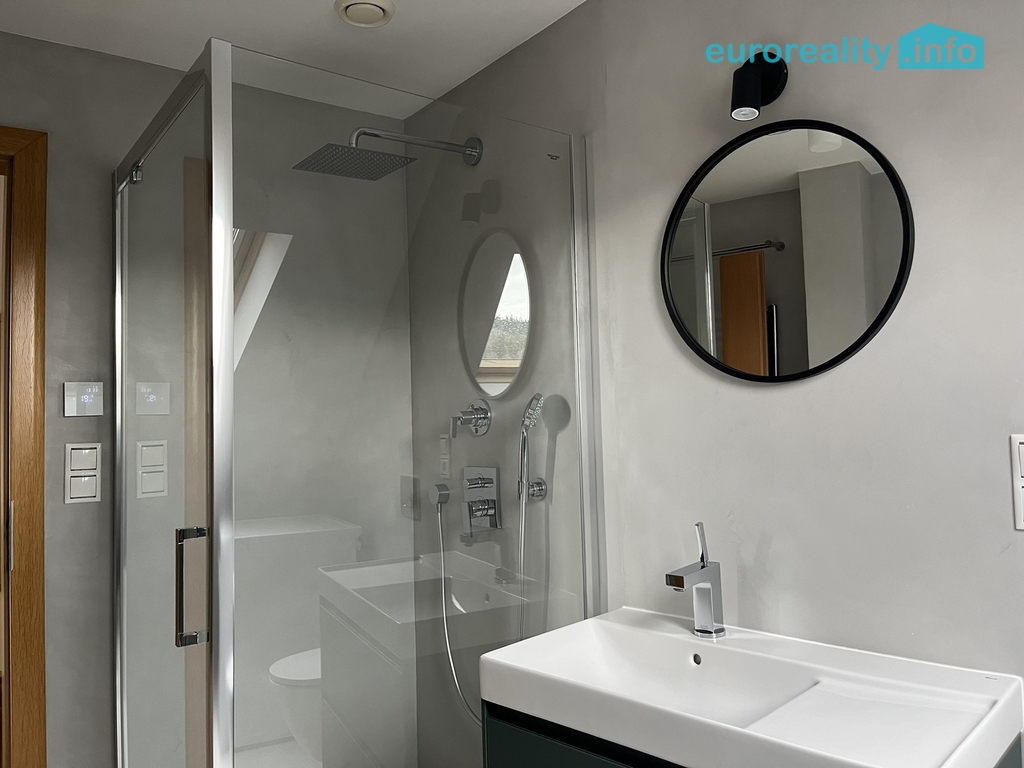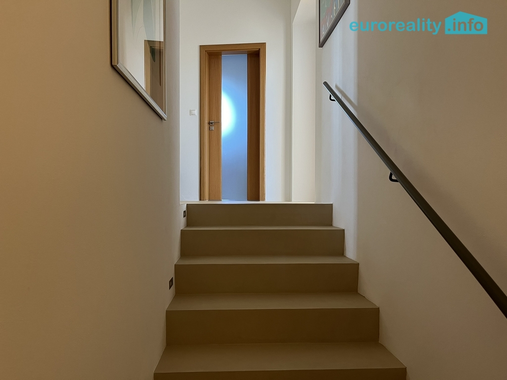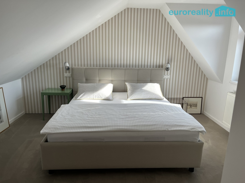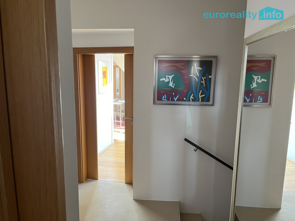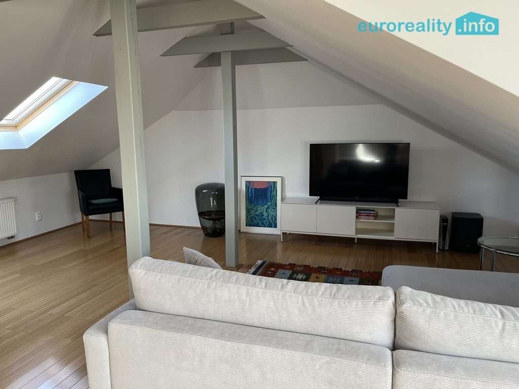 Hlavní obytný prostor tvoří obývací pokoj s kuchyňským koutem a krbovými kamny, odkud je vstup na terasu o velikosti 10 m² s výhledem do zeleně - ideální pro večírek s přáteli, či rodinou, i pro poklidné ráno se snídaní na terase. V dolní části bytu se dále nachází ložnice, koupelna s vanou a toaletou a samostatná předsíň. Z předsíně vede schodiště do horního patra, kde je otevřený prostor s velkým oknem, aktuálně rozdělený na pracovnu, knihovnu a další ložnici. Součástí tohoto prostoru je druhá koupelna se sprchovým koutem, umyvadlem a toaletou.