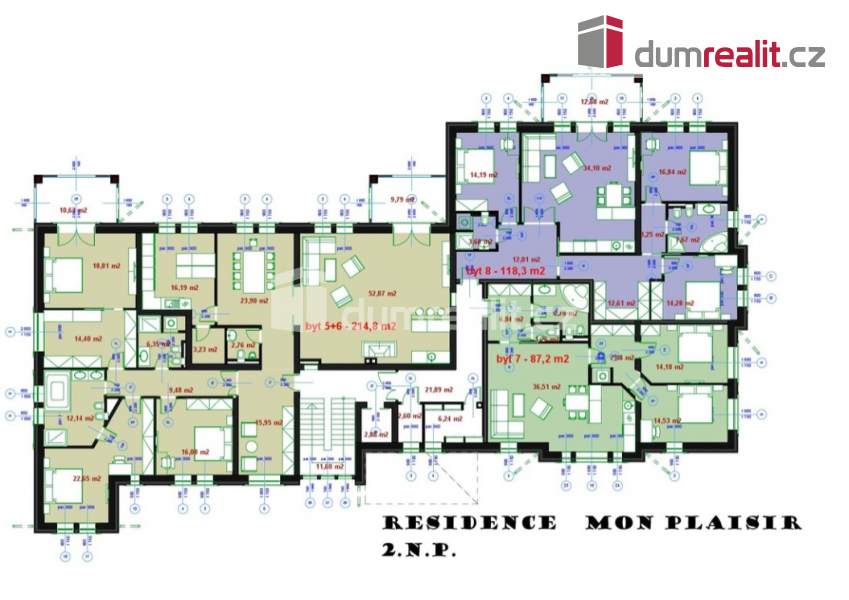 Naše společnost Vám zprostředkuje prodej luxusních bytových jenotek a apartamentů v residenci Mon Plaisir v Mariánských Lázních. Objekt je koncipován tak, aby uspokojil požadavky nejnáročnějšího klienta. Chtěli jsme pro Vás připravit něco výjimečného, proto jsme hledali lokalitu, která je v docházkové vzdálenosti do 15 min od hlavní kolonády a zároveň v plné míře nabízí to, co je pro Mariánské Lázně nejcennější – klidný pobyt uprostřed parků na čistém vzduchu překypujícím kyslíkem. Našli jsme místo u soutoku Úšovického a Třebízského potoka v lokalitě zvané Lunapark. Zde je stavební pozemek s původním historickým vodojemem zásobujícím dříve Mariánské Lázně pitnou vodou. Klenuté stropy vodojemu zachováváme jako historickou památku v podzemí novostavby residence. Příjezd vede po málo frekventované Třebízského ulici vedoucí směrem k obci Prameny. Pěší přístup do centra města vede lesoparkem po asfaltových cestách Třebízského ulicí kolem hotelu Parkhotel Saint Moritz ( kompletní balneoprovoz, bazén a restaurační provoz), Městského divadla N.V. Gogola na Hlavní třídu. Souběžně s ní je možné využít i druhou cestu – Chopinovo ulici vedoucí kolem tenisového areálu s lanovým centrem, hudební školy a hotelu Reitenberg na hlavní Kolonádu. Vydat se je možné i pěší upravenou parkovou cestou podél potoka a přes kolonádu Lesního pramene. Dům s výraznou architekturou nabízí ve čtyřech nadzemních podlažích 15 nadstandardních bytů odlišných velikostí a dispozičním řešení od plochy 78 m² do 215 m². Byty umístěné v 3. patře jsou řešeny jako mezonetové. Většina bytů má vlastní balkony s výhledem na okolní krajinu. V 1.PP se nachází garáže pro 11 osobních vozidel, wellness a krytý bazén. V objektu je osobní výtah. V historickém sklepě vodojemu je 15 chladných nevytápěných komor. Obytná podlaží a garáž jsou propojená domovním schodištěm a osobním výtahem. Pozemek domu poskytuje jak možnost rekreace na jeho jižní straně, tak dostatek parkovacích míst na straně severní. Doporučujeme. Ev. číslo: 626203.