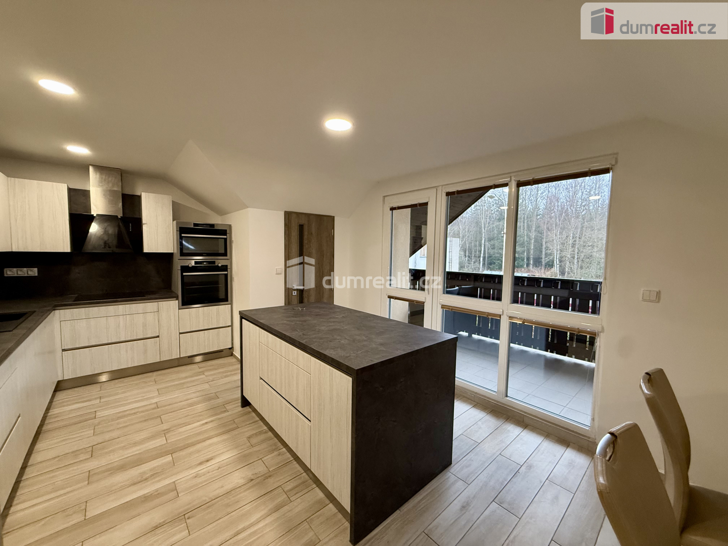 Popis vybavení:V bytě se nachází kuchyňská linka s varným ostrůvkem se spotřebiči značky AEG (digestoř, sklokeramická deska, vestavěná mikrovlná trouba, horkovzdušná trouba, myčka nádobí). Byt je pouze částečně vyba