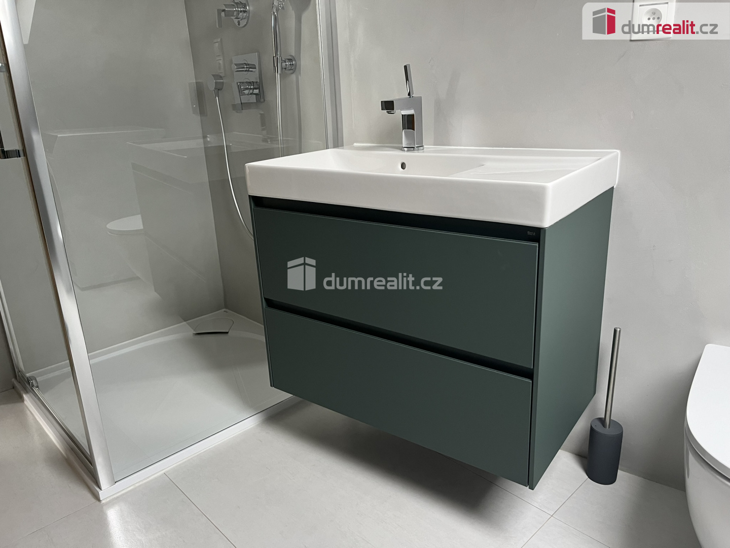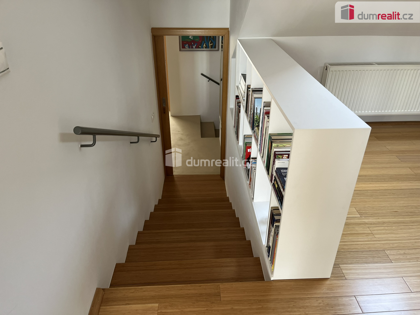 Další pokoj je přístupný z předsíně kdy se po schodech vchází do otevřeného prostoru s výrazným oknem, prostorný pokoj, který rozdělen na část s pracovnou a knihovnou a dále na další ložnici. V této části bytu je k dispozici druhá koupelna se sprchovým koutem, umyvadlem a toaletou.