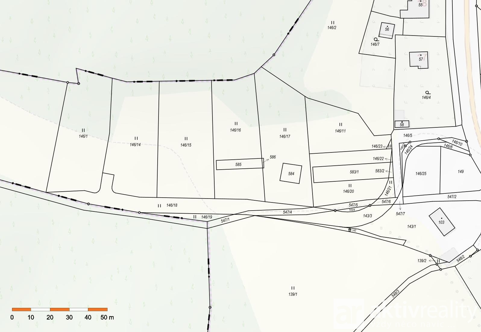 Na přiložené mapě se jedná o pozemek složený ze dvou čísel parcelních: 146/16 + 585. Současně je k prodeji i sousední pozemek o velikosti 1.666 m², složený z parcelních čísel 146/17 + 584 + 586.