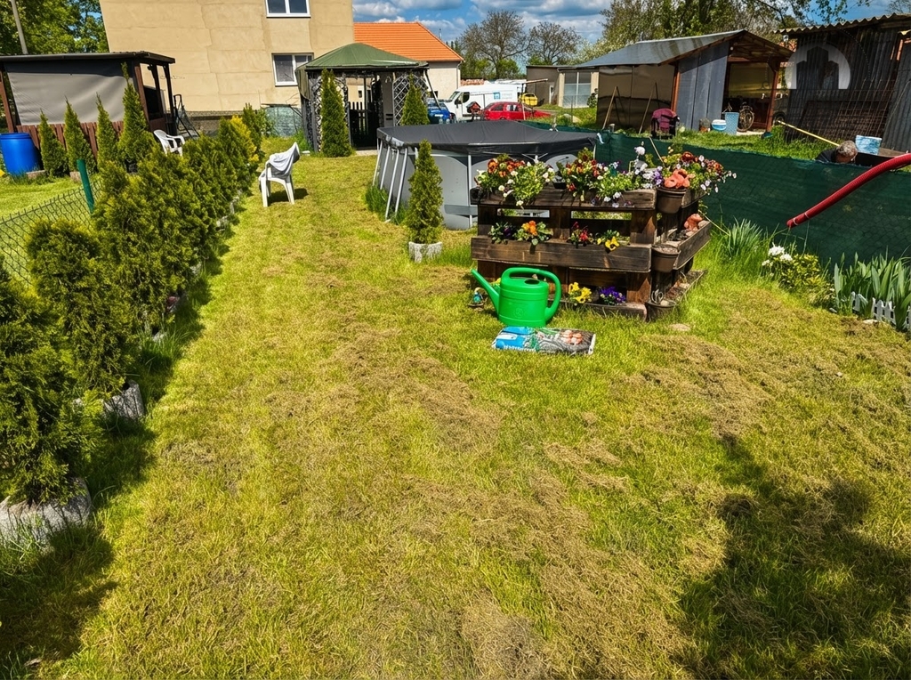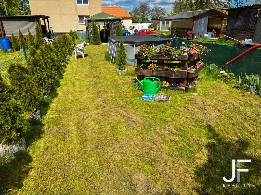 - Podíl na pozemku kolem domu znamená 247 m² vlastního prostoru – současní majitelé jej využívají jako zahrádku s bazénem.