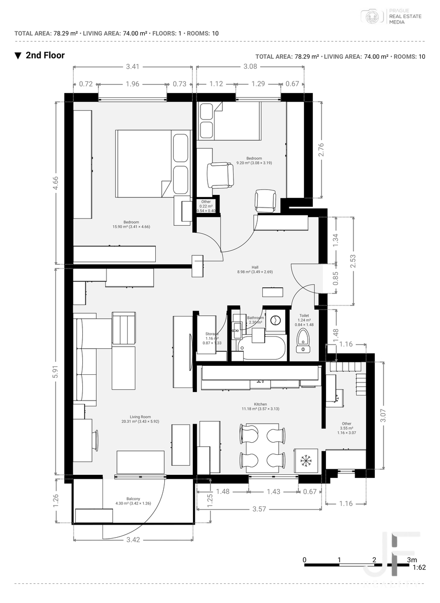 Byt je v 2. nadzemním podlaží - dispozice 3+1 a cca 92 m², k tomu lodžie, sklep, kotelna a hlavně garáž v přízemí domu.