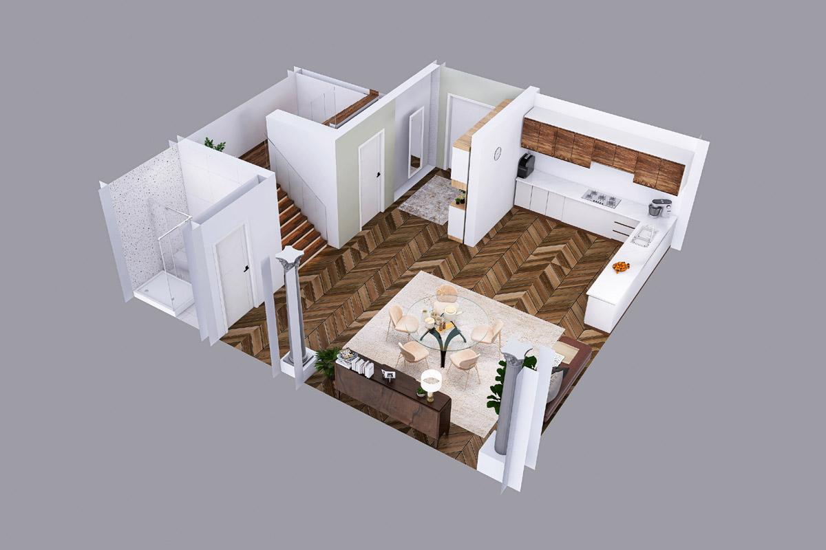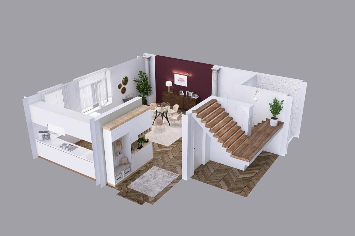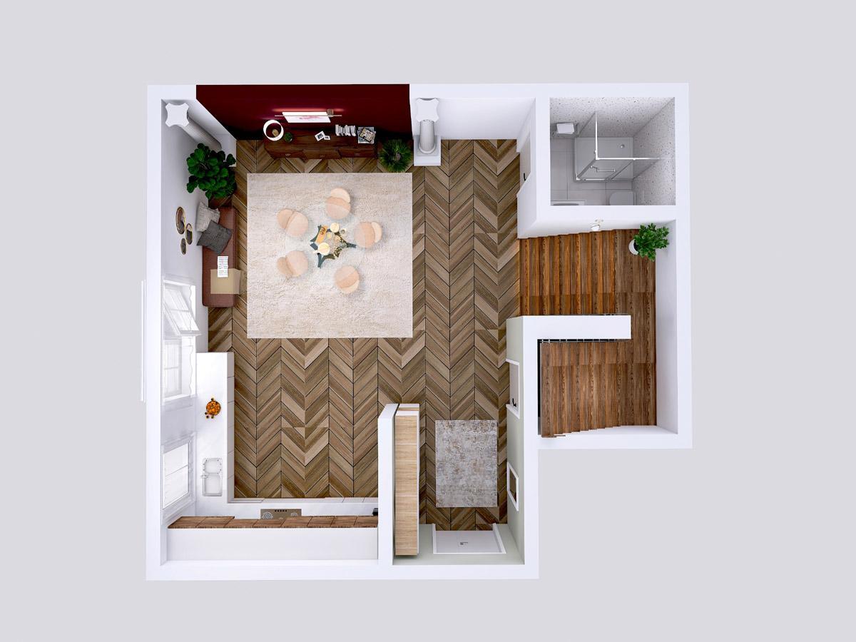 I.NP- 52,2; a sestává ze Zádveří-3,4; Pokoj + kuchyň- 40,5m2; Koupelna č.1 a WC-6,9; Komora-1,5; + b. 1+1 -40; s vlastní kuchyní WC koupelnou s vanou, vchodem z ulice a sklepem. V současnosti stavebně propojen na úrovni přízemí s bytem 5+1 (není na půdorysu ještě zakreslena, propojení dveřmi přes červenou stěnu)