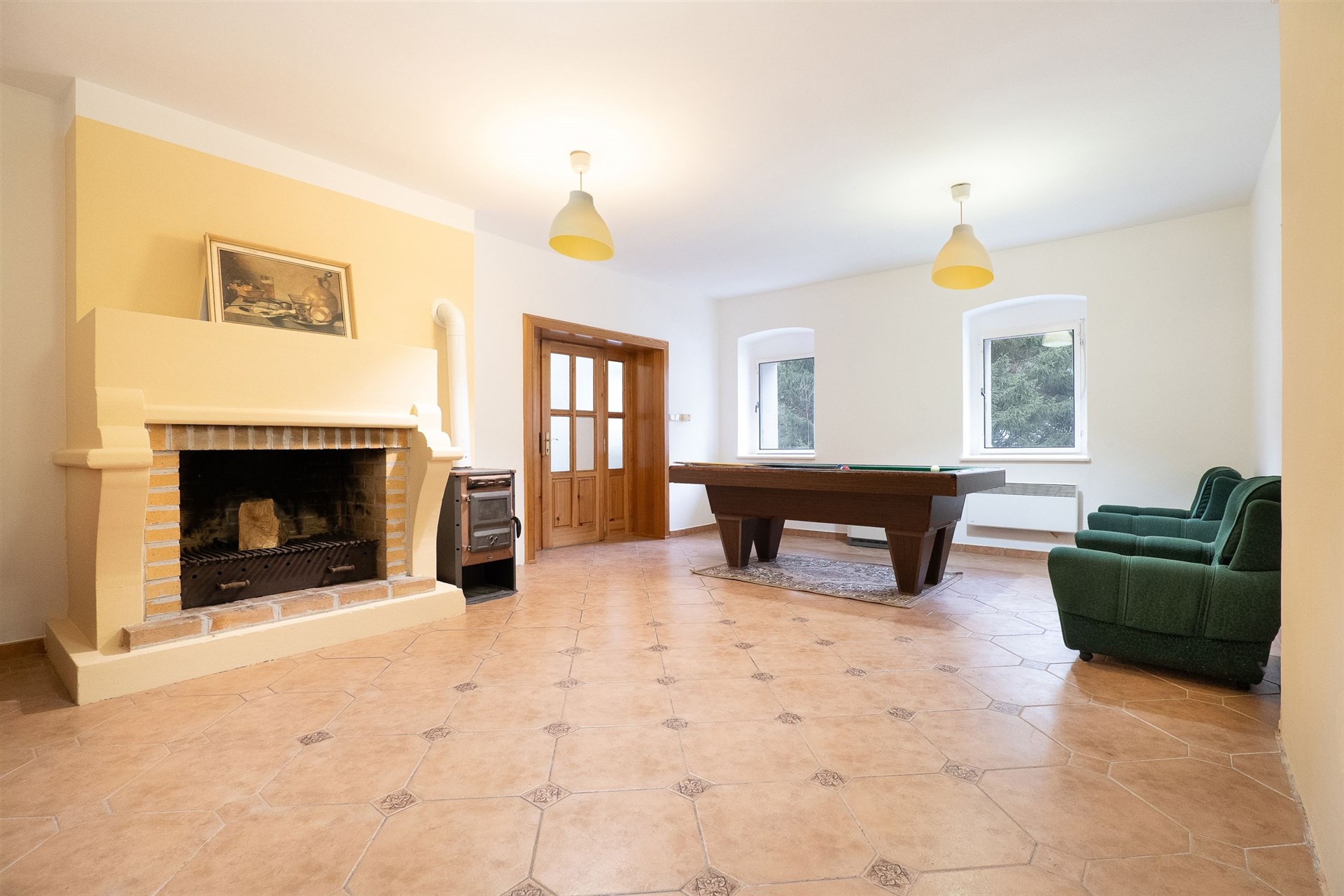 Prostorné společenské místnosti s krbem, kulečníkem ideální pro rodinná setkání