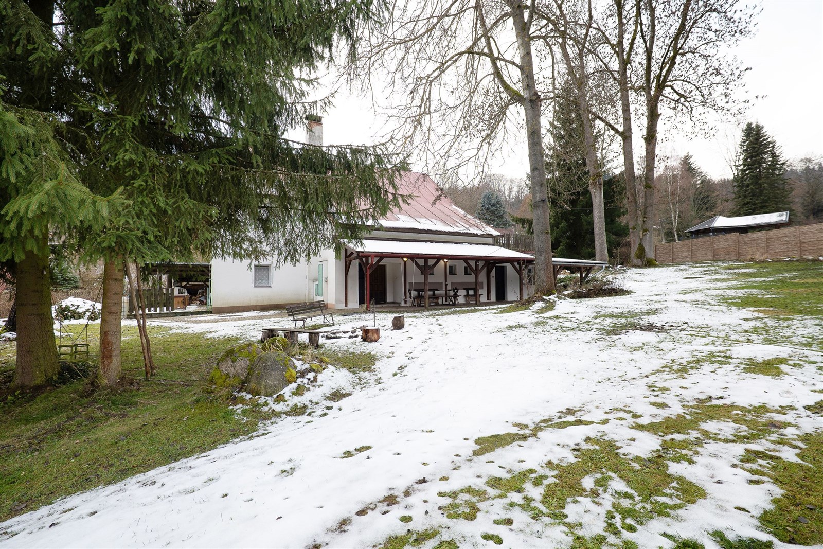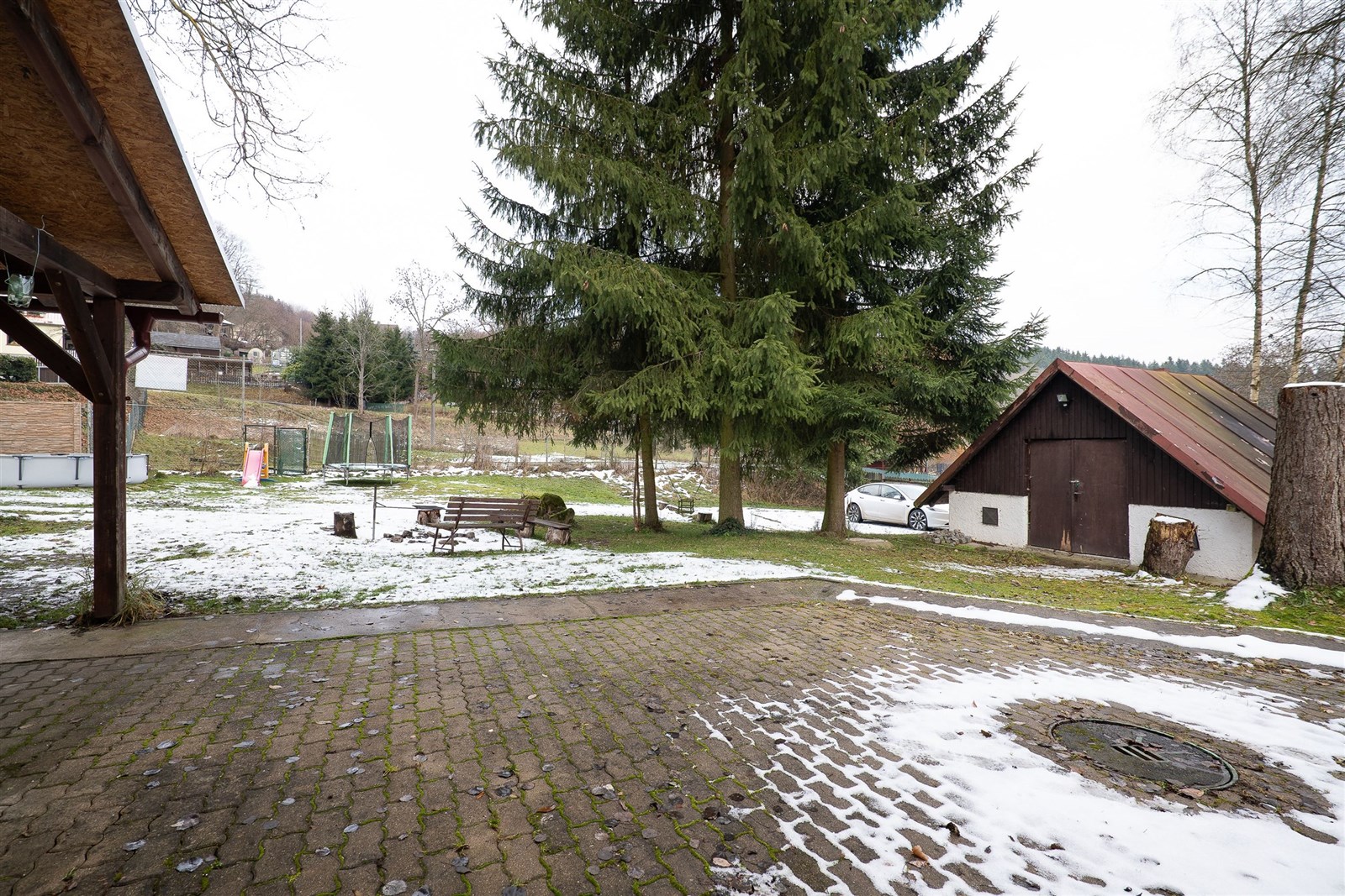 Nemovitost stojí na pozemku o celkové rozloze 1 412 m² se vzrostlými stromy, který nabízí soukromí a klid v přírodě. Rozlehlá zahrada je ideální pro odpočinek, zahrádkaření, dětské hřiště nebo další rozšíření. Parkování pro 5 vozů přímo u domu. Pozemek dále nabízí malý bazén a ohniště.
