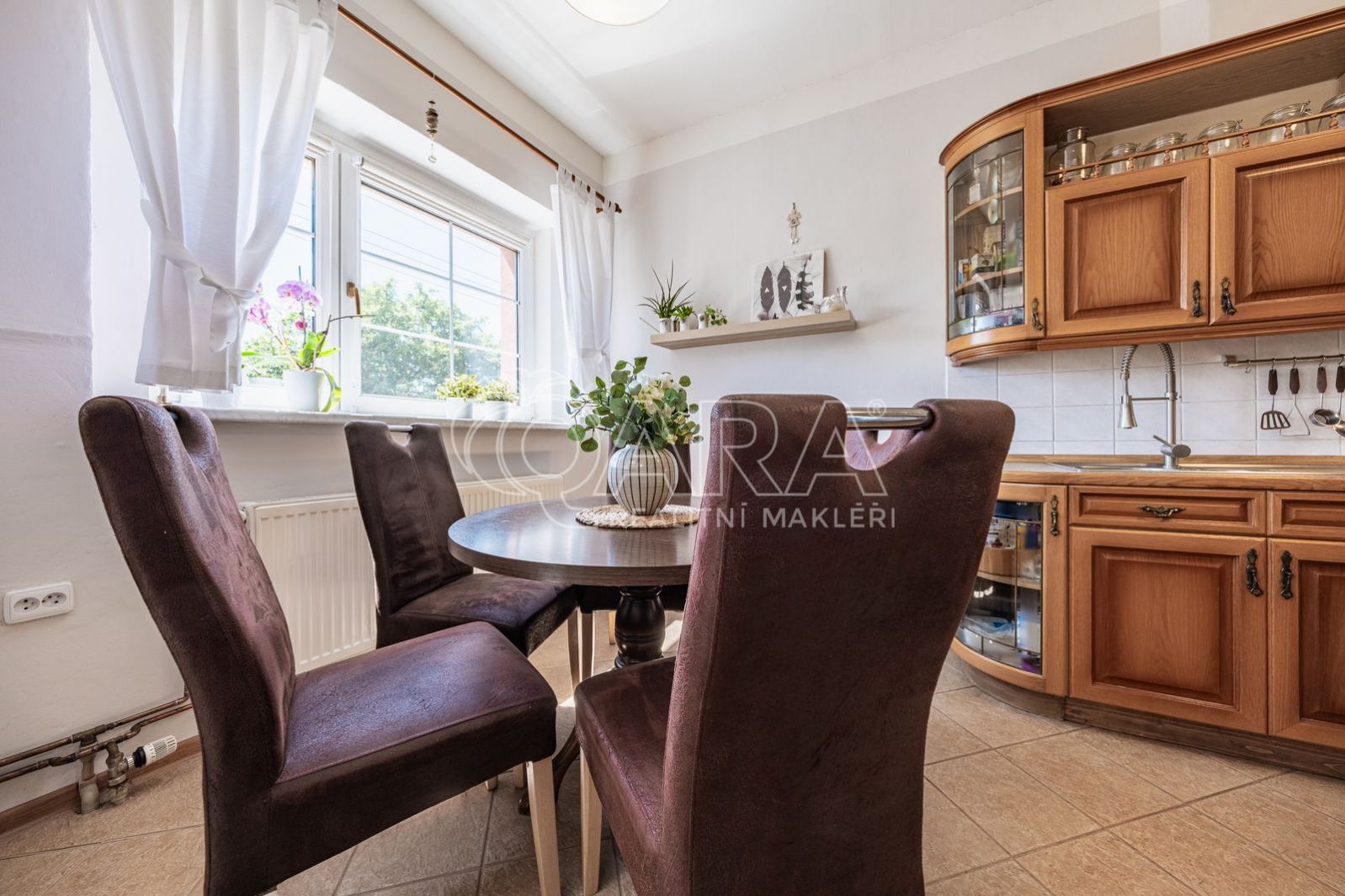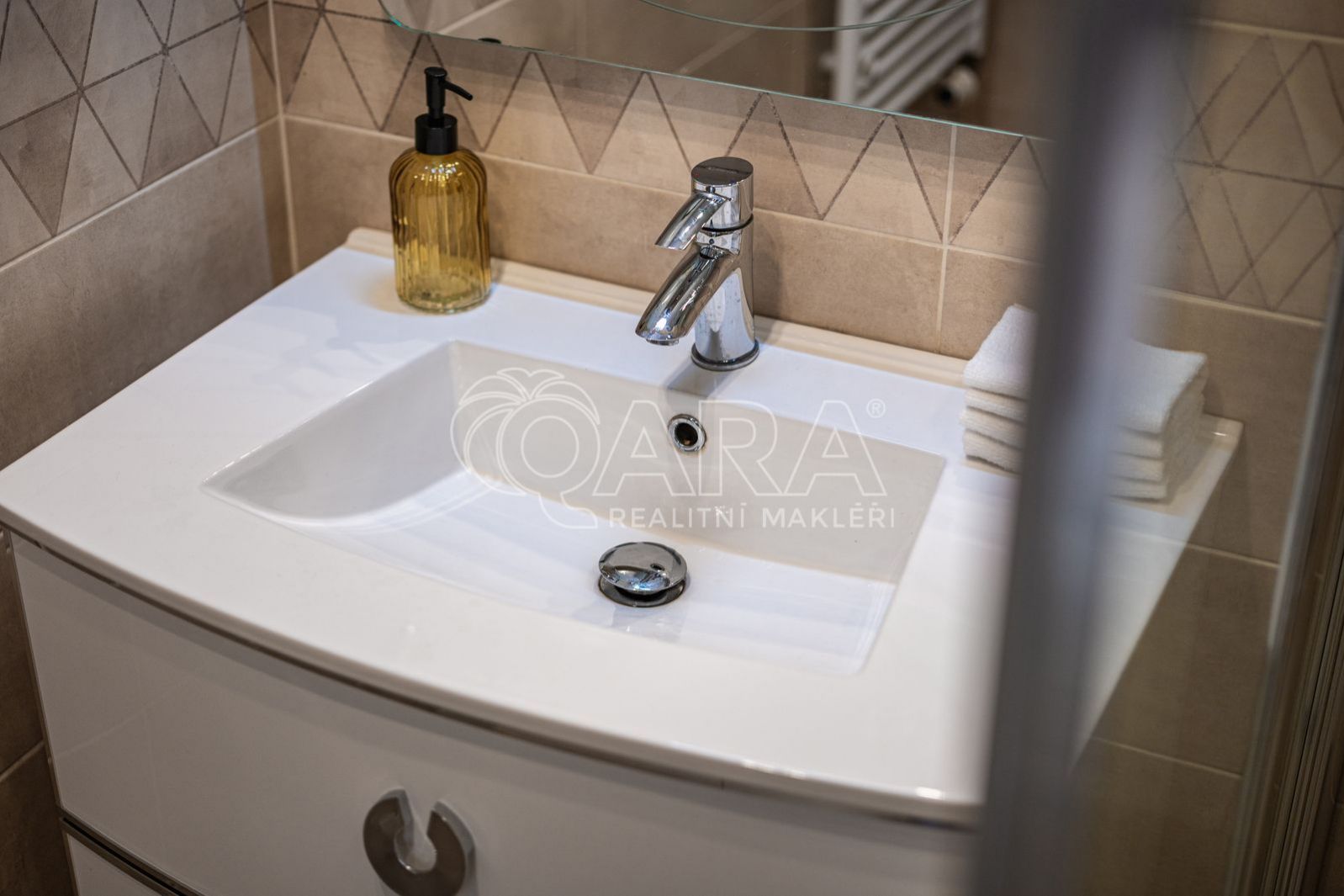 Do domu se vchází bývalým průjezdem, ze kterého je nyní uděláno prostorné garážové stání, takže pěkně suchou nožkou z domu do auta. Vjezd je opatřen novými elektrickými garážovými vraty se samostatným vstupem "pro pěší". Je zde umístěný Wallbox - nabíjecí stanice pro dvě elektroauta. Z průjezdu se vchází do přízemí domu nebo rovnou na zahradu. V přízemí je situován samostatný byt 1+kk, který je možno využít jako kancelář či máte-li odrostlejšího potomka a chce se cítit tak trochu samostatně, i zde je tato možnost, nebo pronájem. Byt je vybaven plně funkční kuchyňskou linkou, velkou a pohodlnou manželskou postelí s nočními stolky, komodou a TV, jídelním stolem a velkorysou šatní skříní na míru, prostornou koupelnou se sprchovým koutem a toaletou.