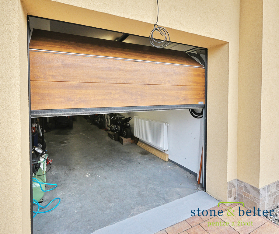 Průchozí garáž nabízí dostatečný prostor pro dvě osobní auta, sportovní vybavení (motocykl, kola) a praktickou dílnu. Přirozeným propojením domu se zahradou je velká zastřešená terasa, ideální pro rodinné posezení či odpočinek.