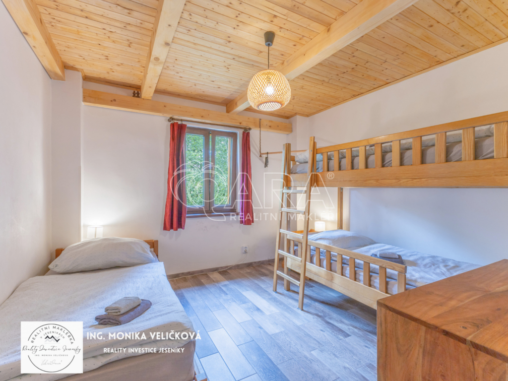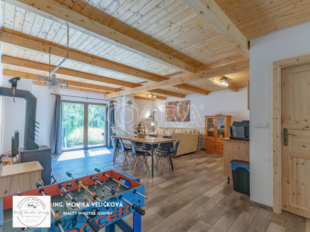 Chalupa stojí na klidném místě u lesa s vlastním pozemkem, přístupovou cestou a parkováním. Výborná dostupnost – Jeseník 10 min, Mikulovice 5 min, Ostrava 2 h, Olomouc 1,5 h.