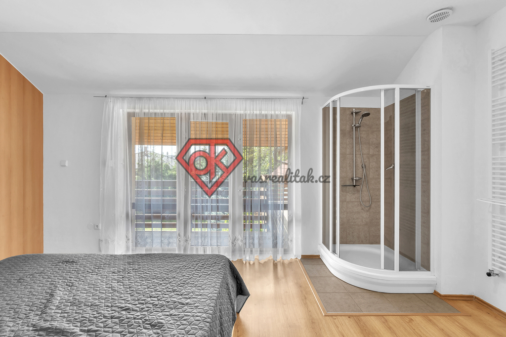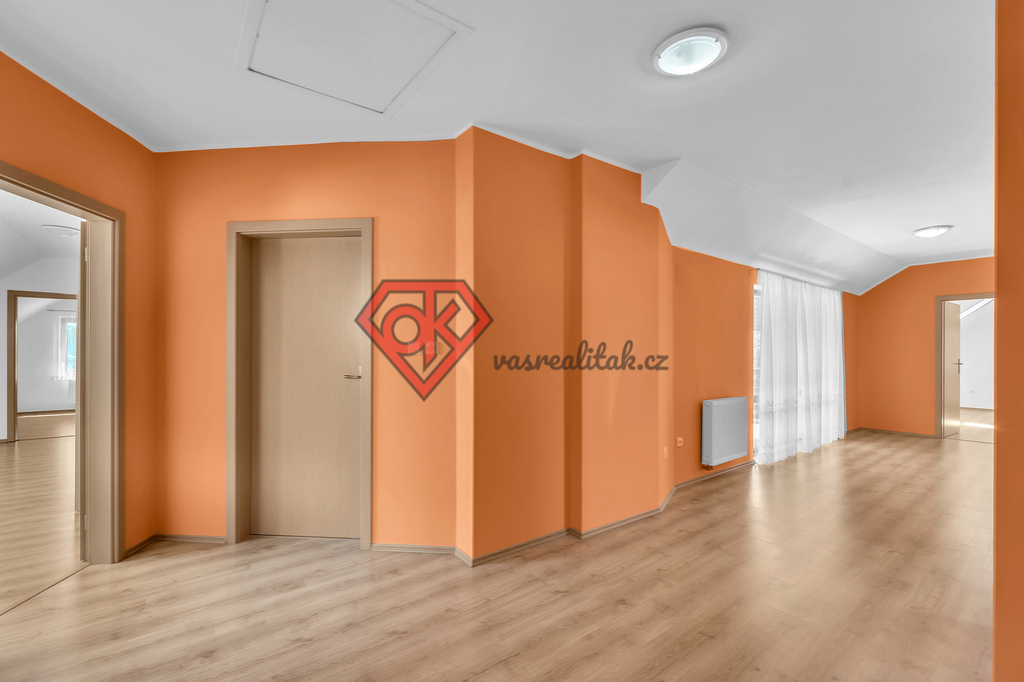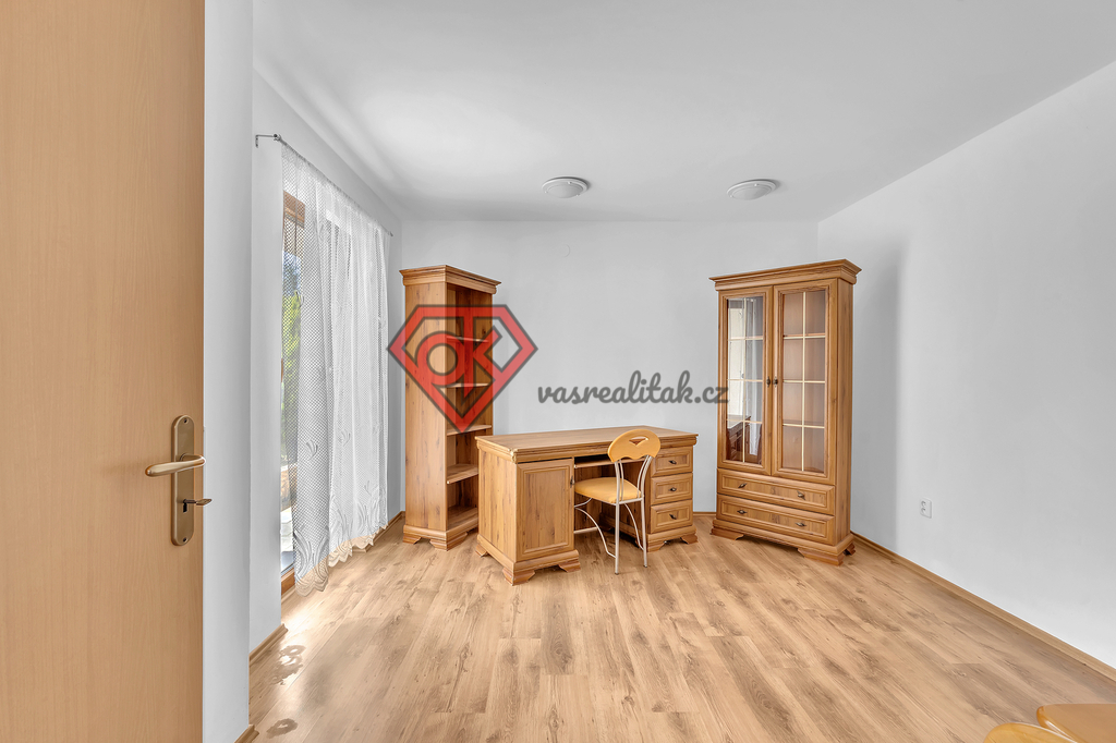 - 1.NP - vstupní chodba s vestavěnými skříněmi, toaleta, nádherný obrovský obývací pokoj s krbovými kamny, kuchyňským koutem, jídelnou a francouzským oknem do zahrady, kancelář