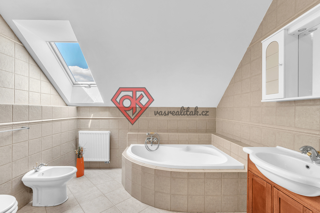 - 2.NP - hlavní ložnice, pokoj, pokoj se vstupem na balkon, pokoj s vlastní koupelnou, chodba, koupelna s rohovou vanou a toaletou, technická místnost, prádelna