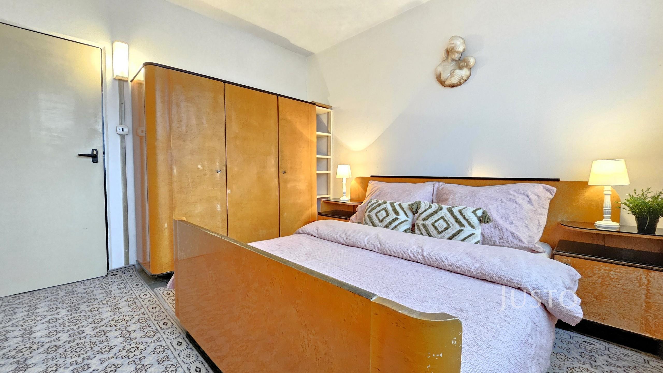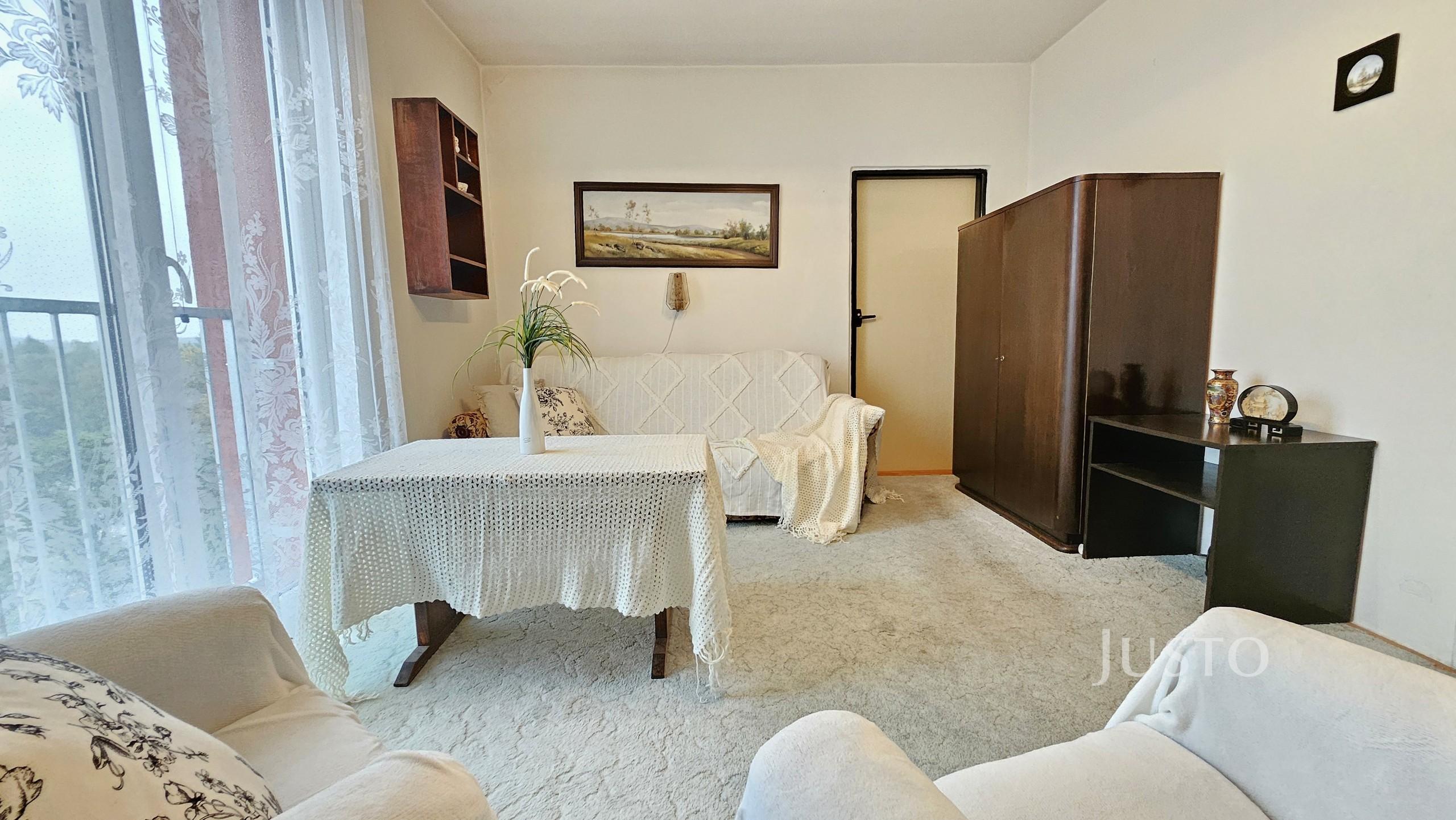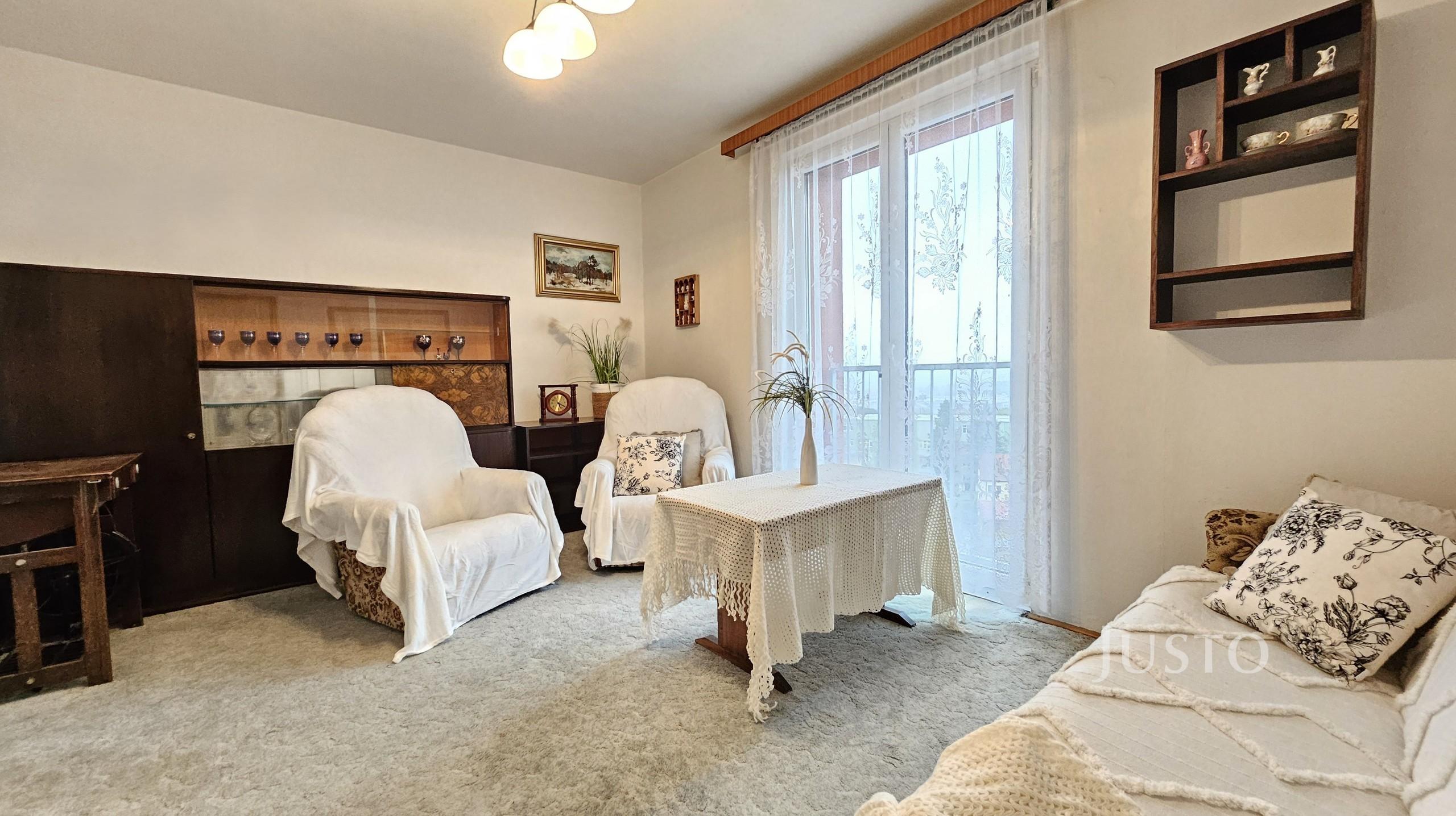 Dispozice bytu nabízí prostorný obývací pokoj (16,2 m²), dva samostatné pokoje (ložnice a dětský pokoj, každý 12,3 m²), kuchyň s jídelní částí (11,1 m²) a předsíň (5,6 m²) s praktickým úložným prostorem/komorou (2,1 m²). Byt je částečně vybaven a připraven k nastěhování či případné modernizaci dle vlastních představ. K bytu náleží sklep, což oceníte pro další možnosti uskladnění.