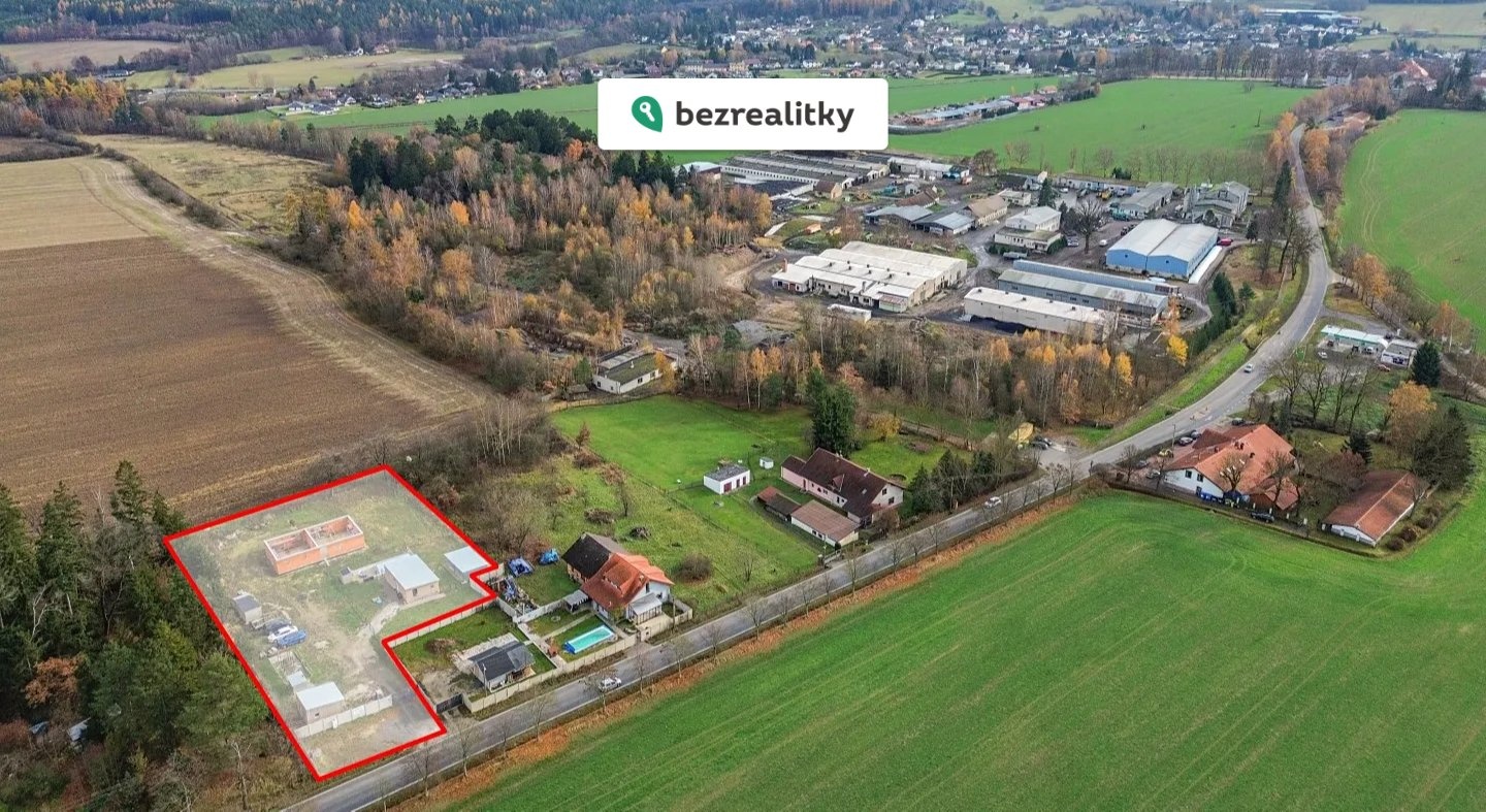 Exkluzivní stavební pozemek 3 208 m² s rozestavěným RD, projektovou dokumentací, dřevostavbou 2+kk a bazénem – u Mirošova