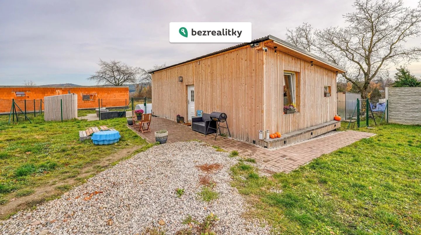 Další velkou výhodou je dřevostavba o ploše 52 m², vedená jako přípravné stanoviště pro stavbu rodinného domu. Objekt je dispozičně řešen jako 2+kk s terasou o velikosti 9 m² a je napojen na jímku o objemu 6 m³. Stavba může sloužit jako dočasné bydlení během dokončení hlavního domu, rekreační objekt nebo například investice k pronájmu.