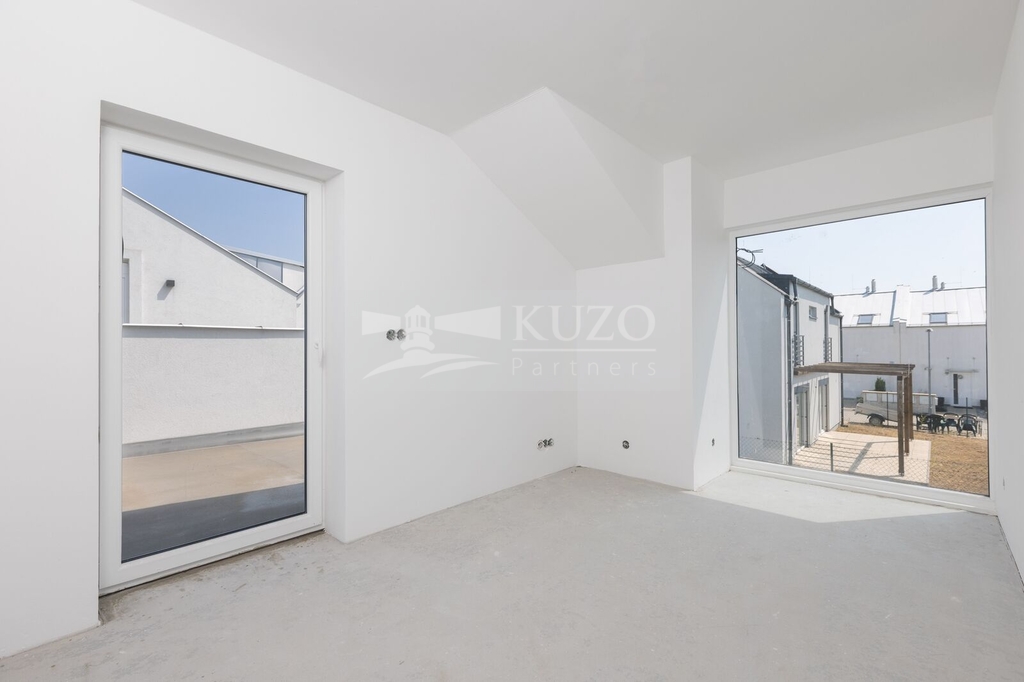 Za domem je navíc vstupem z obývacího pokoje k dispozici venkovní terasa. Celková výměra pozemku, který náleží k domu je 202 m². Z toho je zastavěná plocha 103 m².