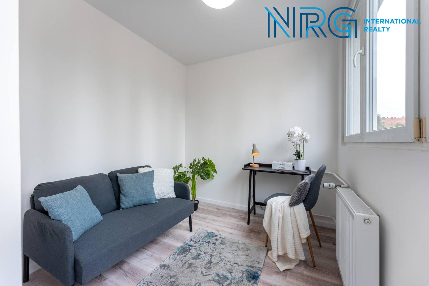 Dispozice bytu nabízí obývací prostor s kuchyňským koutem, dvě prostorné ložnice a menší pokoj, ideální jako pracovna, dětský pokoj nebo šatna.