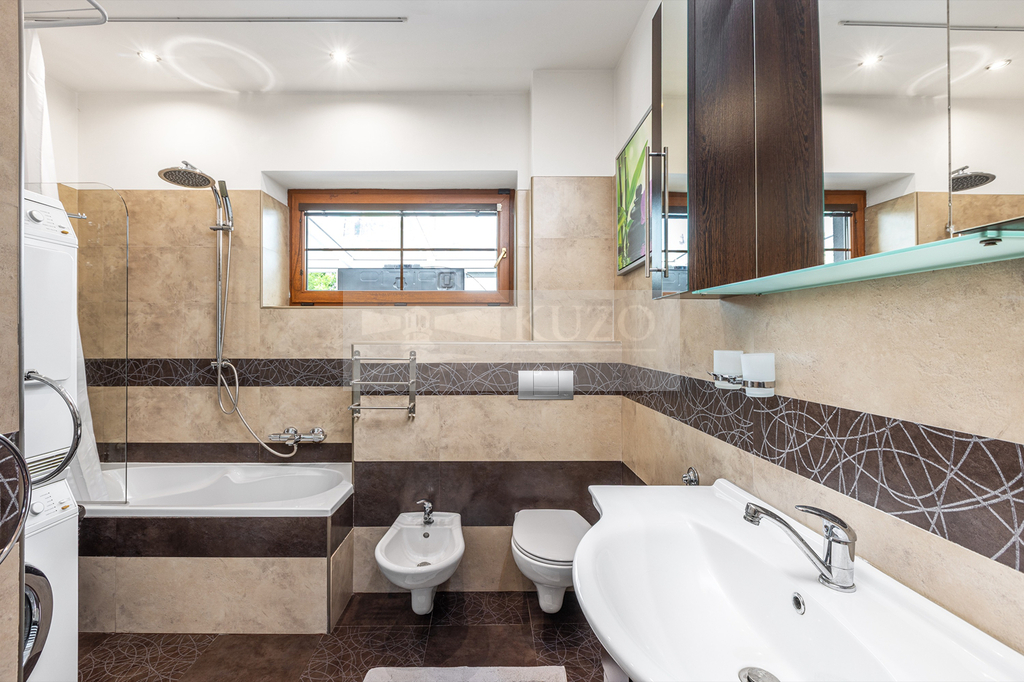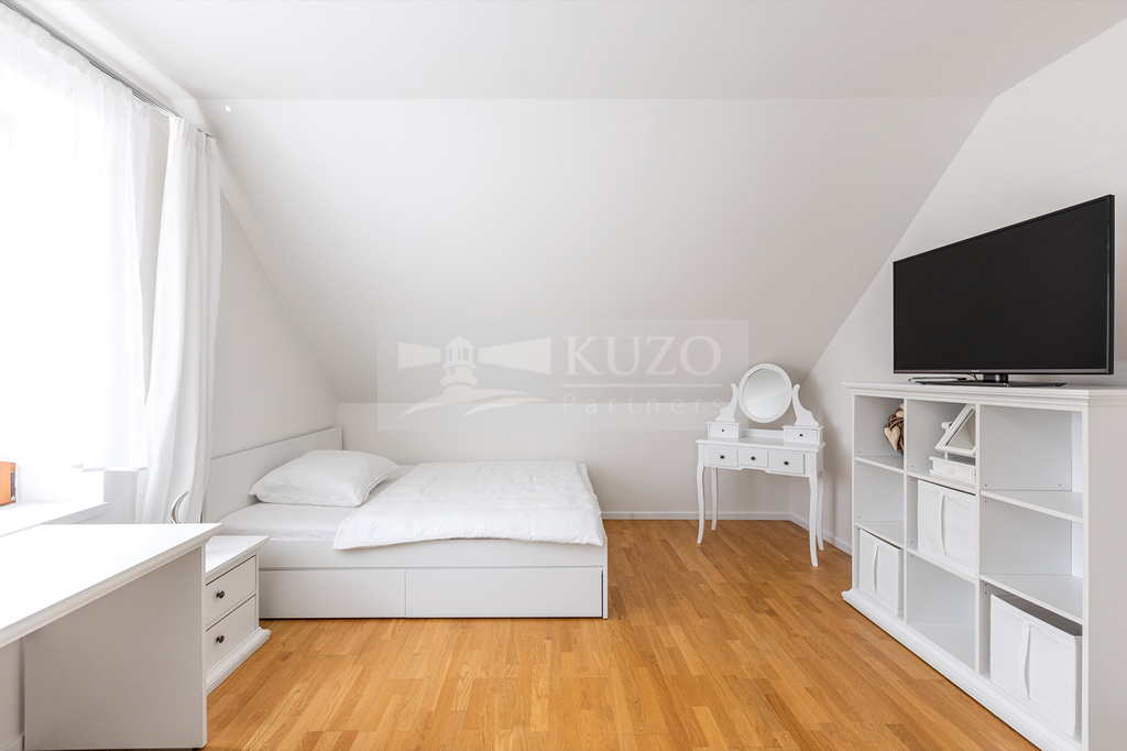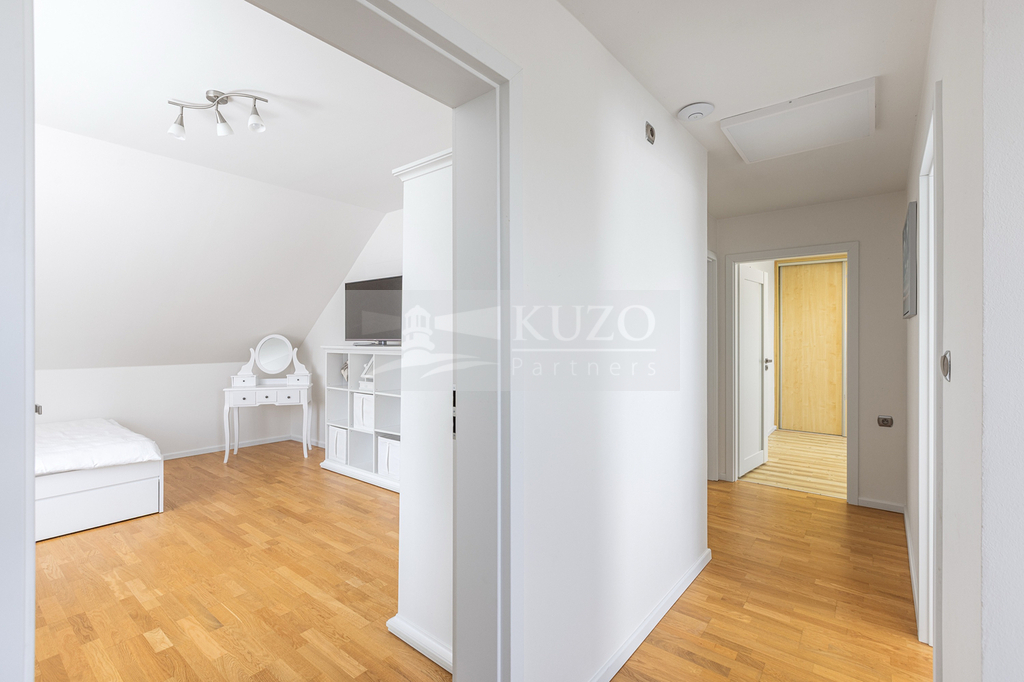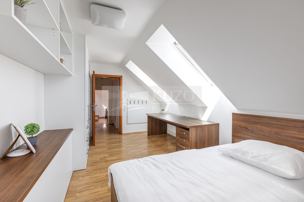 Na prostorný obývací pokoj s kuchyňským koutem plynule navazuje vytápěná zimní zahrada, která nabízí ideální prostor pro odpočinek během celého roku – ať už si užíváte ranní kávu, nebo večerní posezení s výhledem do zahrady.